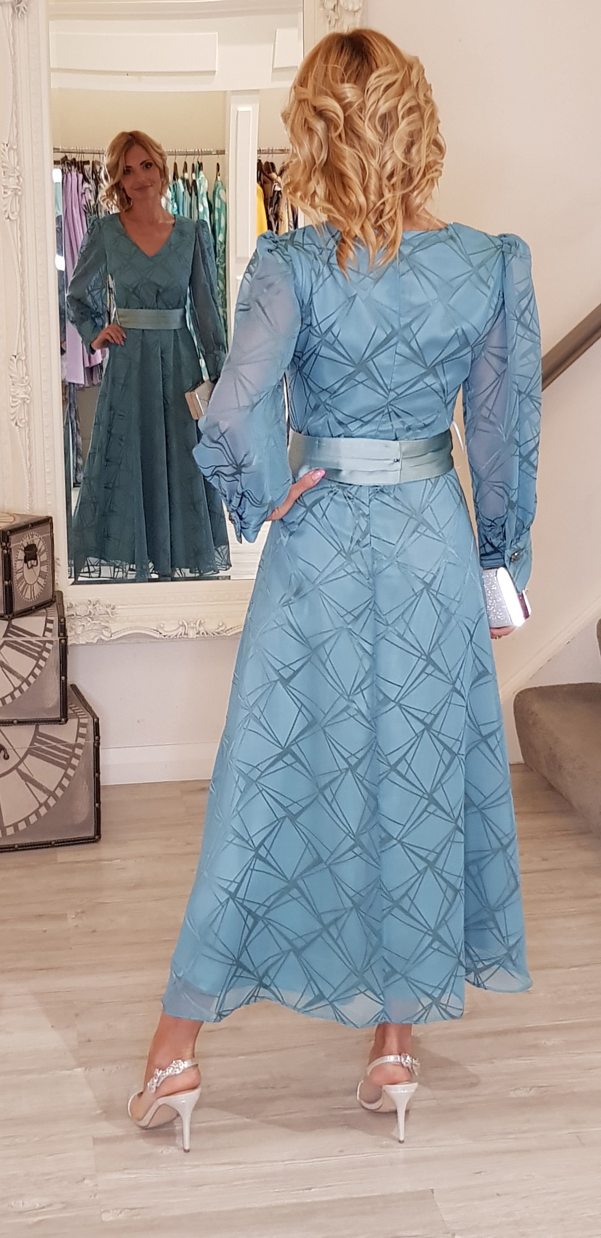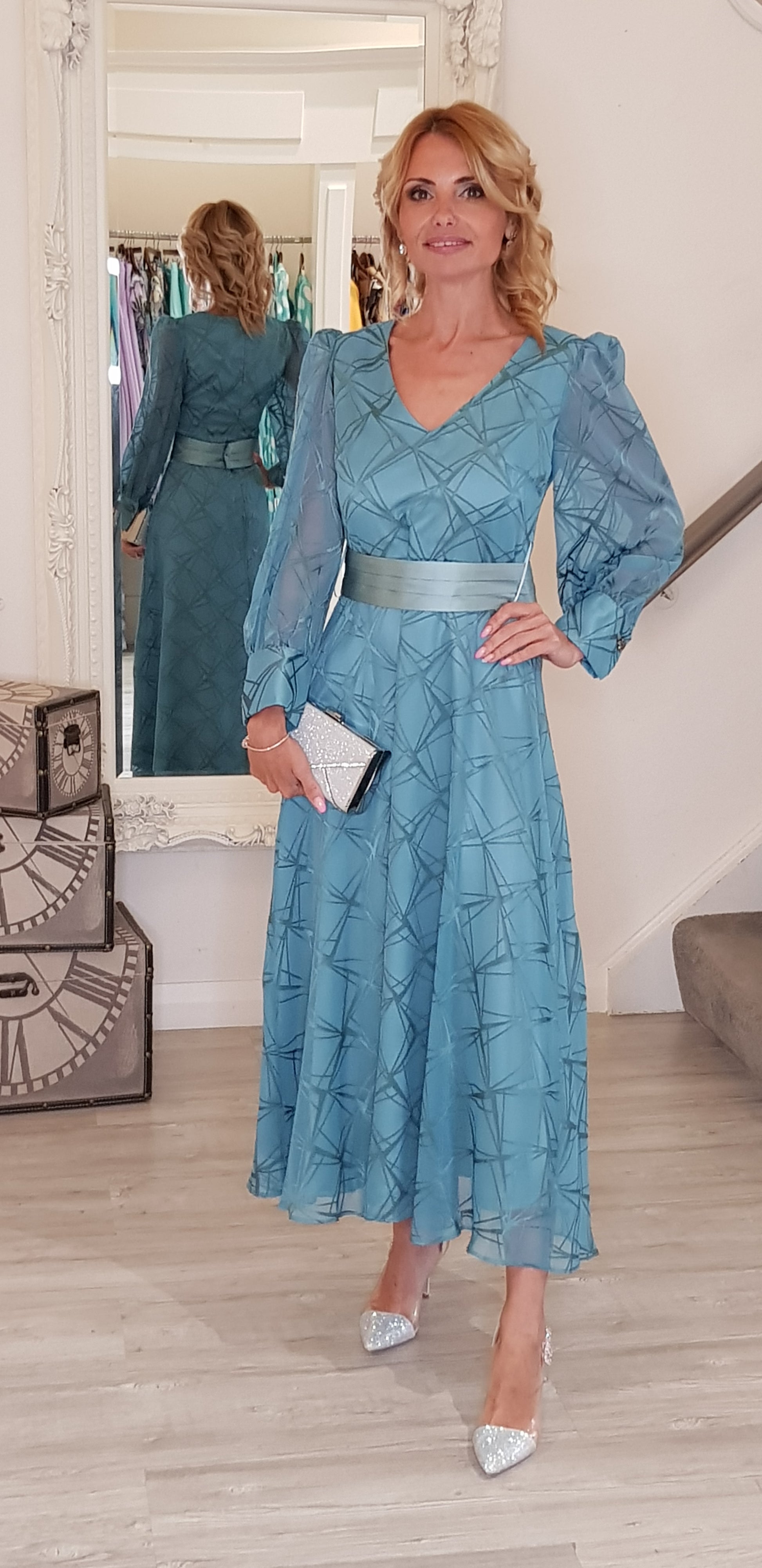 This Aqua Green Midi Dress features a flattering V-neck and long sleeves with button details on the cuff. The matching belt accentuates your waist, while the back zip provides a seamless fit. Its geometric print stands out, and the lining ensures comfort. Perfect for a polished and stylish look.