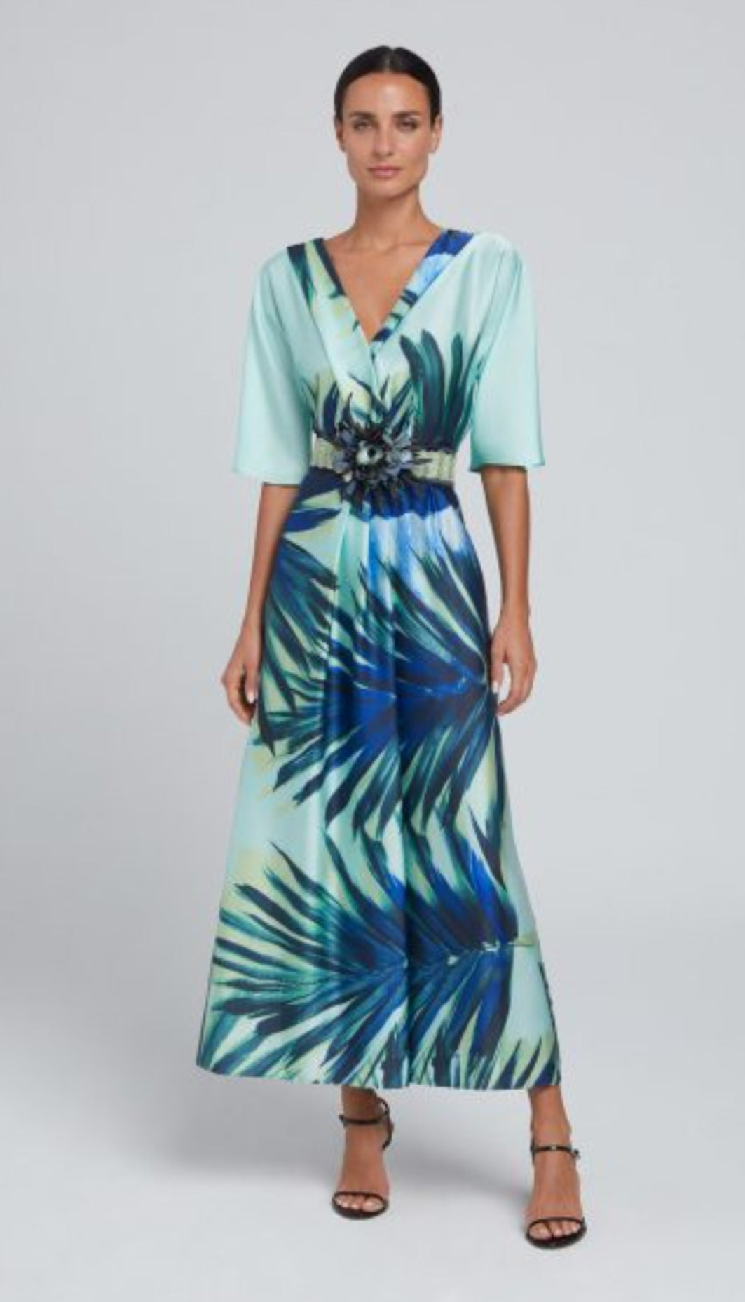 Elevate your style with our Aqua, Lime, Navy Palm Dress. With its v-neck, elastic waist, detachable belt, and side zipper, this dress is both comfortable and effortlessly chic. Made of 97% polyester and 3% elastin, it's the perfect addition to your wardrobe for any occasion.