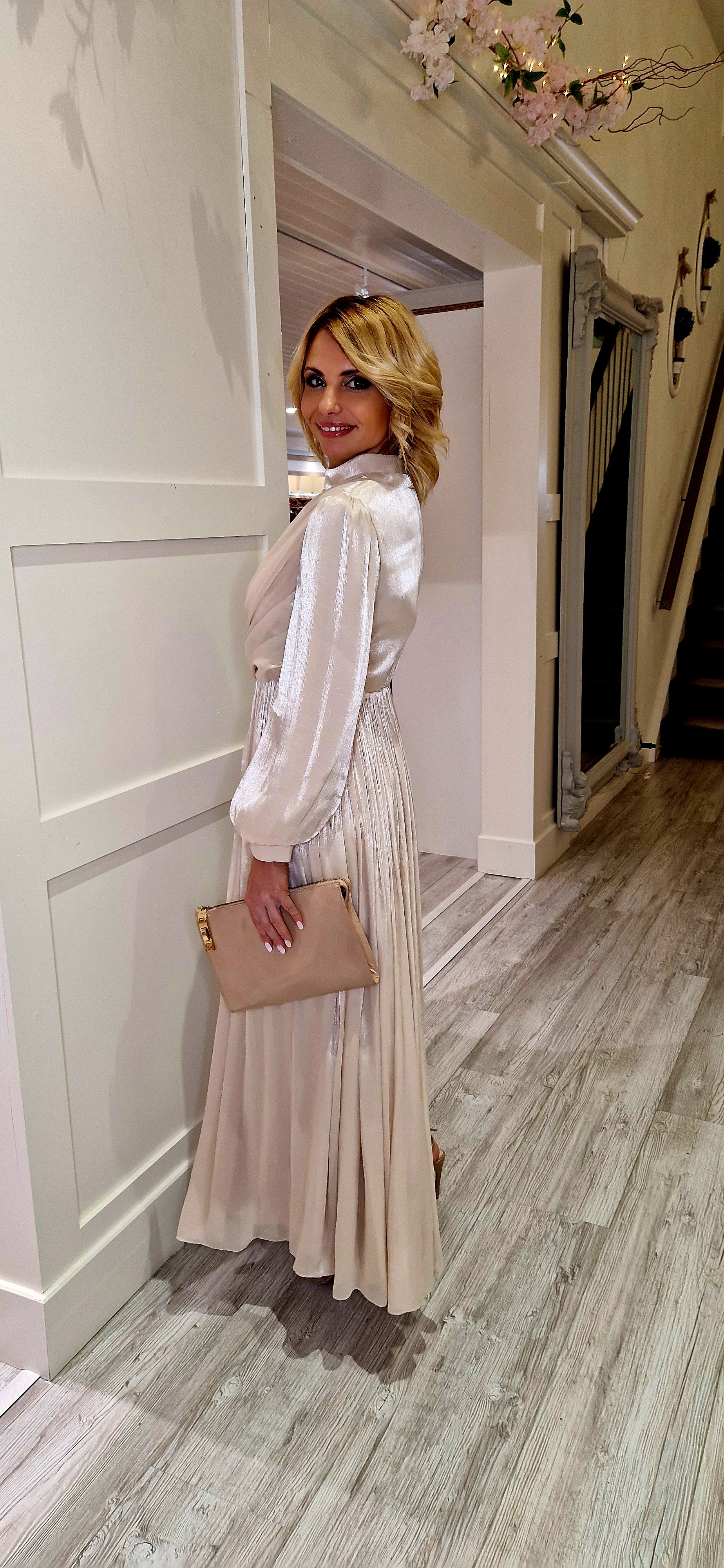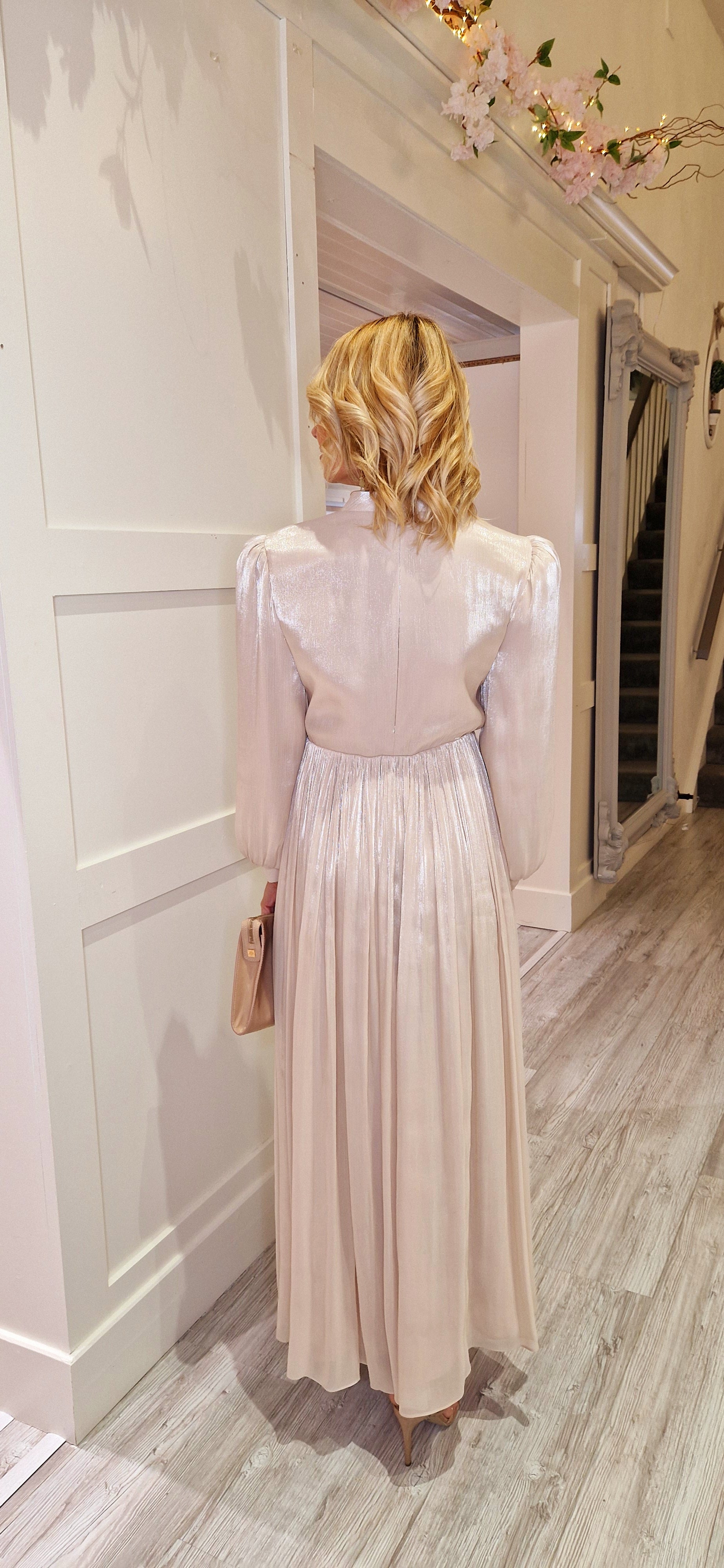 Effortlessly elegant, the Beige Shimmer Dress is expertly crafted from 100% polyester for a comfortable and flattering fit. Featuring a round neck, long sleeves, and a zip closure on the back, this midi dress is perfect for any occasion. The elastic waist and full lining add extra convenience, and it's even machine washable for easy maintenance.