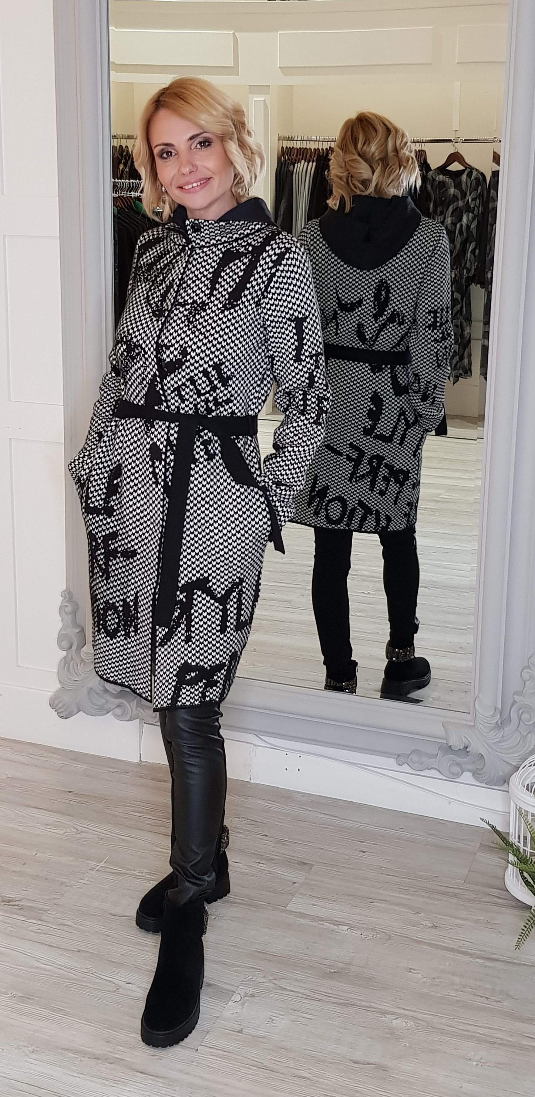 Expertly crafted for both style and functionality, this Black And Cream Knit Cardigan boasts a high neck with a detachable hood, perfect for chilly days. The long sleeves and sparkly detail add a touch of glamour, while the letter print and two side pockets provide convenience. Complete the look with the matching belt.