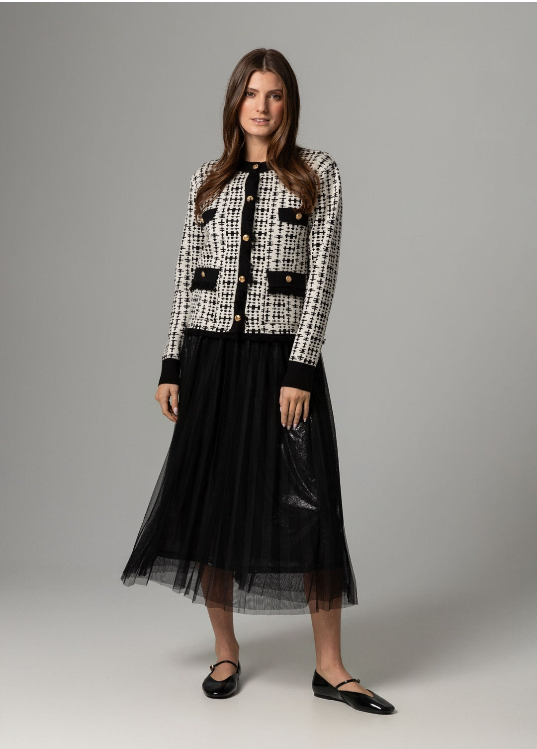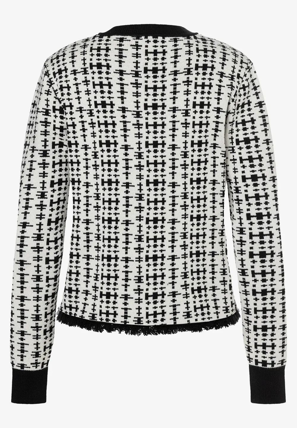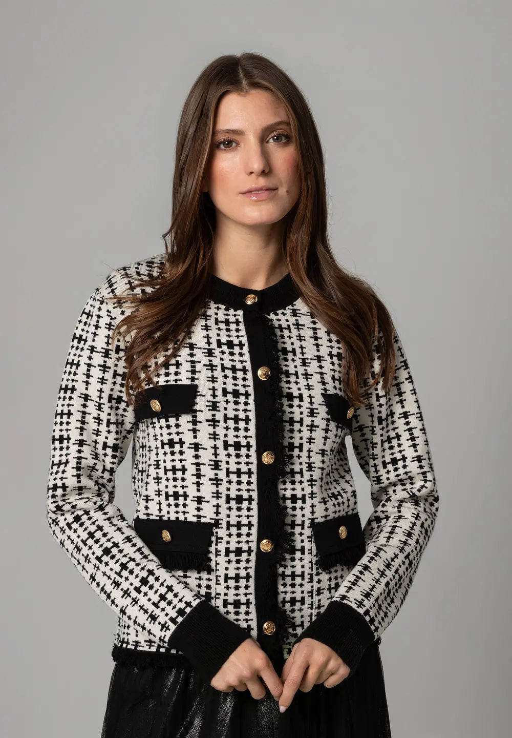 This stylish Black And Cream Knit Cardigan features a round neck, front gold buttons, and a geometric pattern for a modern look. The long sleeves with elastic cuffs add comfort and versatility, while the soft fabric ensures a cozy feel. A must-have addition to any wardrobe.