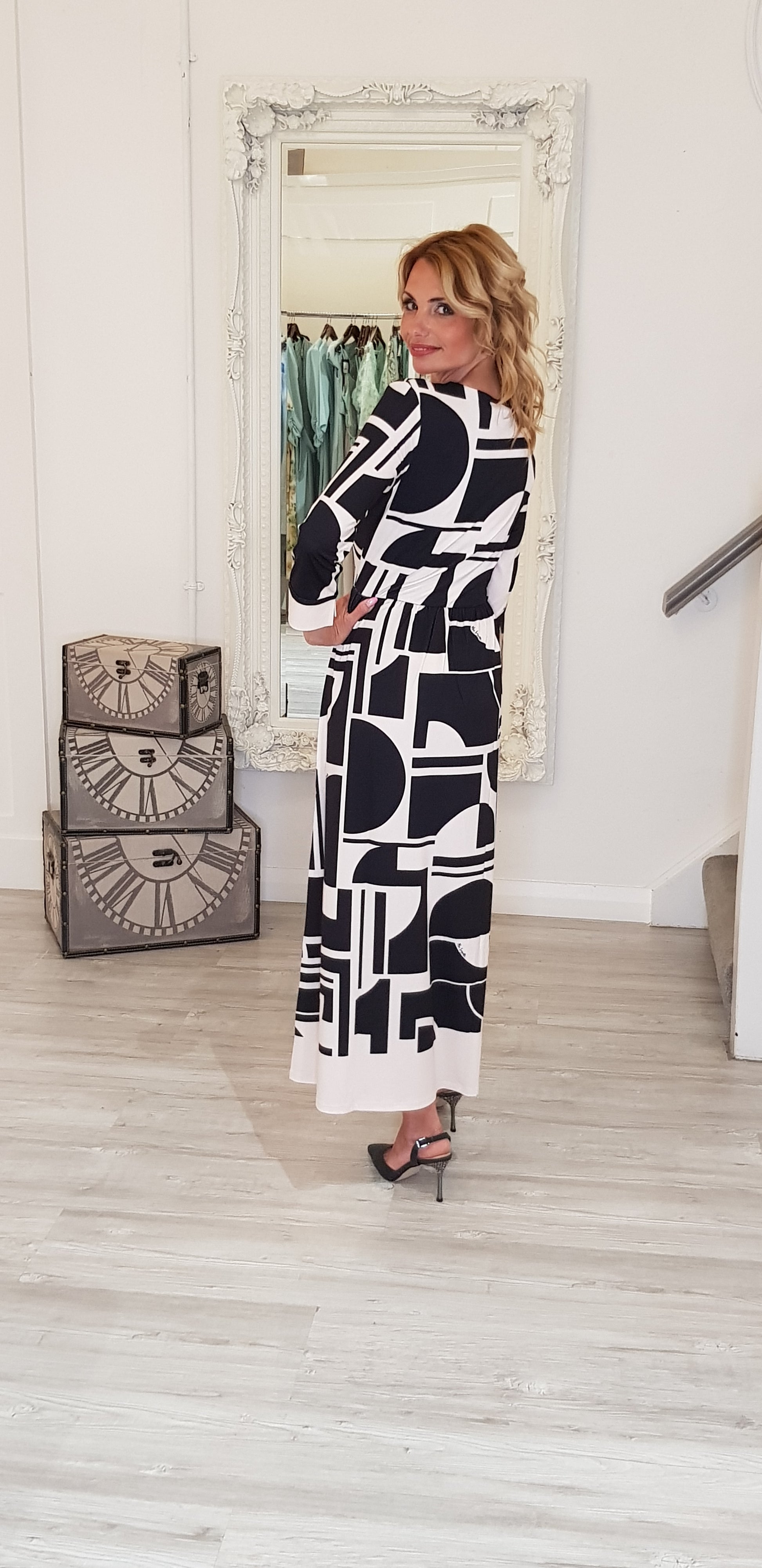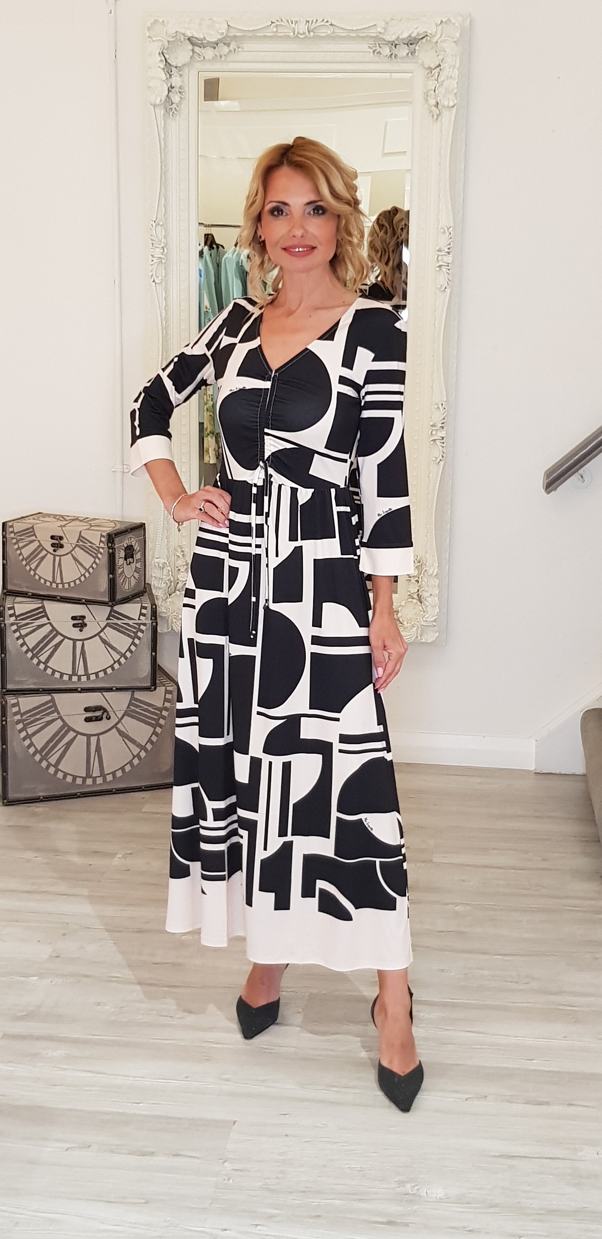 This black and cream printed midi dress features a flattering V-neck with drawstring detail and 3/4 sleeves. The loose fit skirt is perfect for all body types and is adorned with a lovely geometric print. Complete the look with our black knit cardigan. Effortlessly stylish and versatile.
