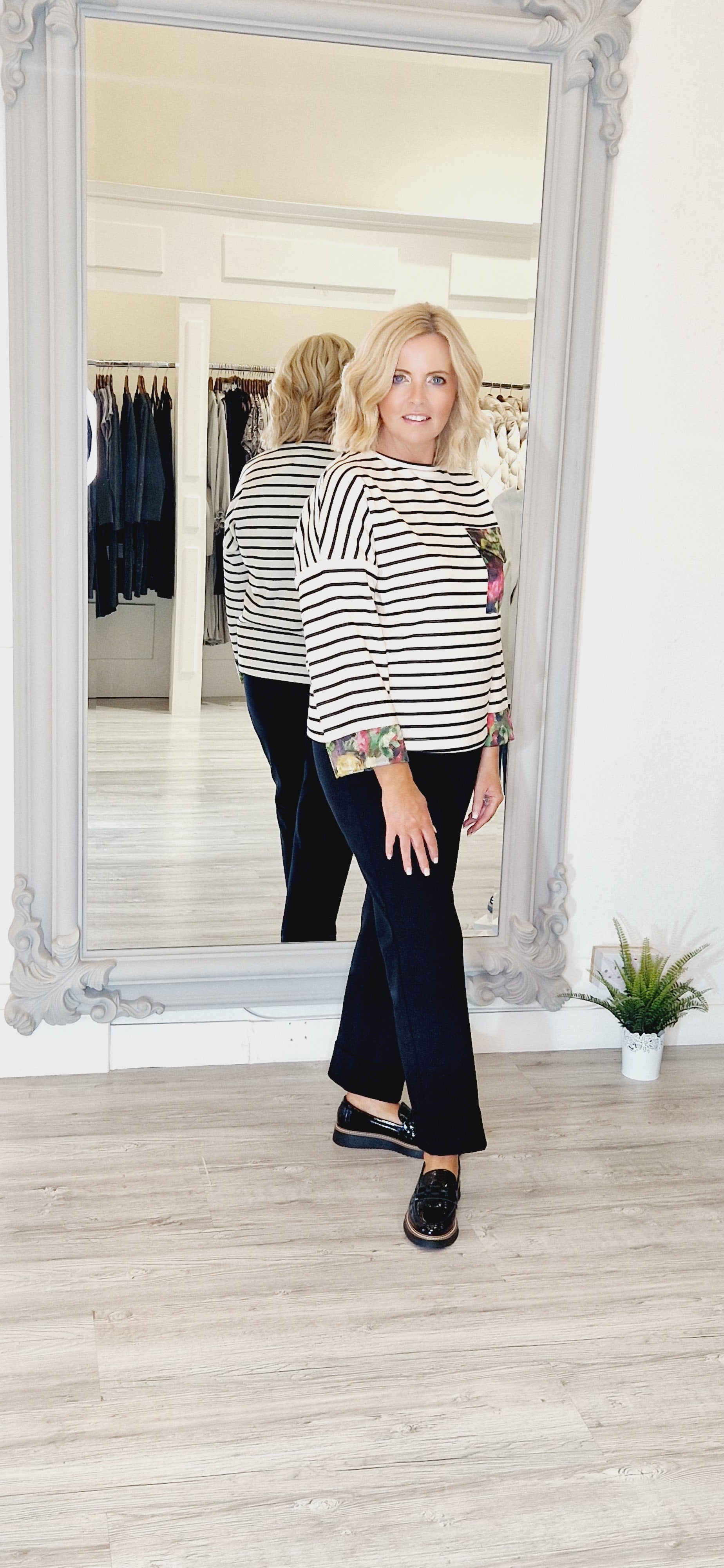 This black and cream top with strips is designed with a round neck and 3/4 sleeves featuring a satin printed cuff. It also includes a front printed pocket and boasts an oversize fit for extra comfort. Perfect for all-day wear, this top adds a touch of style and functionality to any outfit.