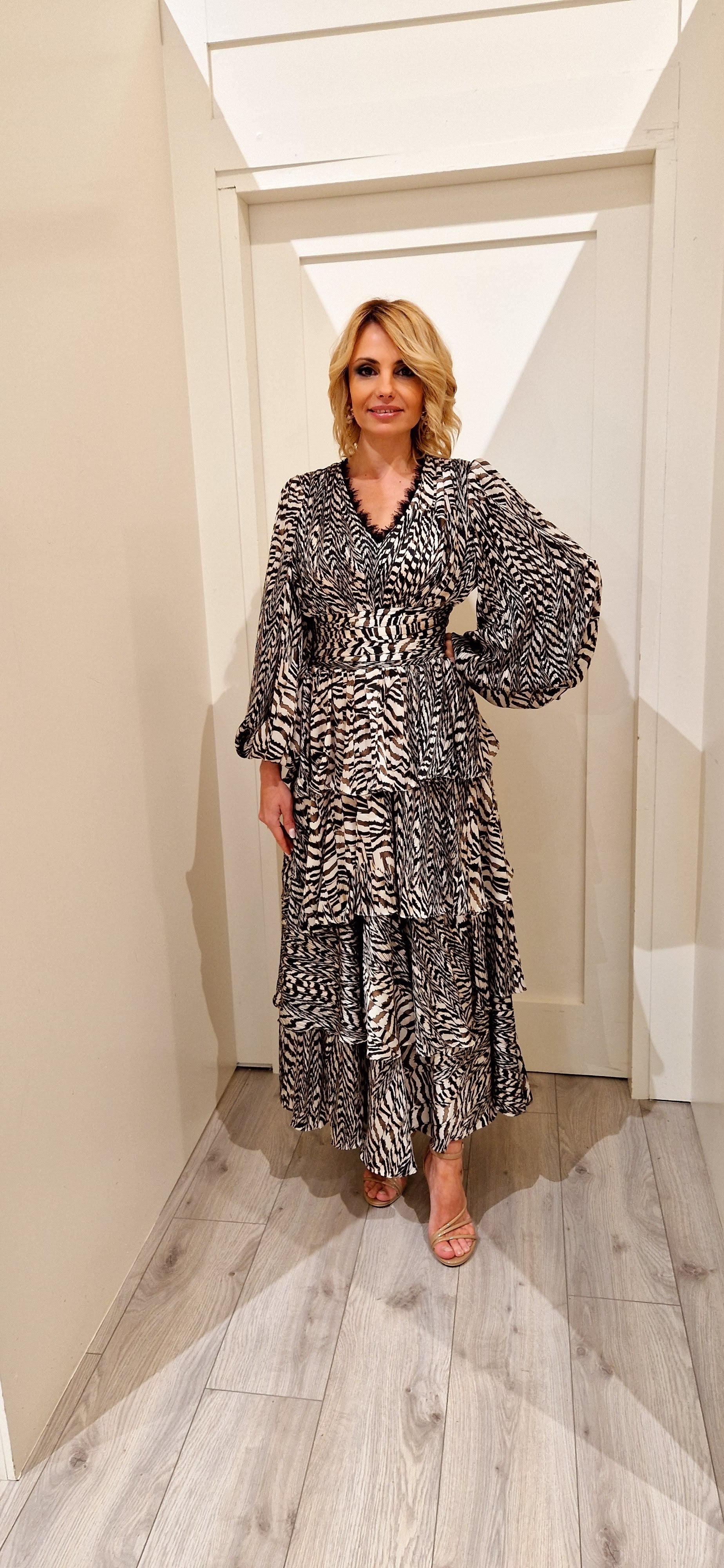 Achieve a chic, sophisticated look with our Black and Cream Zebra Print Dress. Featuring a flattering Vneck, elongating cup sleeves, and a waist-defining elastic band, this dress offers comfort and style. The attached belt allows for a customizable fit, while the full lining ensures a smooth silhouette. Made from 100% polyester, this dress is easy to care for with a simple 30-degree wash. Elevate your wardrobe with this statement piece.