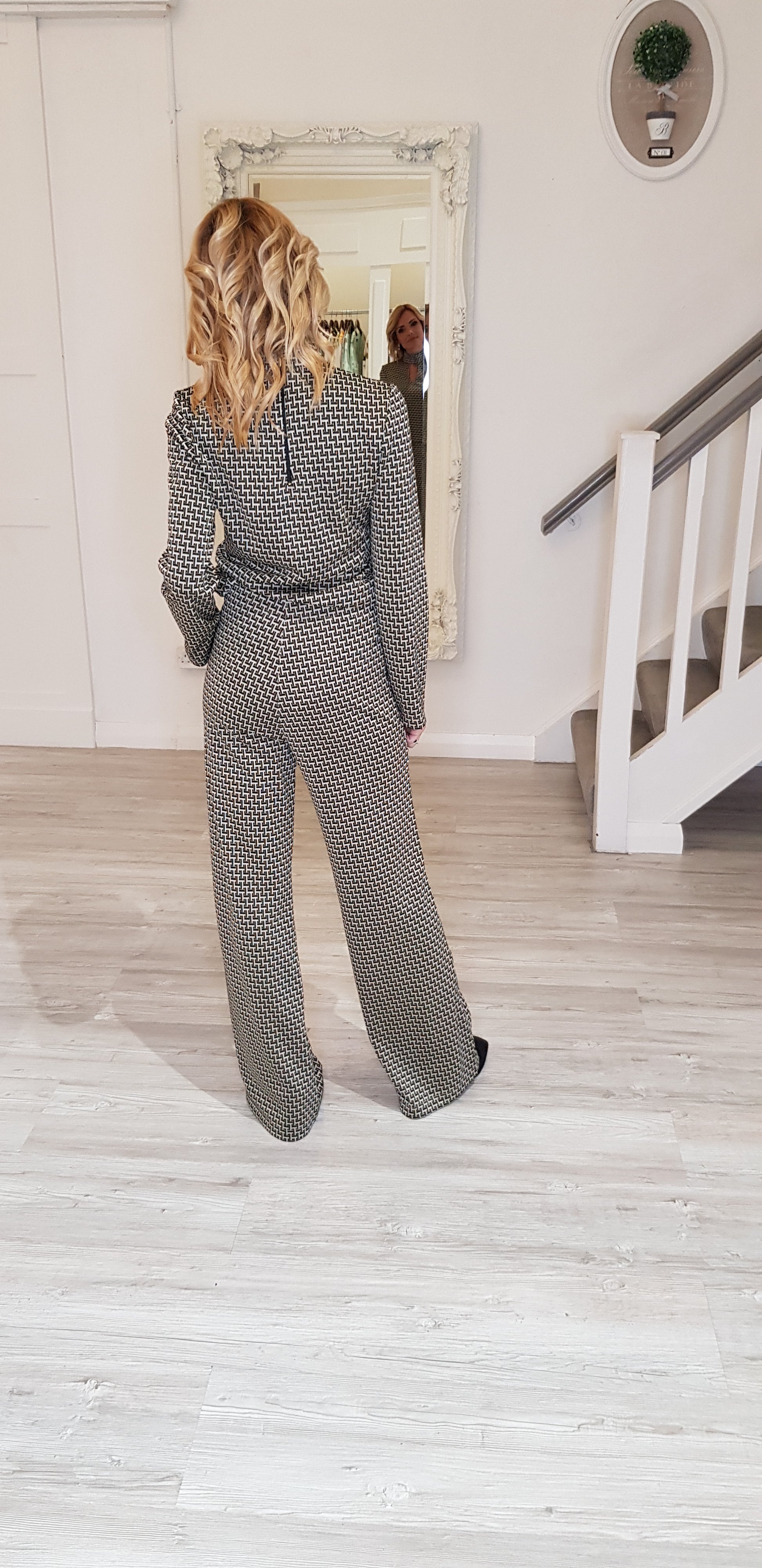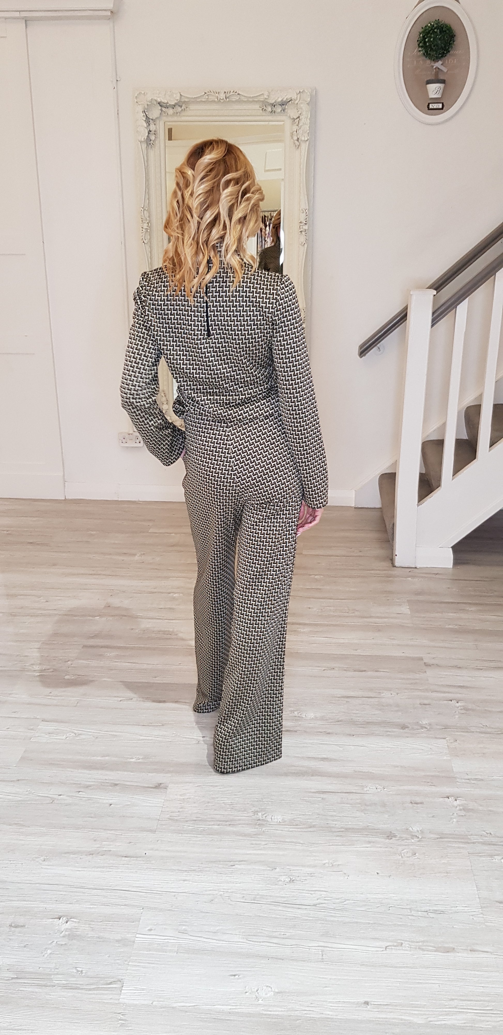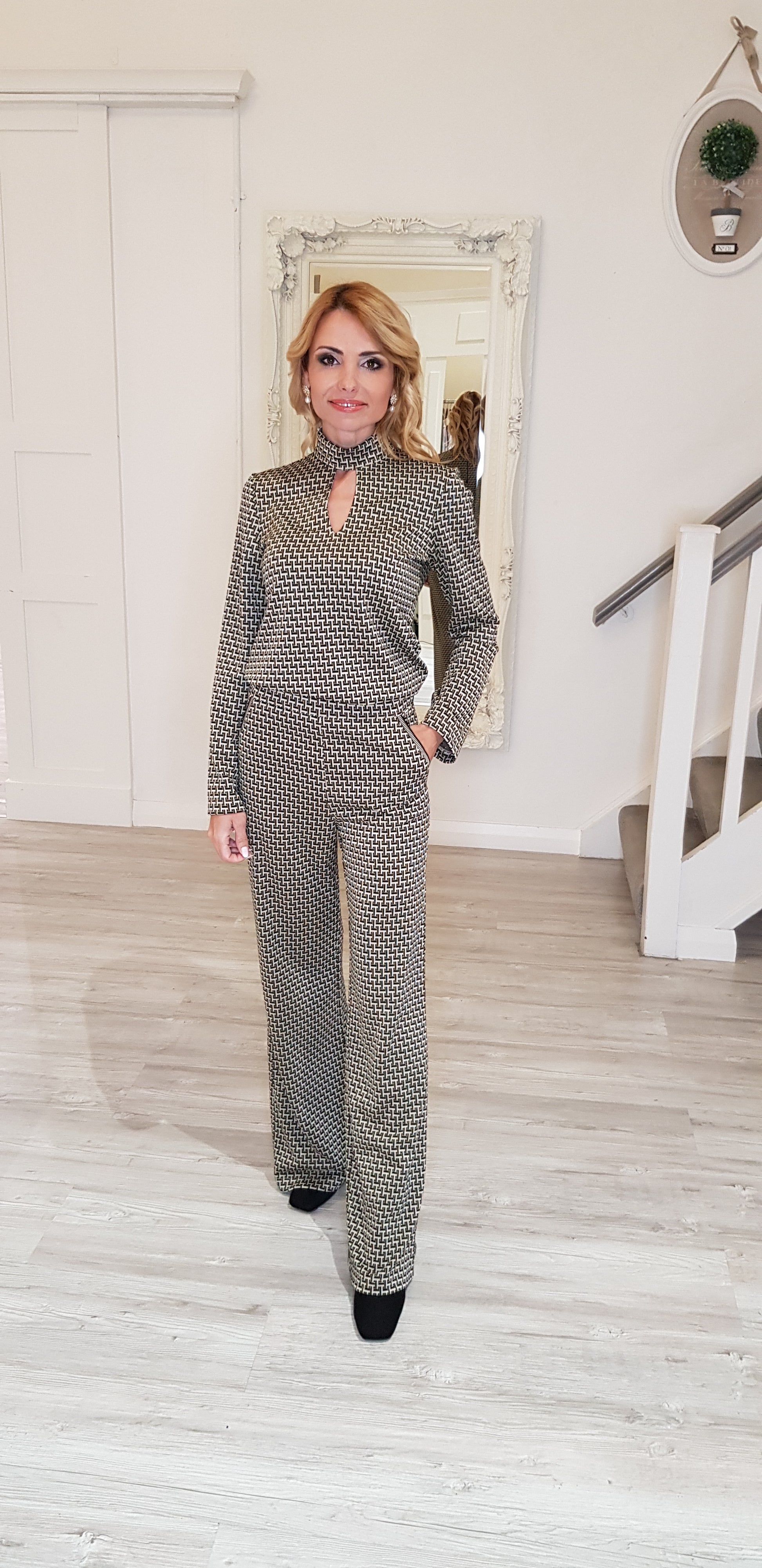 This black and gold printed top features a high neck with a front slit and a back zip for easy wear. The long sleeves and elastic fit provide both style and comfort. The lovely geometric print in black, gold, and cream adds a touch of sophistication. Pair it with our matching trousers and poncho for a complete and stylish look.