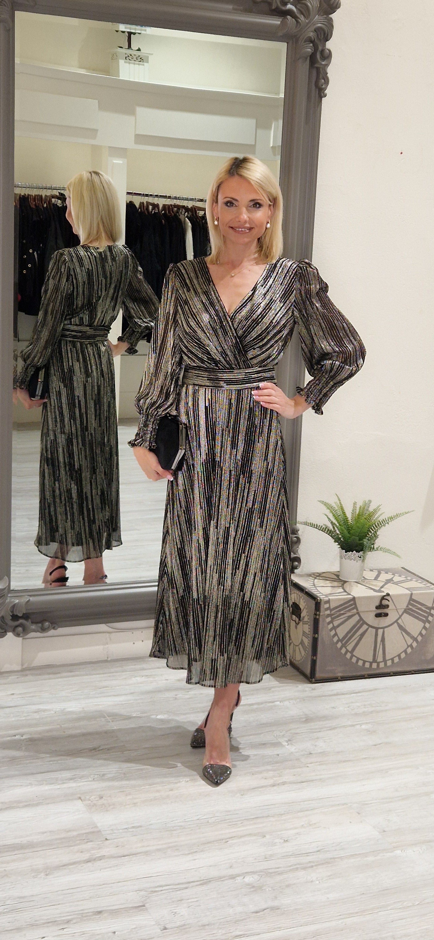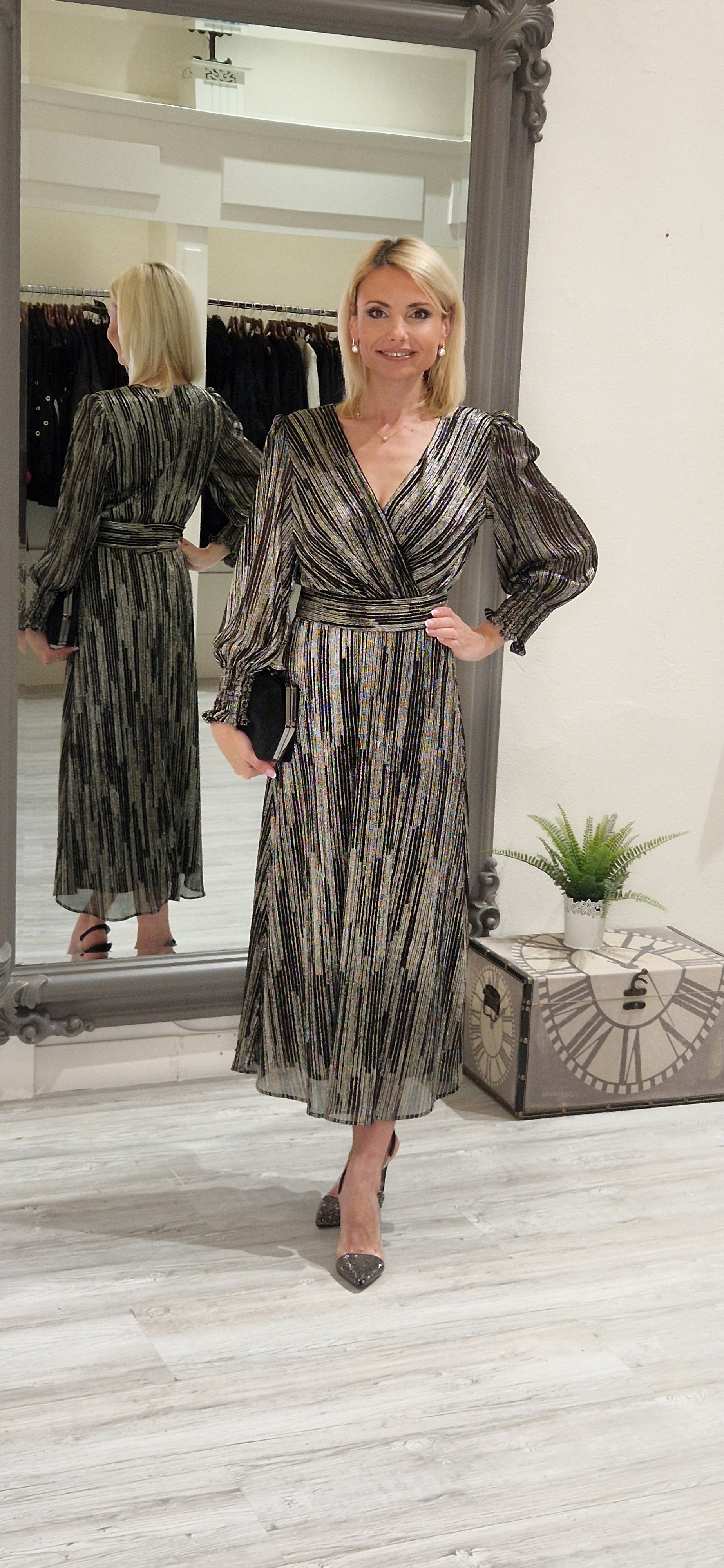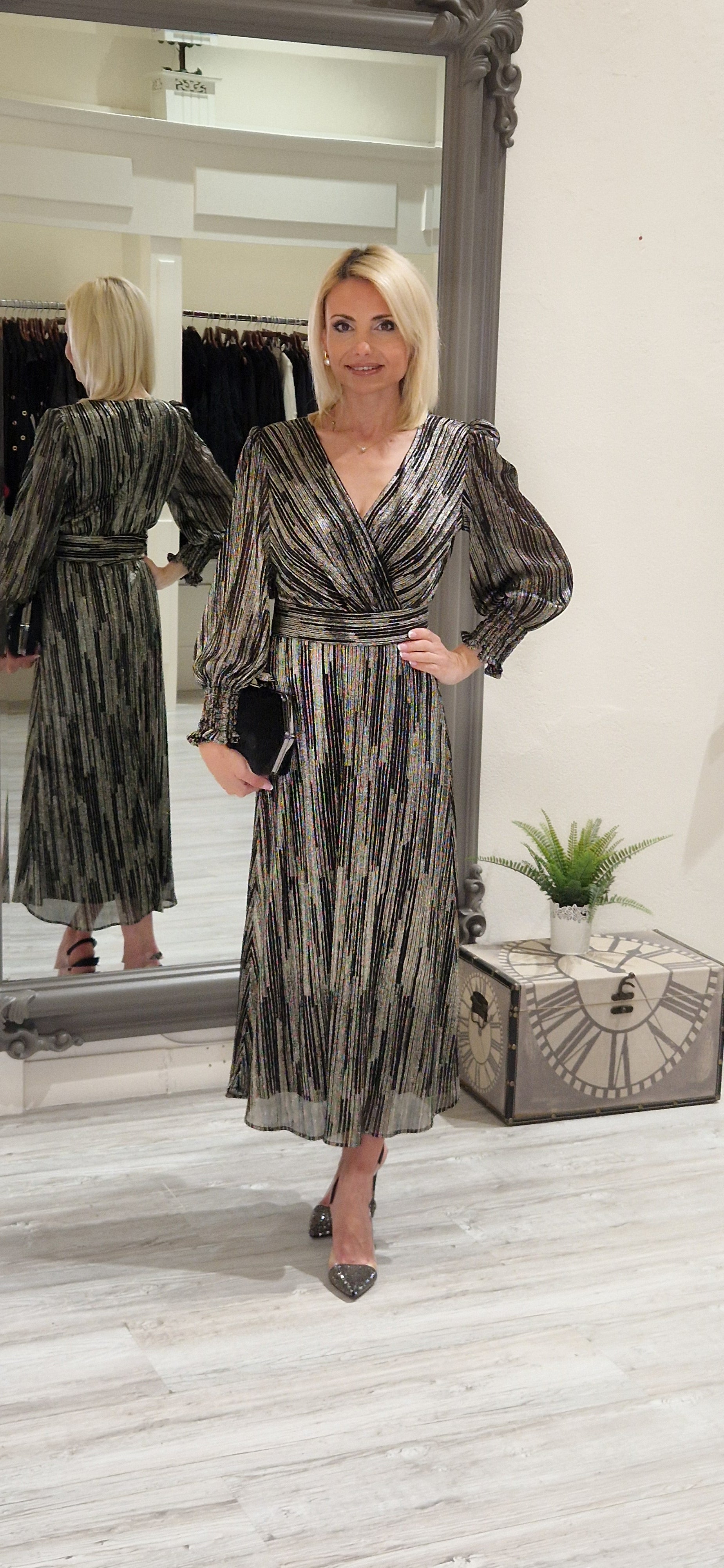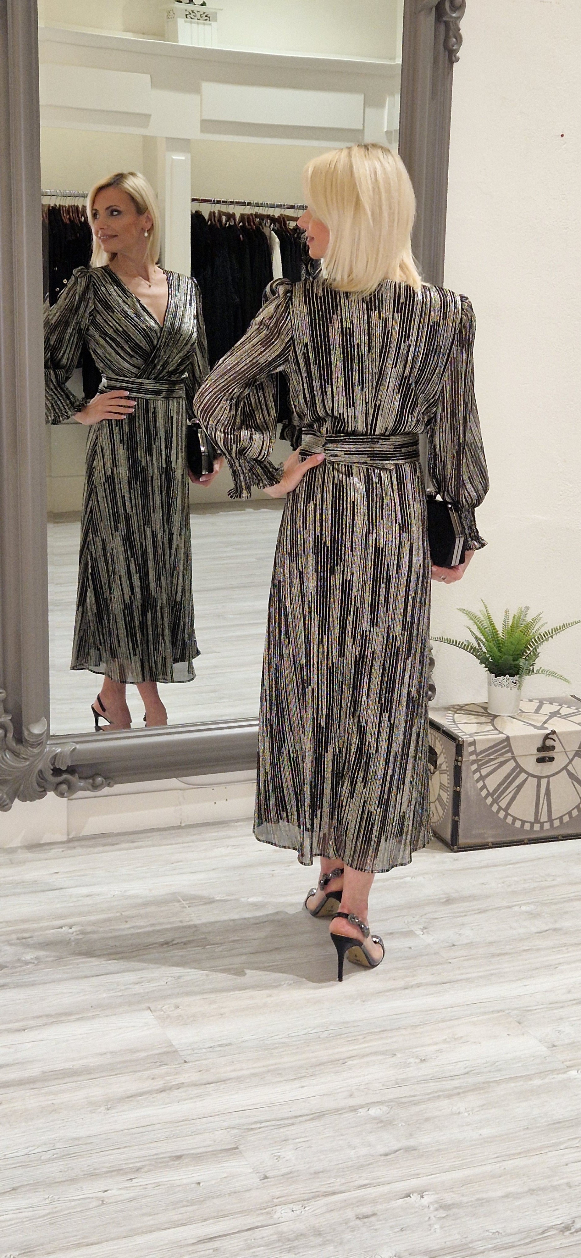 This black and gold shimmer dress features long sleeves with elasticated cuffs and a flattering V-neck. It includes a detachable belt to define your waist and a discreet zip closure at the back for a streamlined fit. Fully lined and crafted from a delicate blend of 77% polyamide and 23% metallic fibers, it requires gentle washing to maintain its luxurious shimmer and shape. Ideal for elegant occasions, this dress combines comfort with sophisticated style.