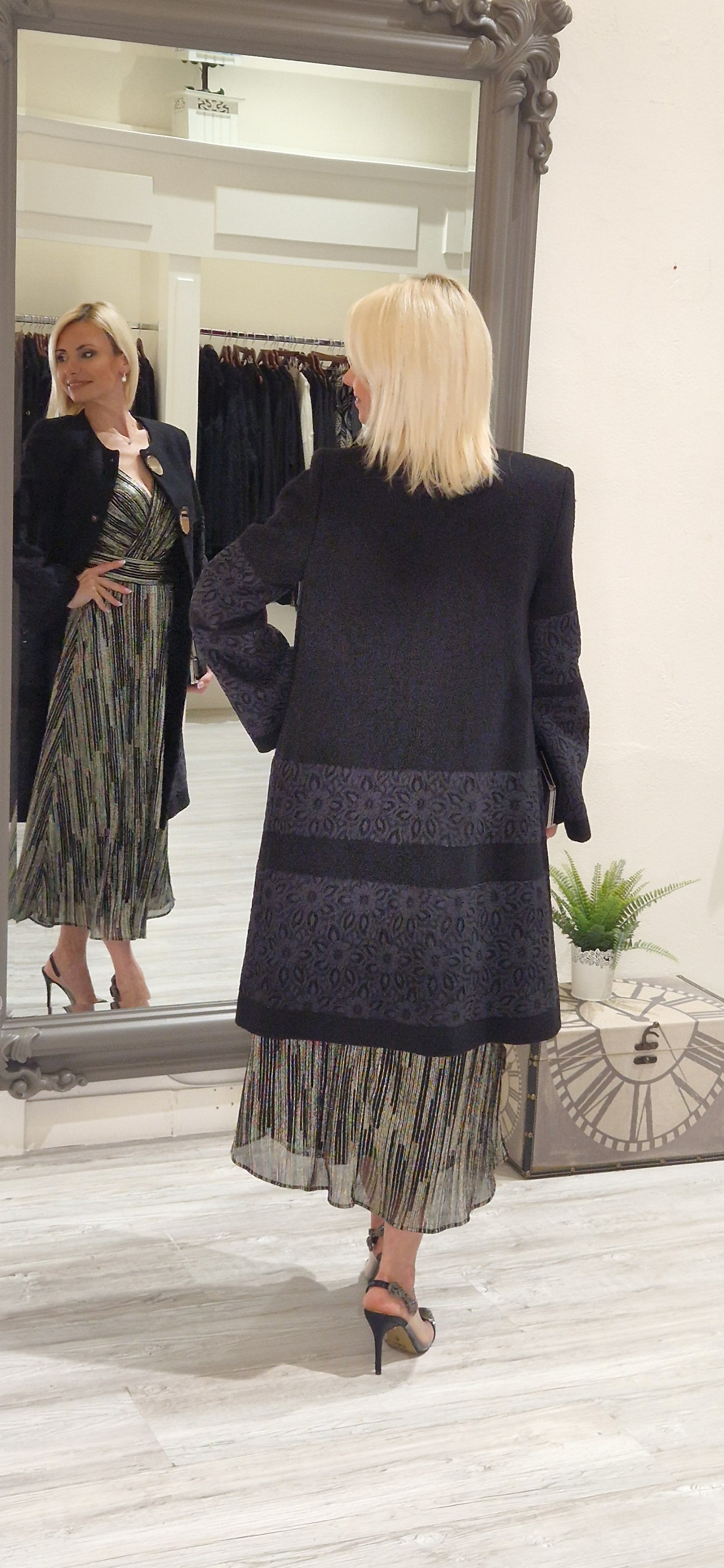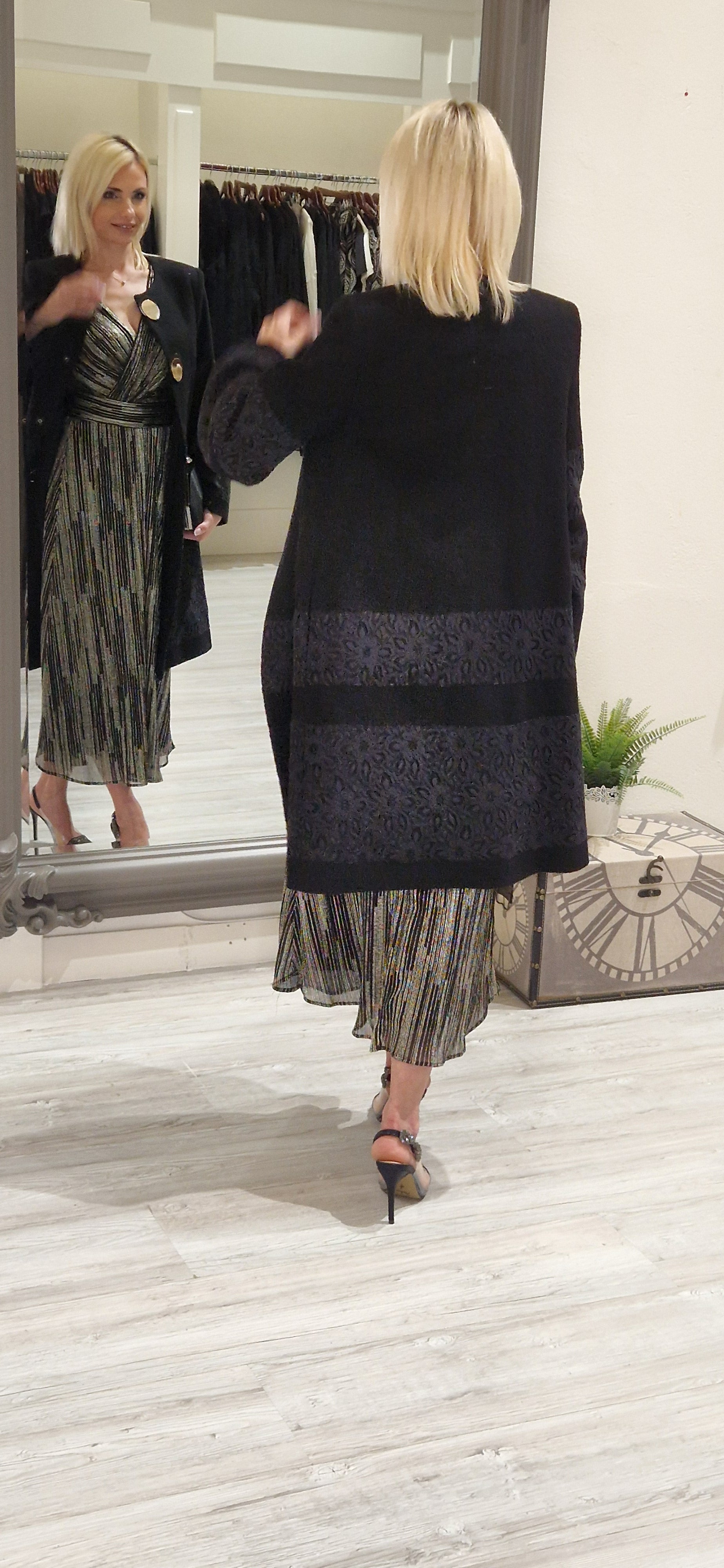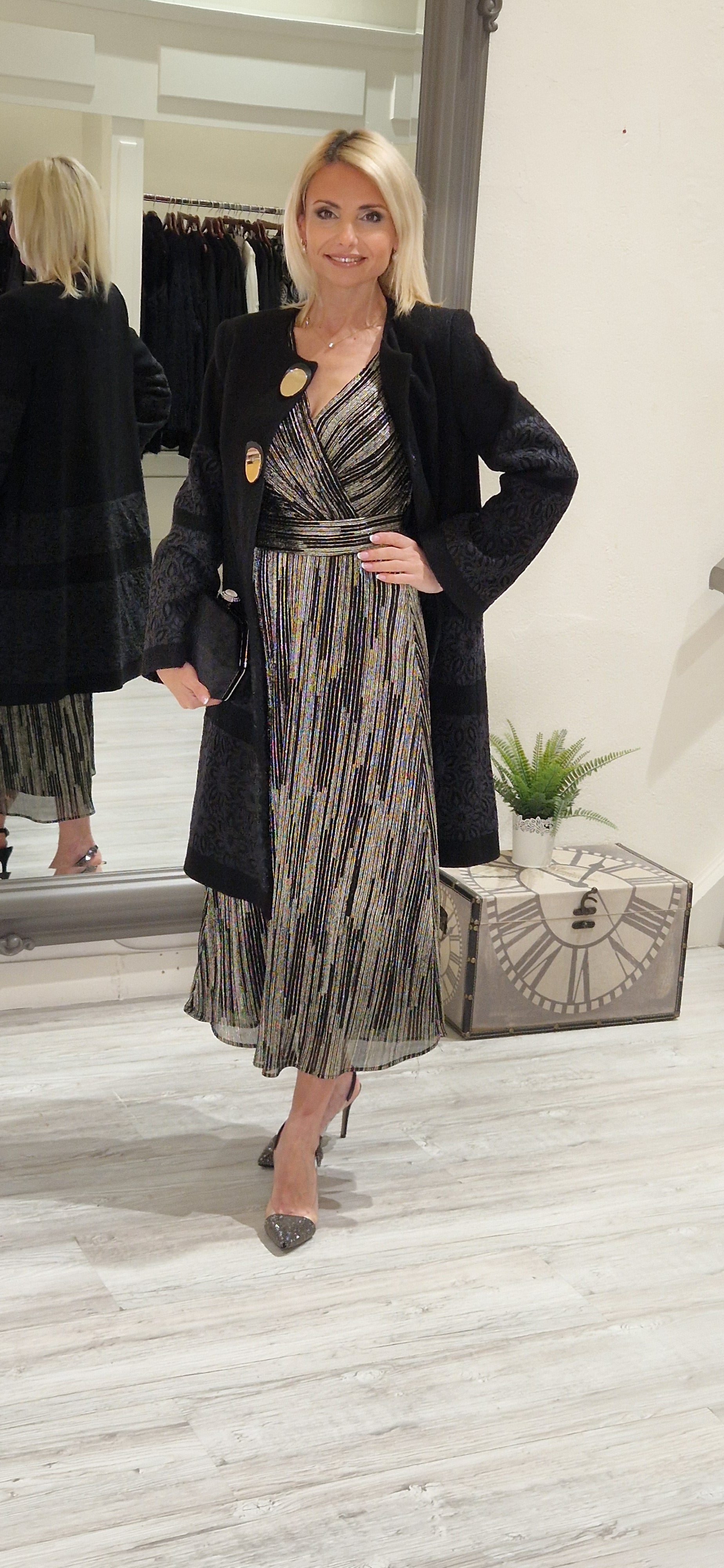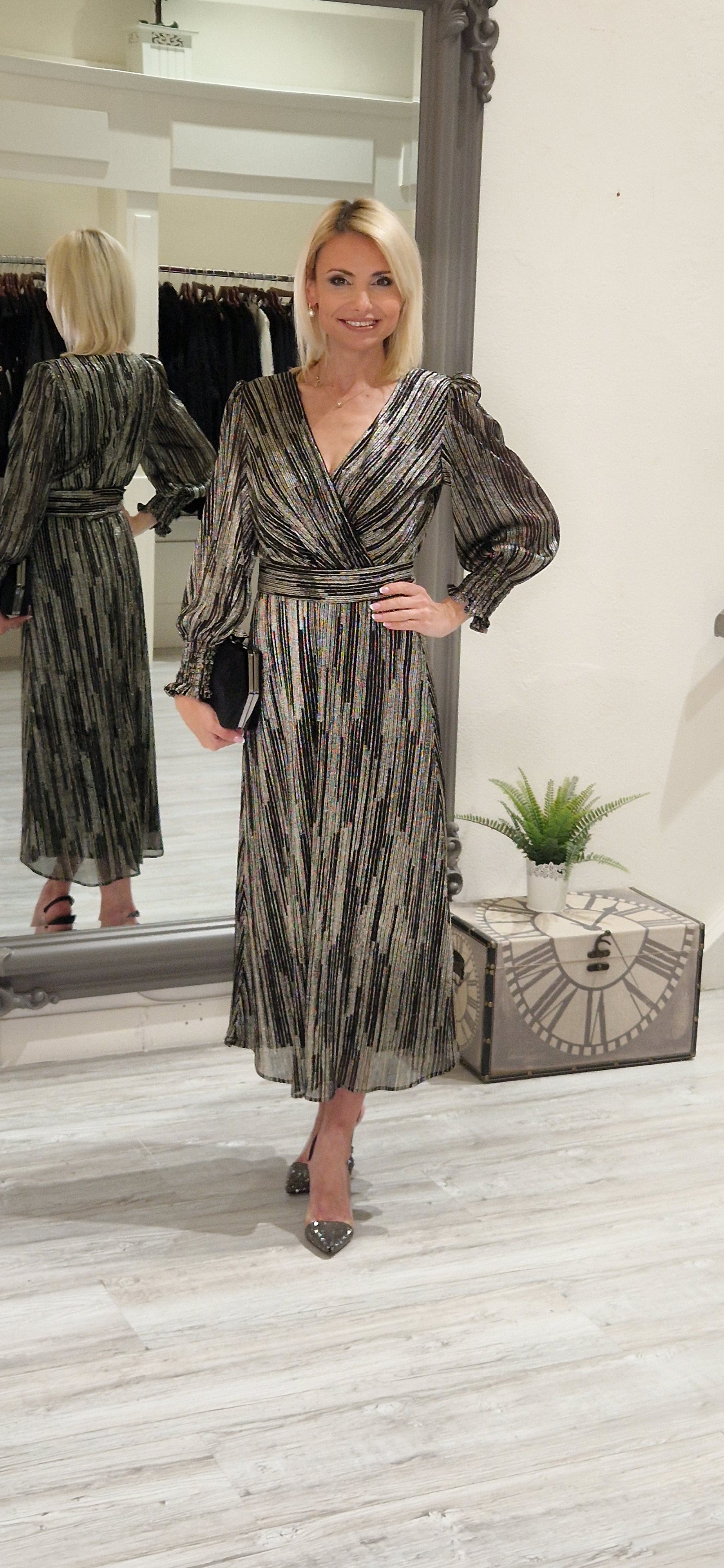 This black and gold shimmer dress features long sleeves with elasticated cuffs and a flattering V-neck. It includes a detachable belt to define your waist and a discreet zip closure at the back for a streamlined fit. Fully lined and crafted from a delicate blend of 77% polyamide and 23% metallic fibers, it requires gentle washing to maintain its luxurious shimmer and shape. Ideal for elegant occasions, this dress combines comfort with sophisticated style.