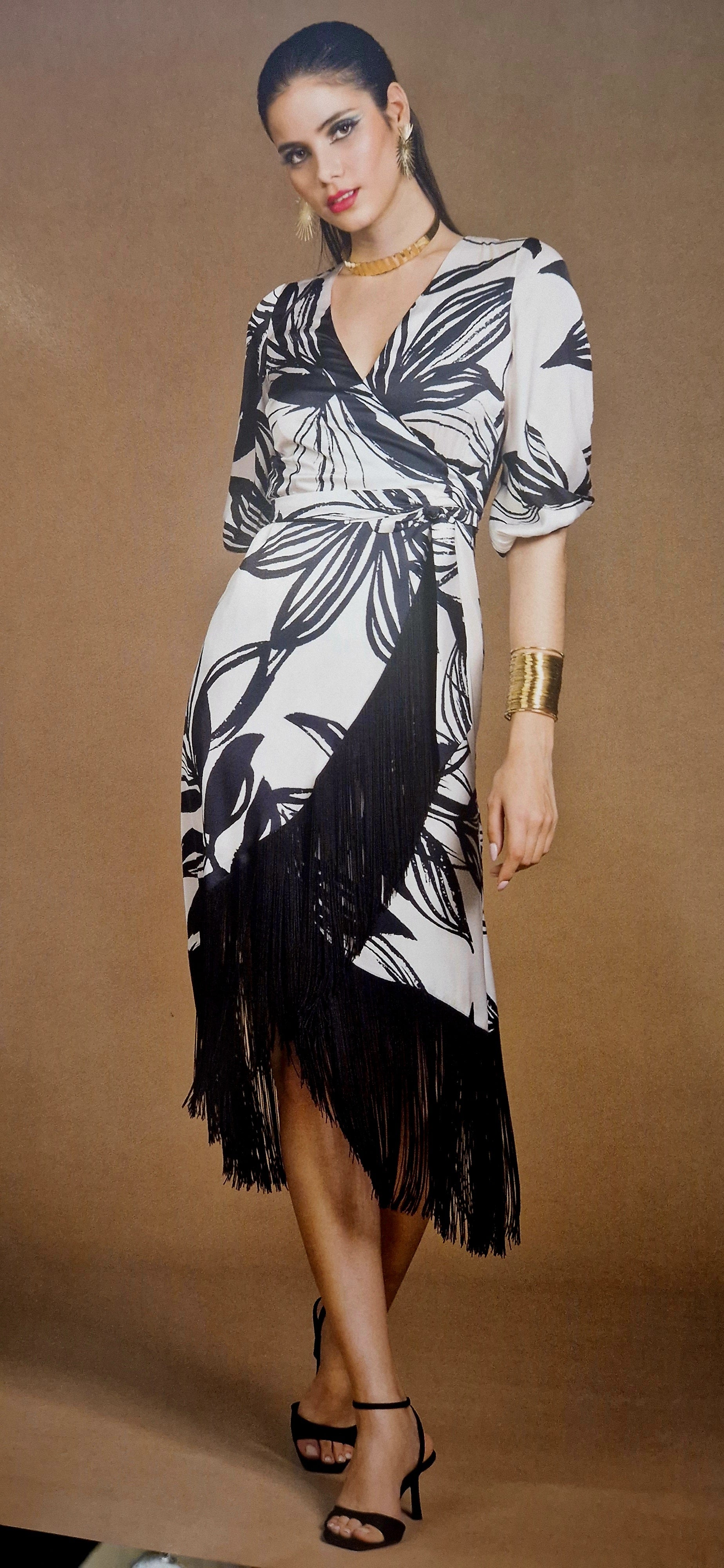 Enhance your wardrobe with our Black & Ivory Dress. Its elegant V-neck design with fringe detailing on the end is sure to make a statement. Made with 100% polyester, this dress features three-quarter length elastic-cuffed sleeves for added style and comfort. Elevate your look with this àamust-have piece.