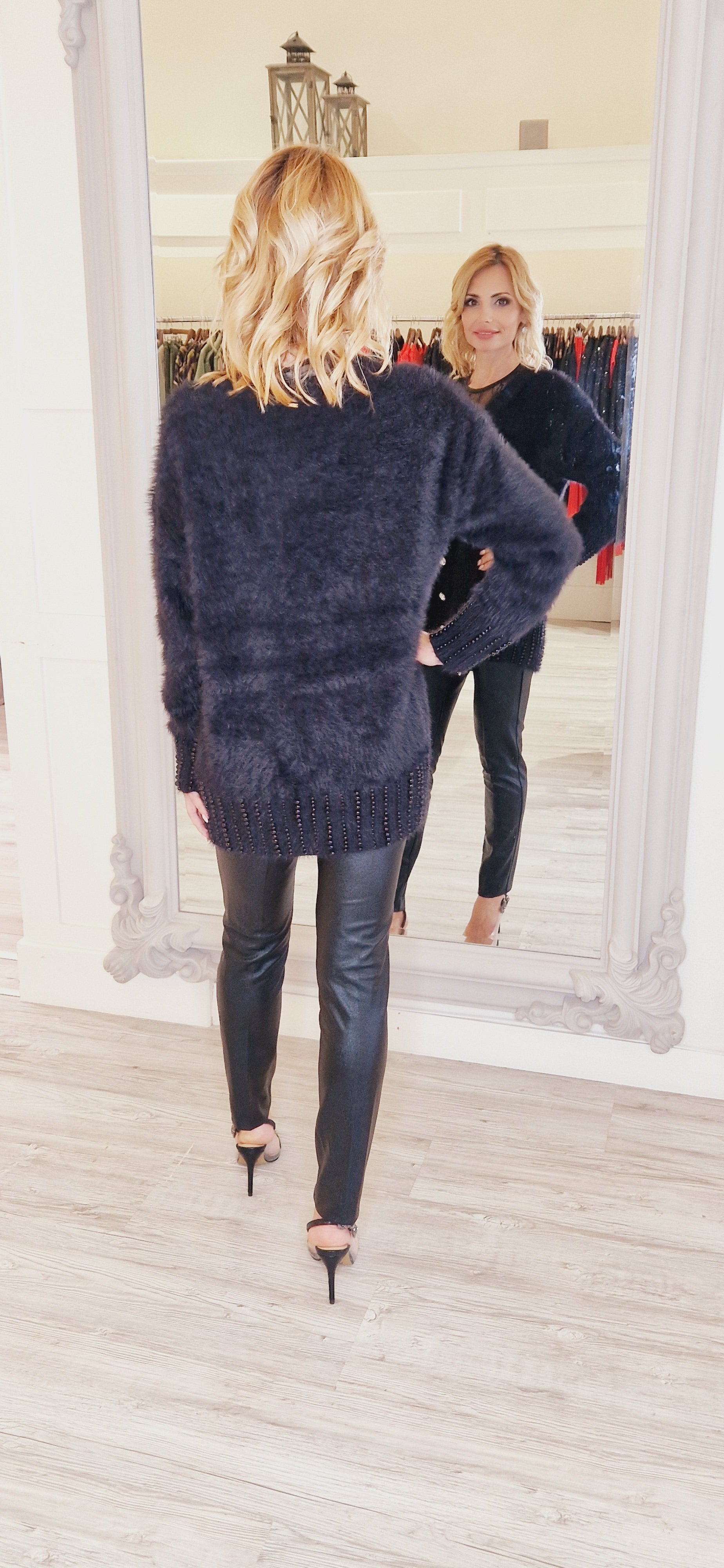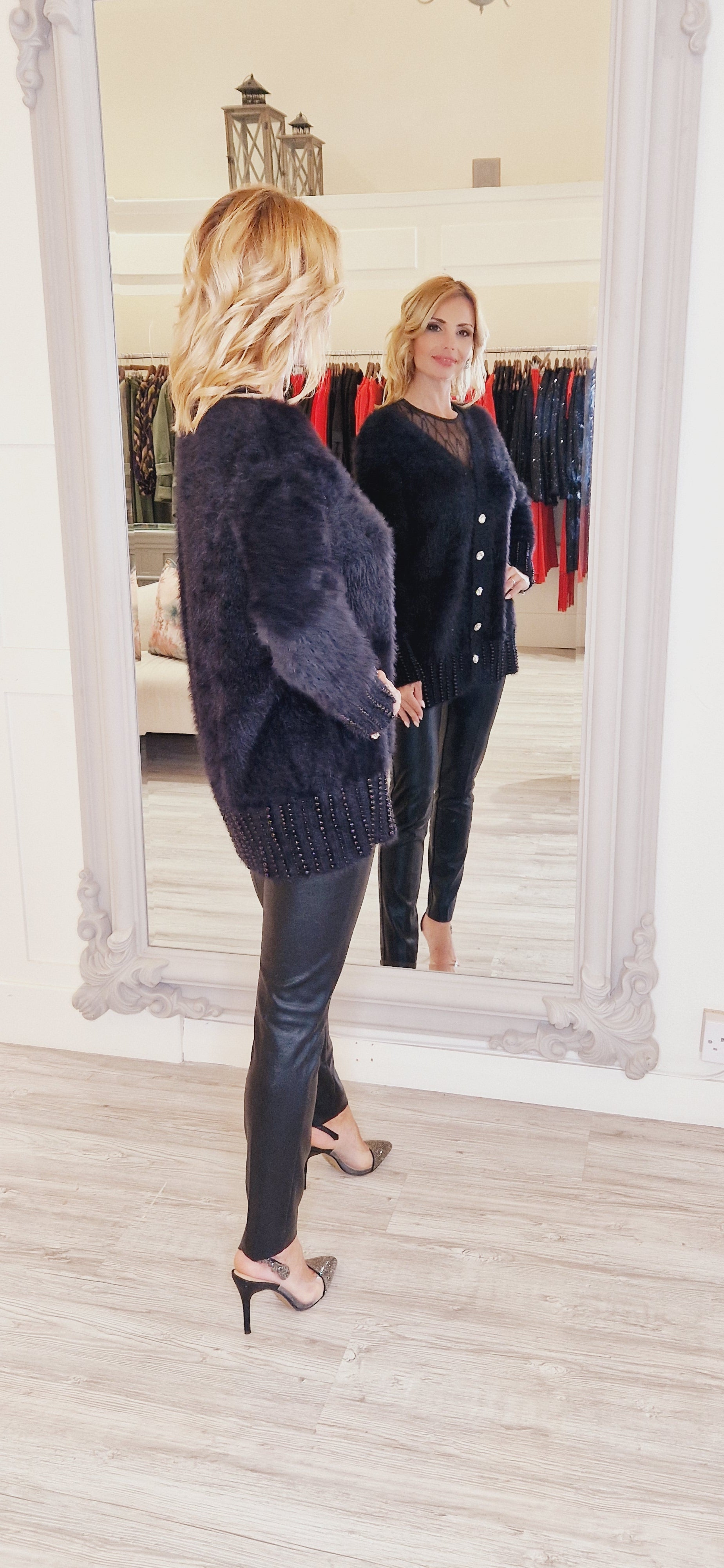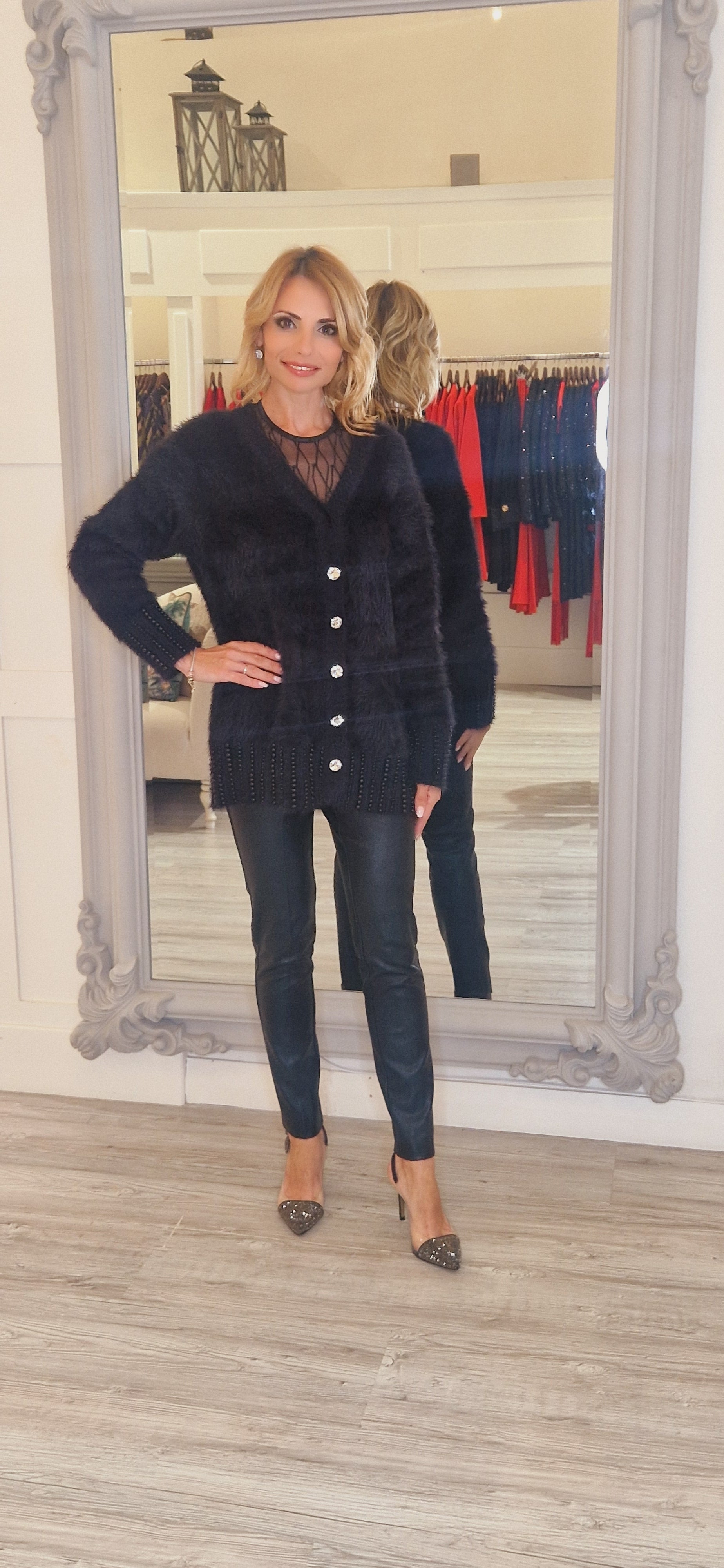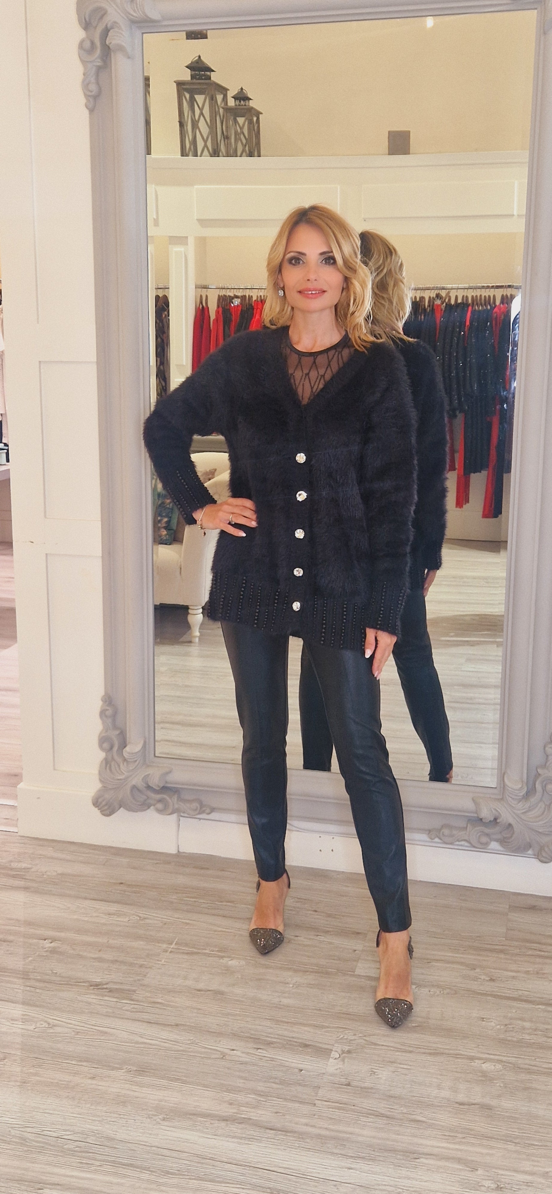 Expertly crafted with a v-neck design and front diamond buttons, this black knit cardigan is the perfect addition to your wardrobe. The long sleeves feature delicate pearls on the cuffs, while the hemline is adorned with elegant pearls as well. Complete the look by pairing it with our matching knit dress.