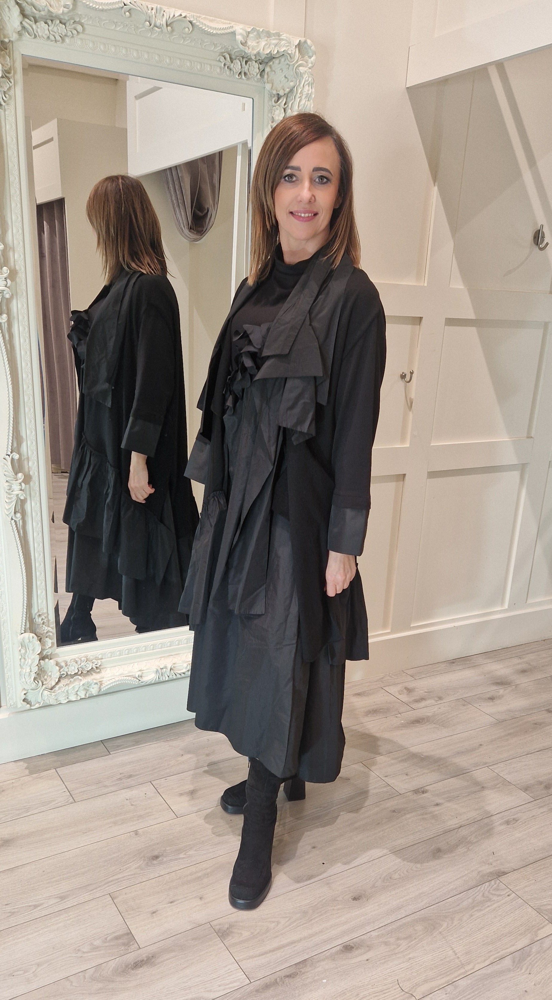 Crafted for a timeless and sophisticated look, our Black Midi Dress features a high neckline and long sleeves with elongating cuffs. The oversize fit and flowy skirt with side pockets add effortless elegance to your wardrobe. Perfect for any occasion, this dress is a must-have for any fashion-forward individual.