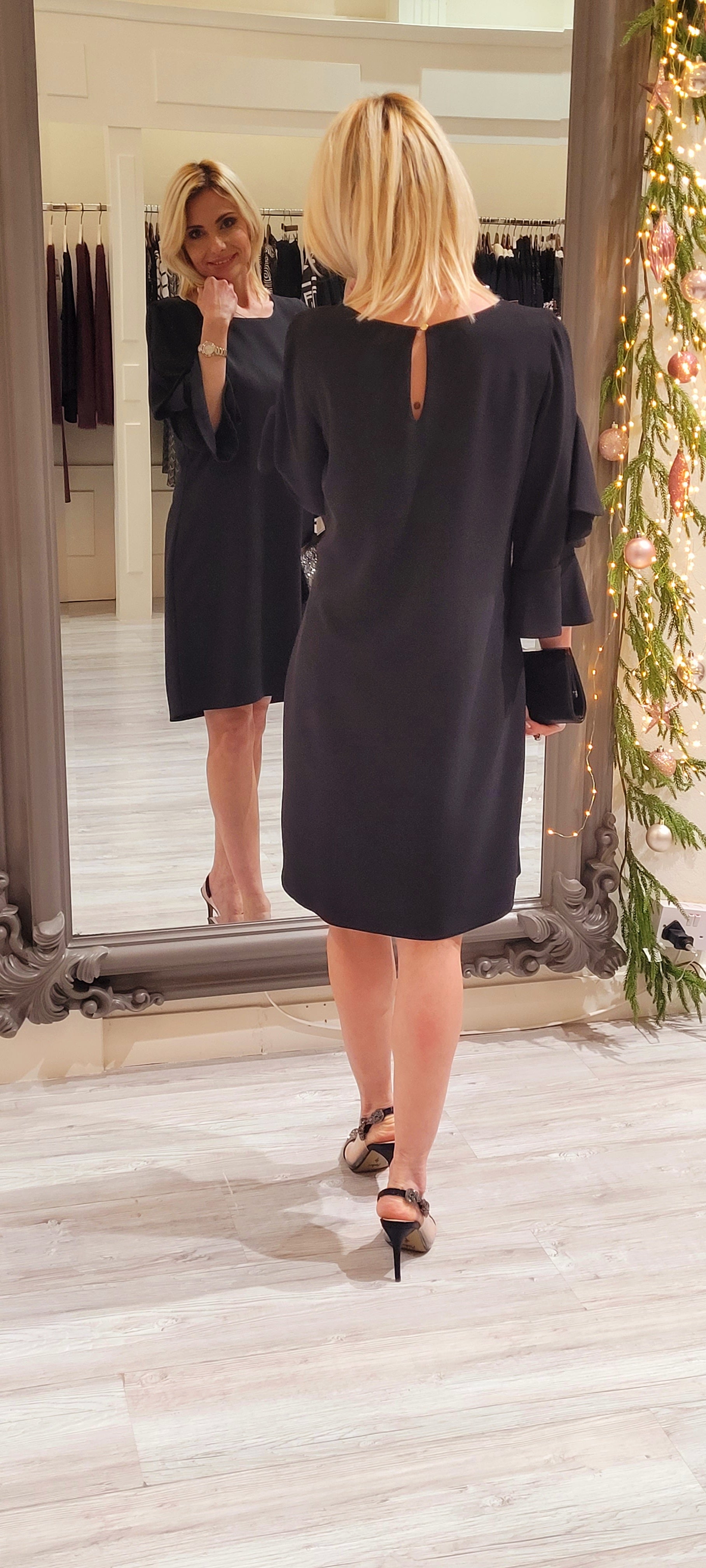 This Black Midi Dress represents understated sophistication with purposeful design details. The round neckline and ruffled 3/4 sleeves strike a balance between classic restraint and modern sensibility. Constructed with a fully lined interior for lasting wear, the 94% polyester and 6% elastane composition delivers both structure and movement. The subtle elastane content ensures the dress maintains its shape while accommodating natural body movement. Pair with the coordinating coat, bag, and accessories to create a cohesive, polished wardrobe statement.