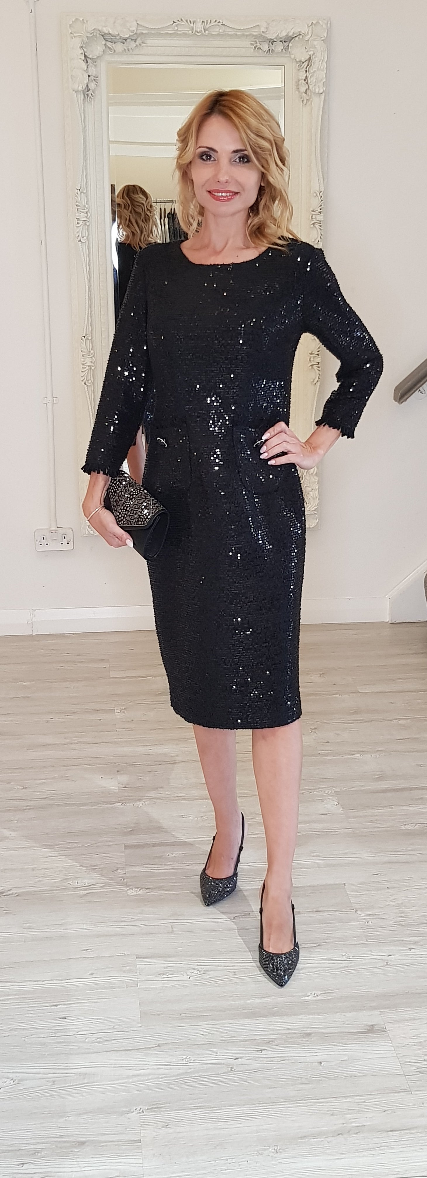 - This elegant Black Sequin Dress features a round neck and 3/4 sleeves for a sophisticated look. The front pockets with silver button detail add a touch of flair, while the back zip and lining provide comfort and ease. Made with high-quality sequin fabric, this dress can be paired with our matching jacket for a complete and stylish outfit.