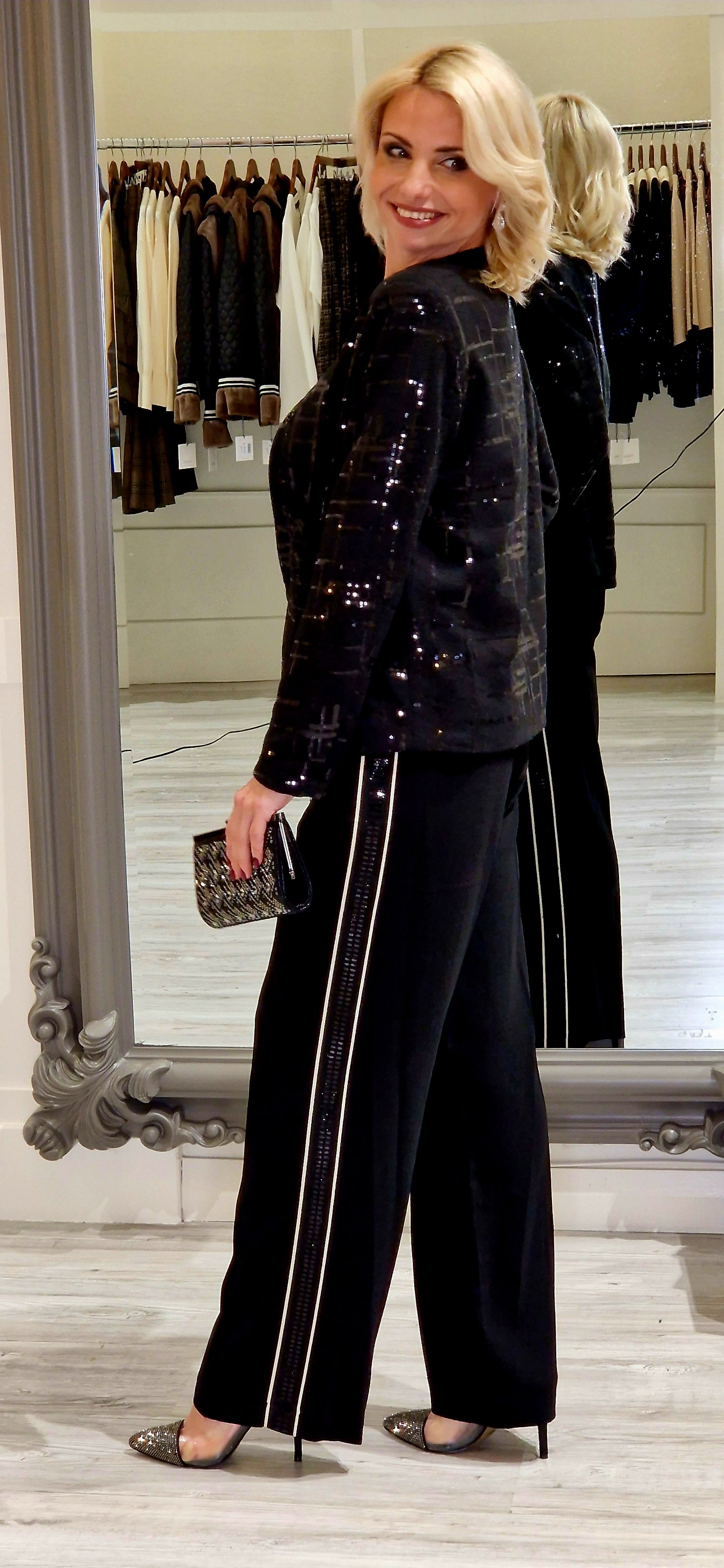 Black sequin pattern jacket featuring self-printed sequin lines that add subtle texture and shimmer. It features a front button closure for a secure and tailored fit, complemented by full-length sleeves that enhance its functionality as an outerwear piece.