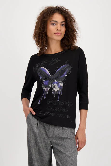 - This block-coloured top is a cool and casual top, with the frontal butterfly print adding a fun and funky style. The Butterfly print is placed between different fonts that compliment the tones perfectly.