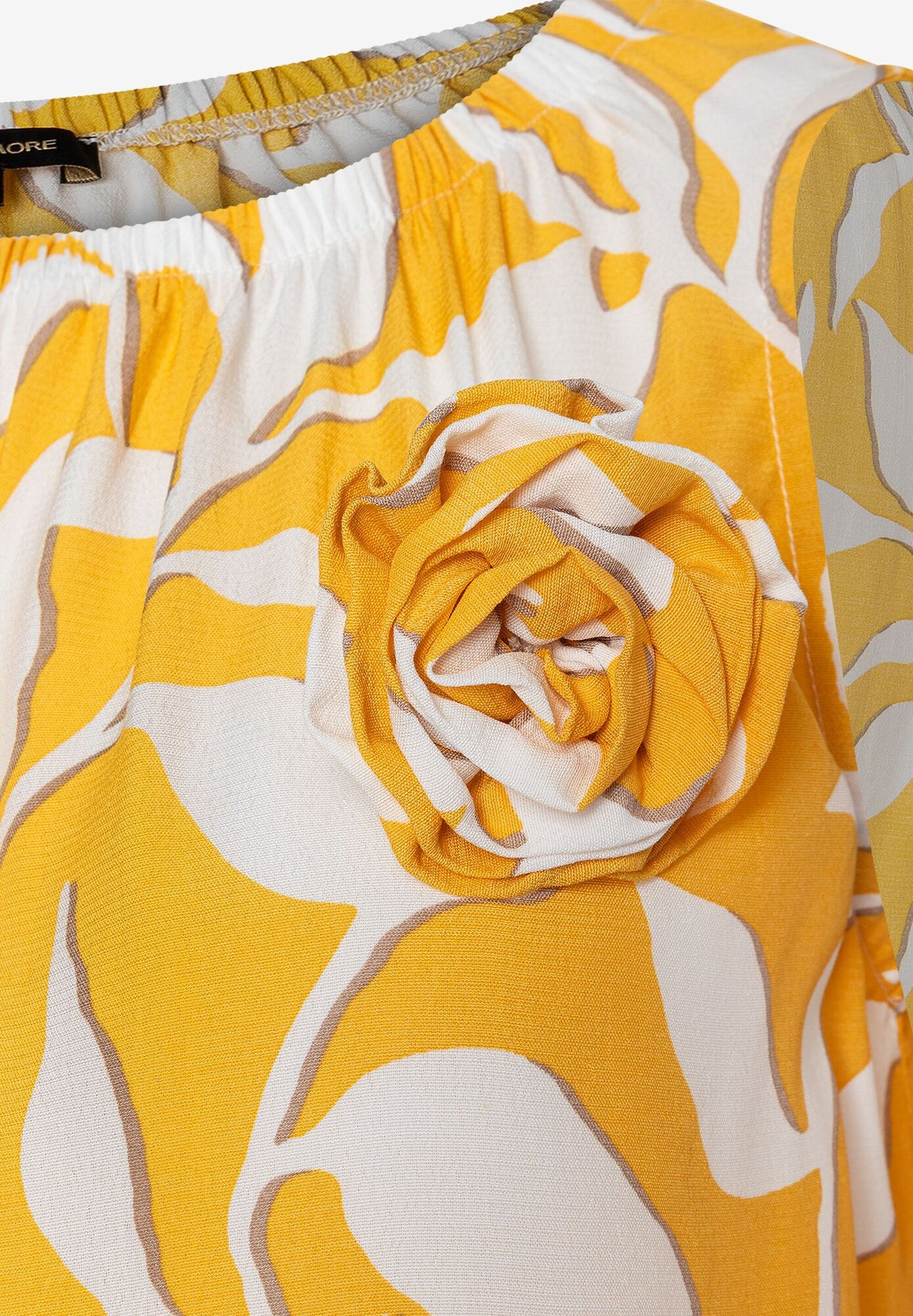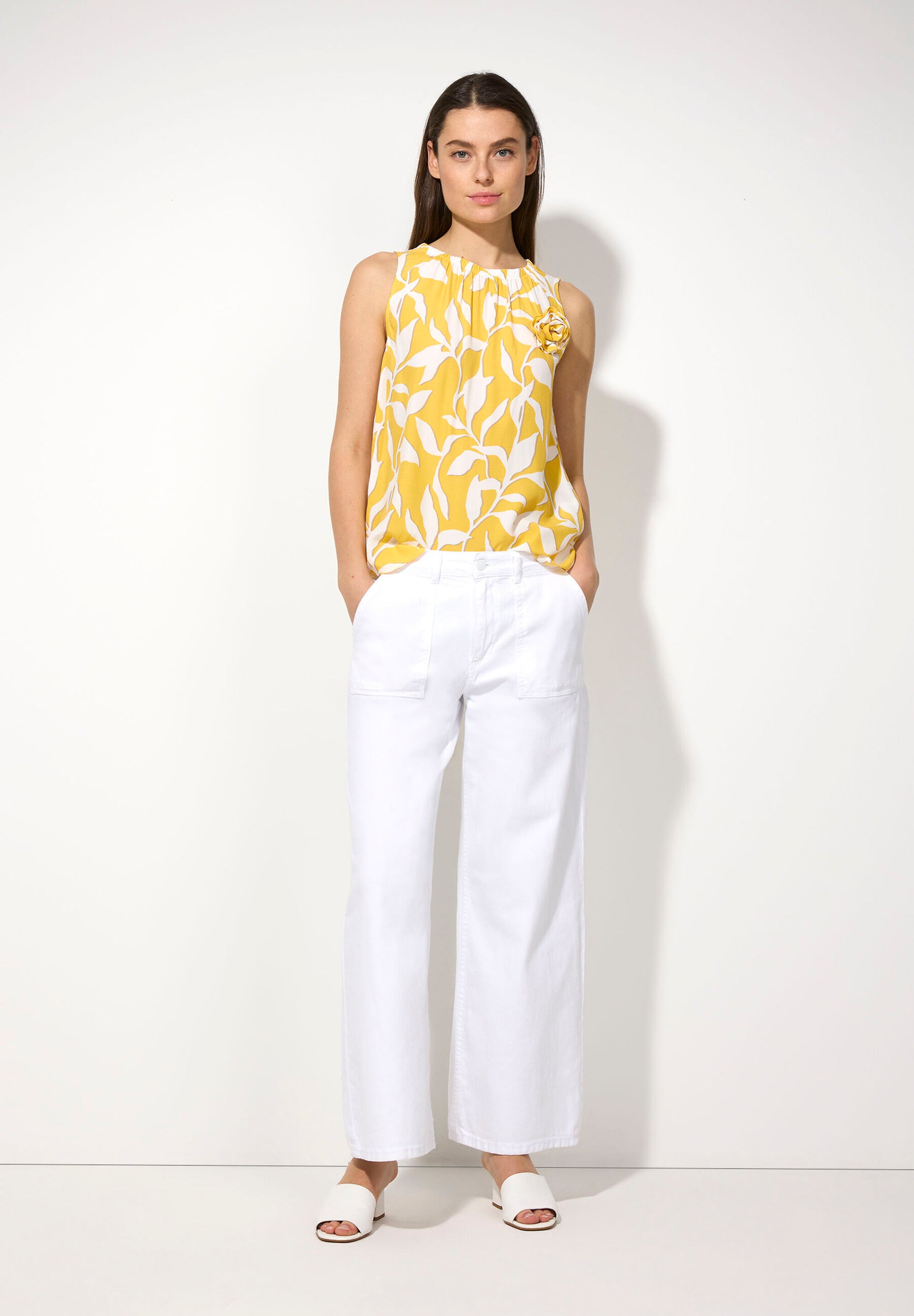 This summery blouse top from MORE & MORE, with its gathered neckline and decorative flower, is easy to style. It pairs just as well with wide Marlene trousers as it does with short Bermuda shorts or casual jeans.