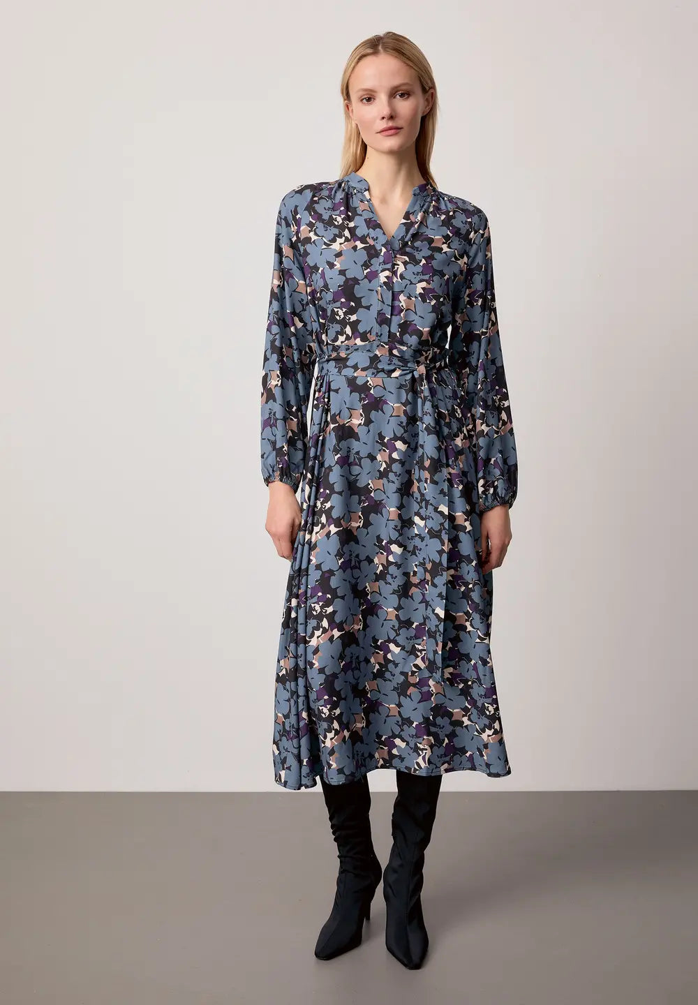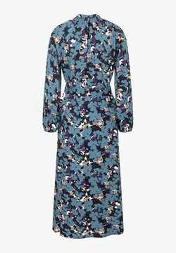 Enhance your style with our Blue Flower Midi Dress. Designed with a stand-up neck, front buttons, and matching belt, this dress features a lovely blue plume and cream flower print. With its a-line skirt and long sleeves with elastic cuffs, it offers both comfort and elegance. Upgrade your wardrobe now.