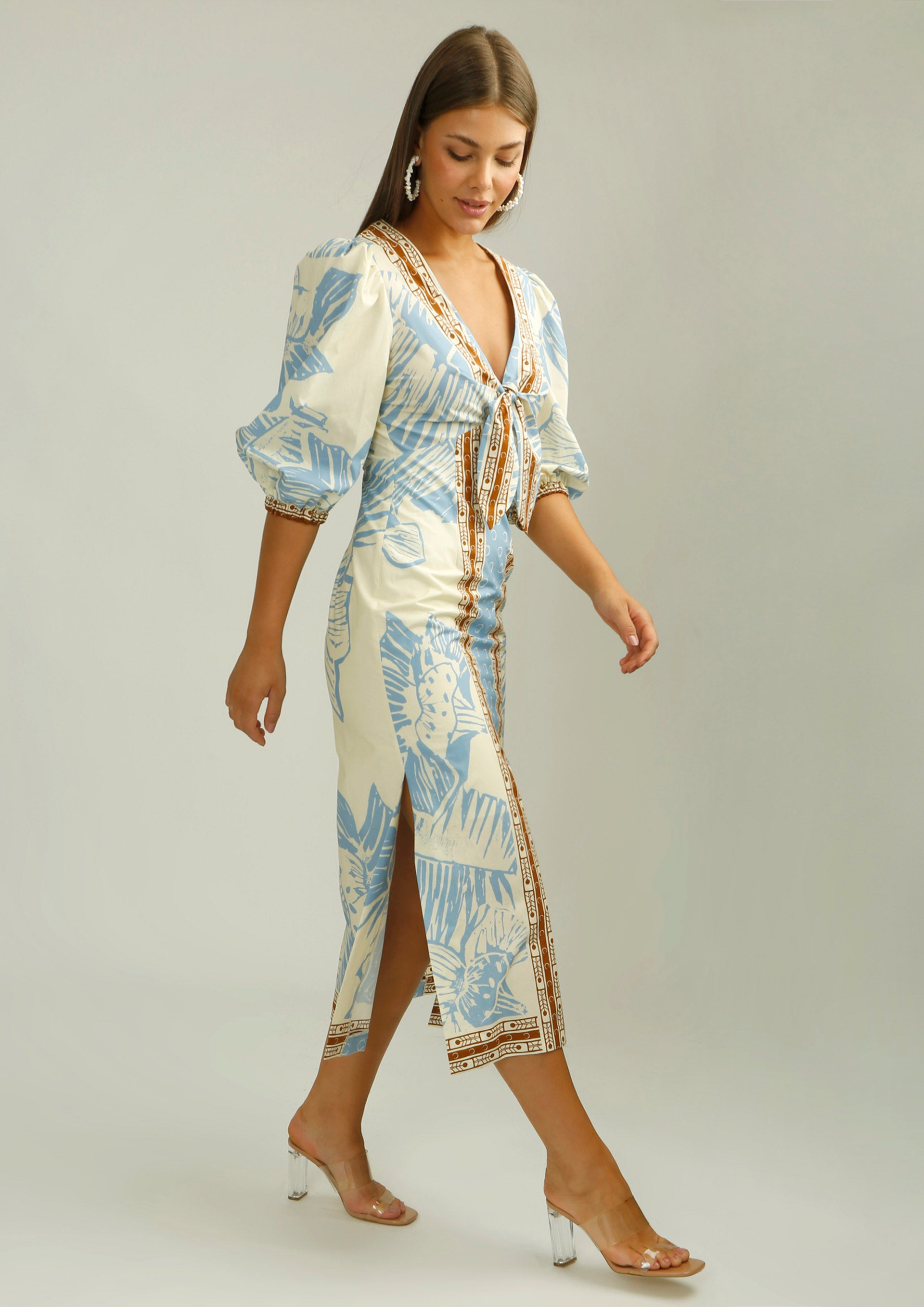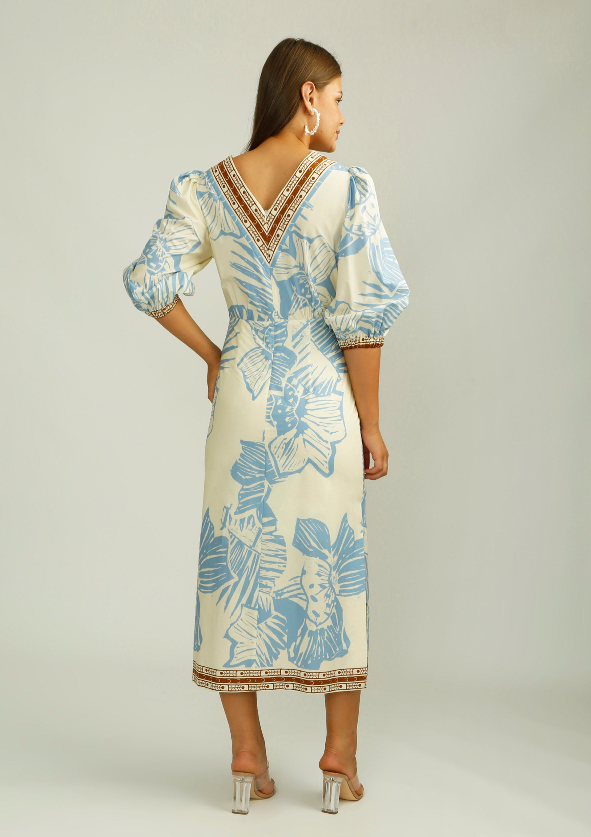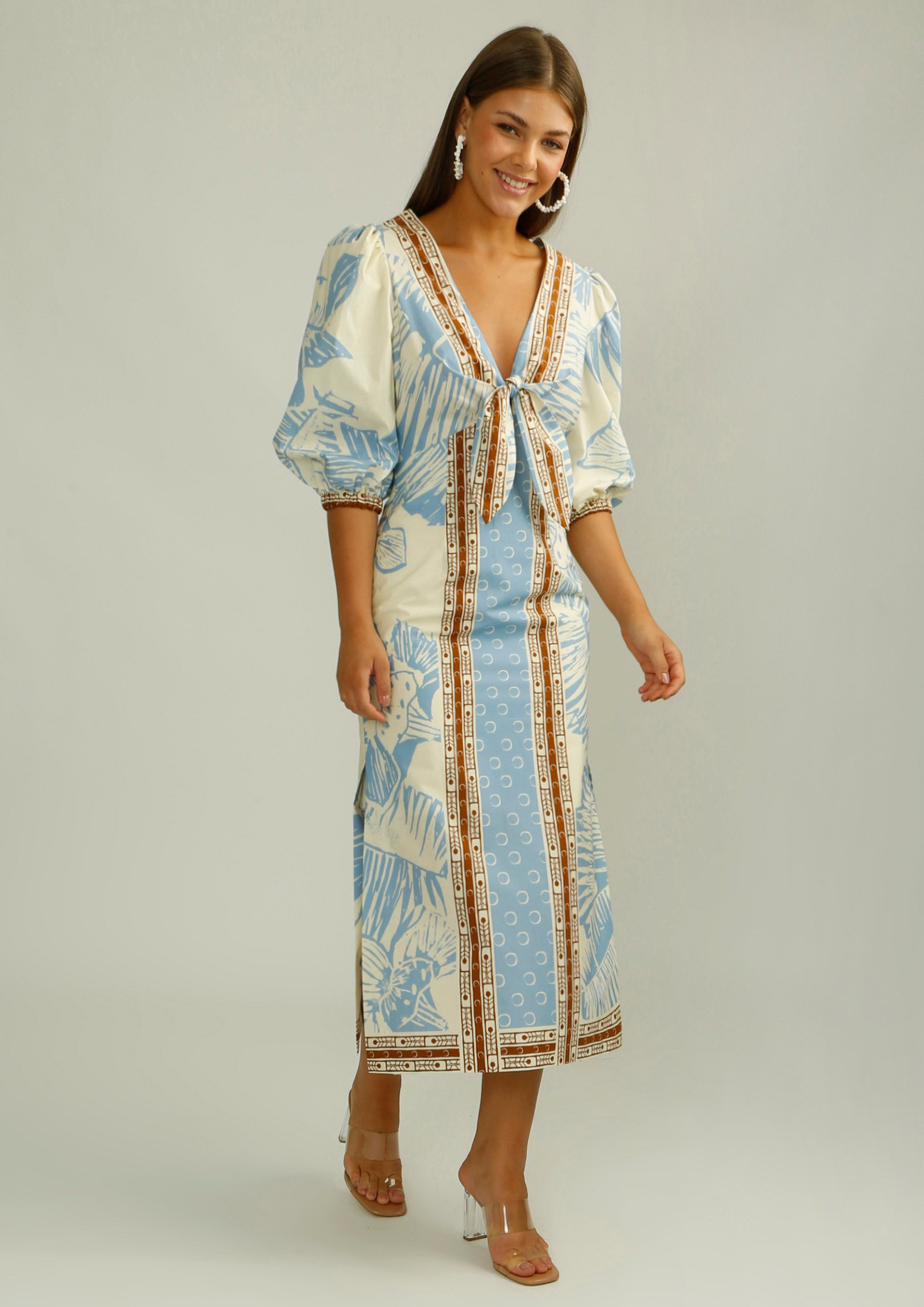 Expertly designed for a perfect fit, the Blue Print Midi Dress boasts a flattering v-neck with tie detail and 3/4 sleeves with elastic cuffs. Its back zip and two side slits make it both stylish and functional. With a lovely blue and rust flower print, this dress is sure to turn heads.