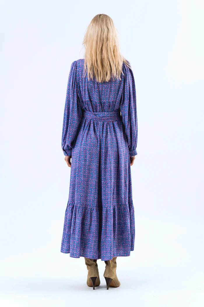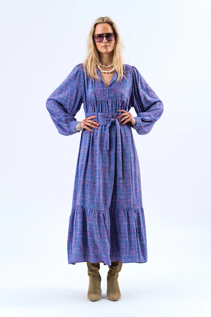 Introducing the Blue Printed Maxi Dress. Made from lightweight, draping fabric, this dress boasts a relaxed silhouette with long sleeves, a round neckline, and small pleats at the chest. Perfect for everyday wear or special occasions, it can be styled with both flats and heels.