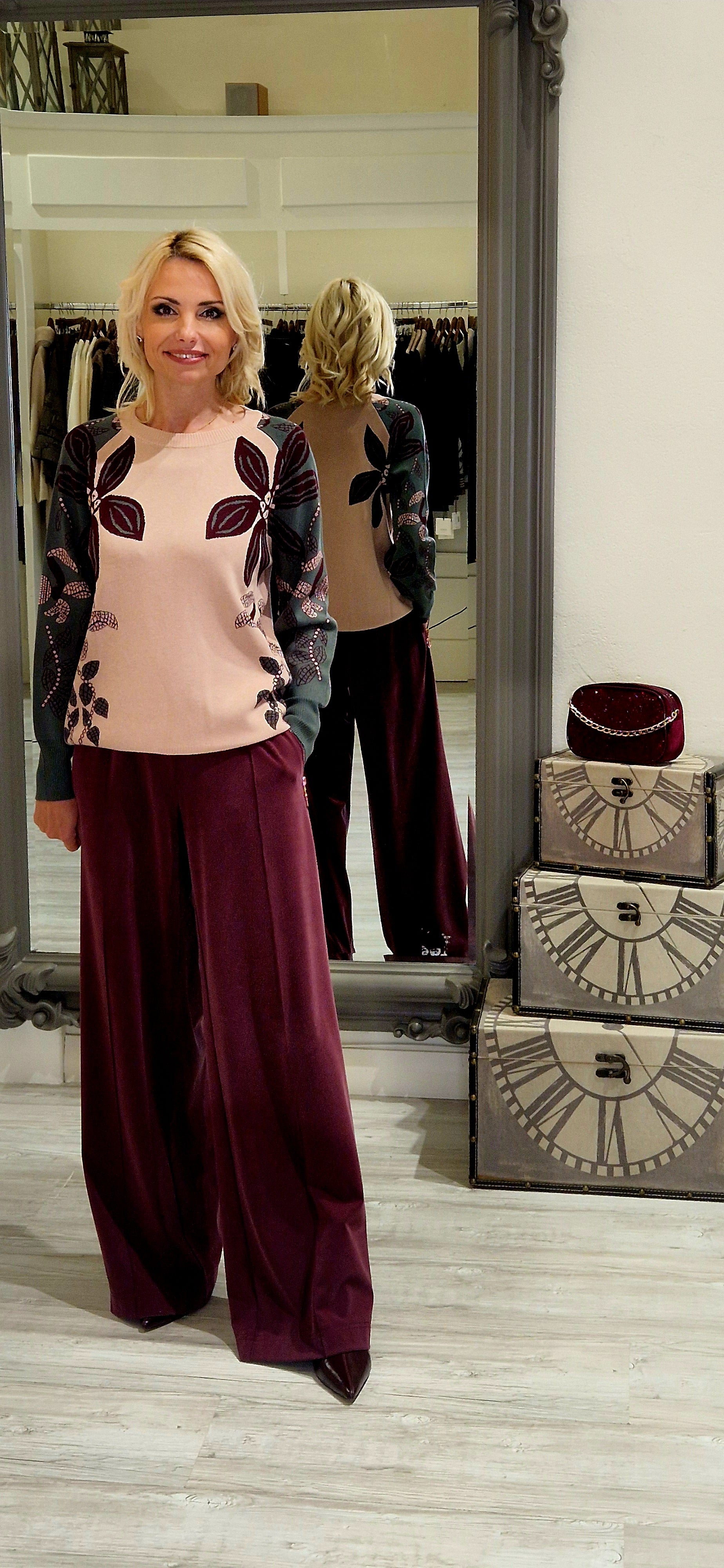 This blush burgundy and green jumper features long sleeves and a classic round neck for a timeless look. Crafted from a soft blend of 68% viscose, 29% polyacrylic, and 3% elastane, it offers both comfort and stretch for ease of movement. Pair it effortlessly with our matching burgundy trousers and coat to create a coordinated, polished outfit perfect for cooler seasons.