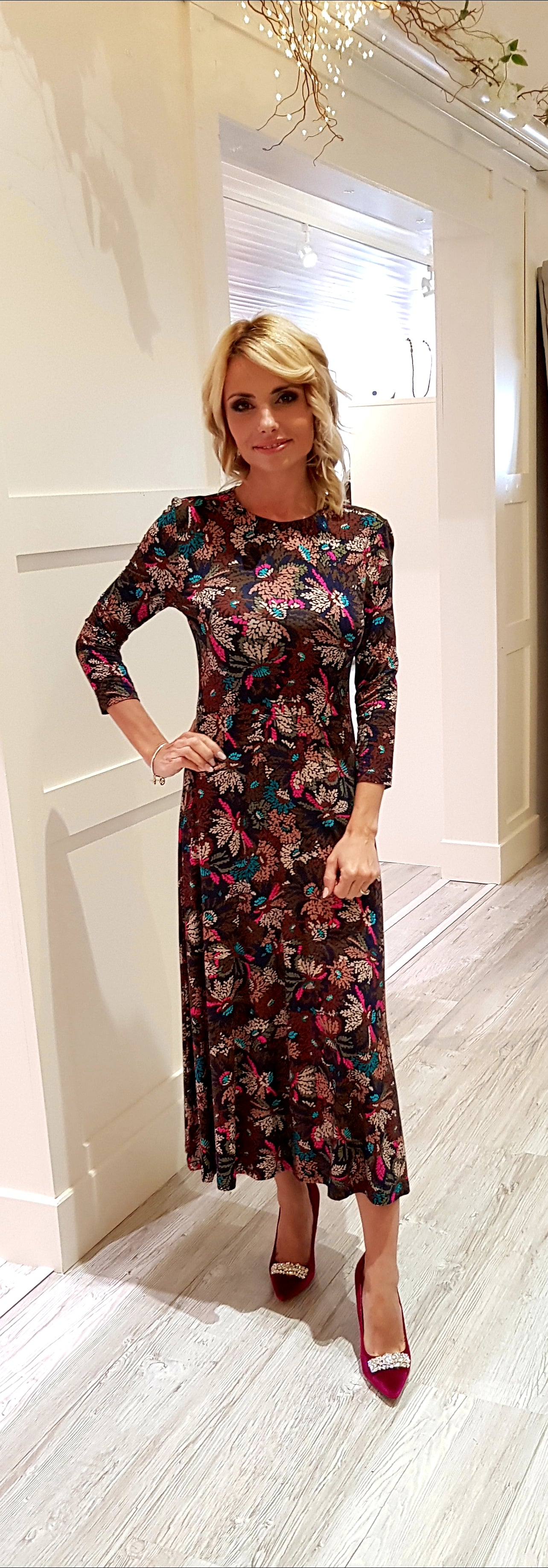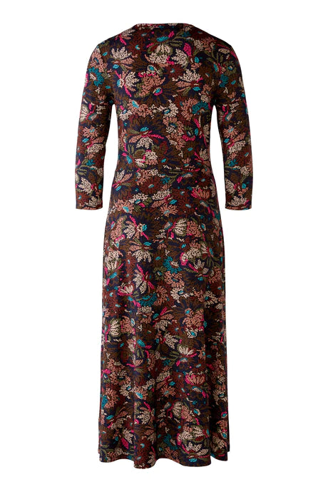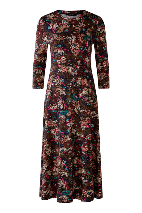 - Effortlessly stylish, this midi dress boasts a bronzed abstract floral print, a high, rounded neckline and a slight swing to the skirt for an undeniably chic look. The Three-quarter length long sleeves create a practical yet eye-catching silhouette for any occasion