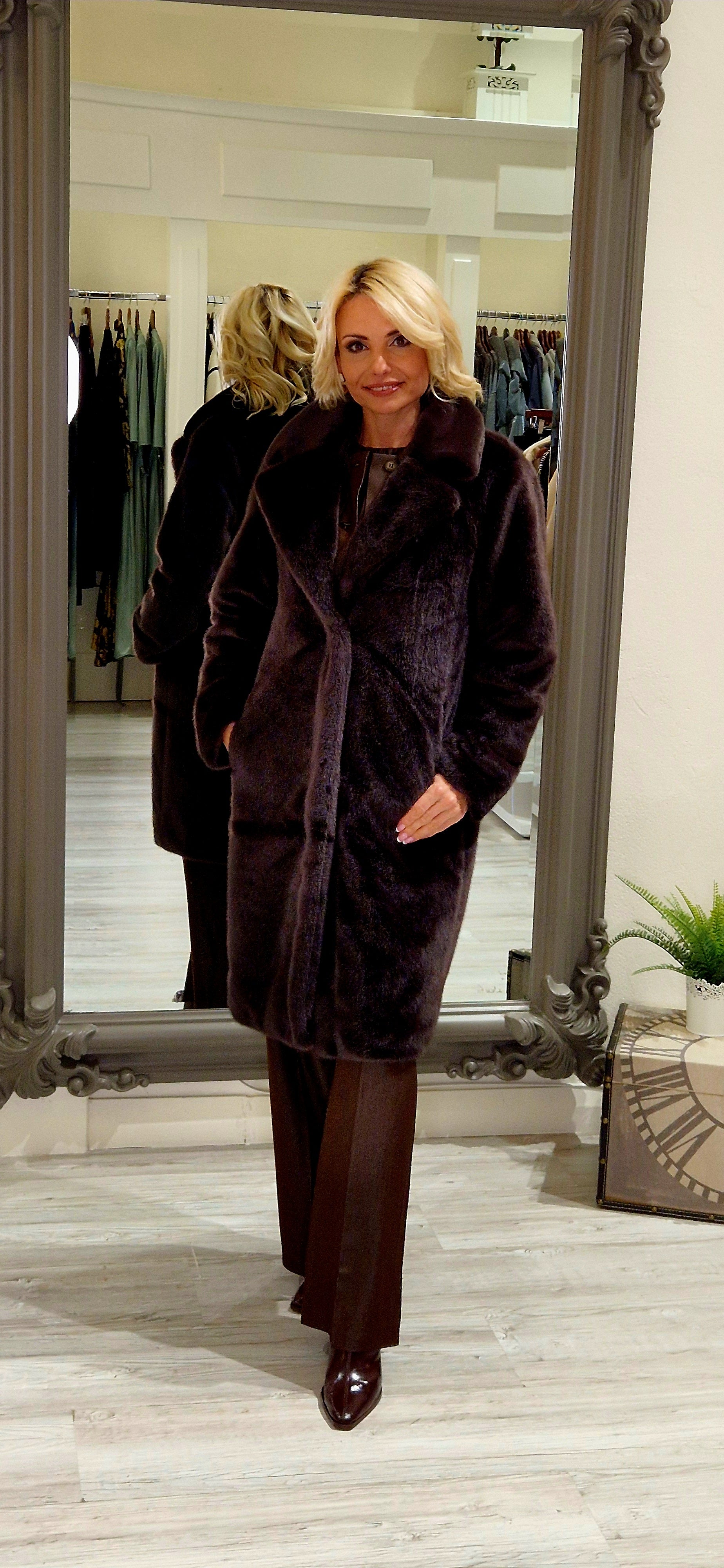 The long-cut fake fur coat impresses with a clean, fluffy look, enhanced by subtle details like a lapel collar, which creates a modern image.