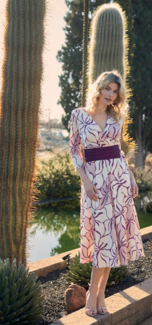 This elegant Burgundy, Cream, and Blush floral dress features 3/4 sleeves and a detachable belt for versatile styling. Crafted from 100% polyester, it offers a fully lined, comfortable fit. The dress closes with a discreet back zipper and requires delicate washing to maintain its vibrant colors and quality fabric. Ideal for refined occasions, it blends classic charm with modern details flawlessly.