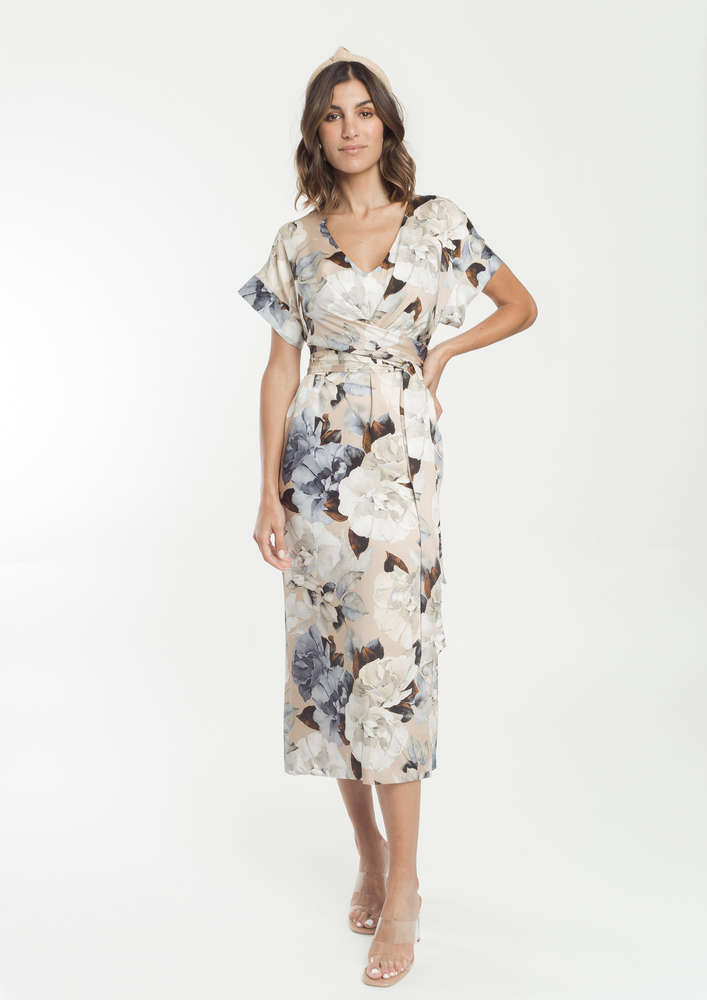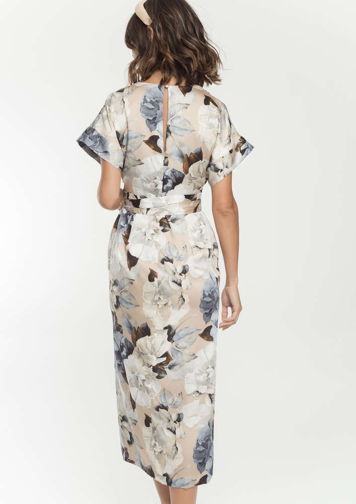 Floral satin midi dress with bow detail tying the waist. Very versatile guest design, it features a V-neckline, short sleeves and side slits at the hem. Central back closure with invisible central zip, teardrop and button. inner lining.