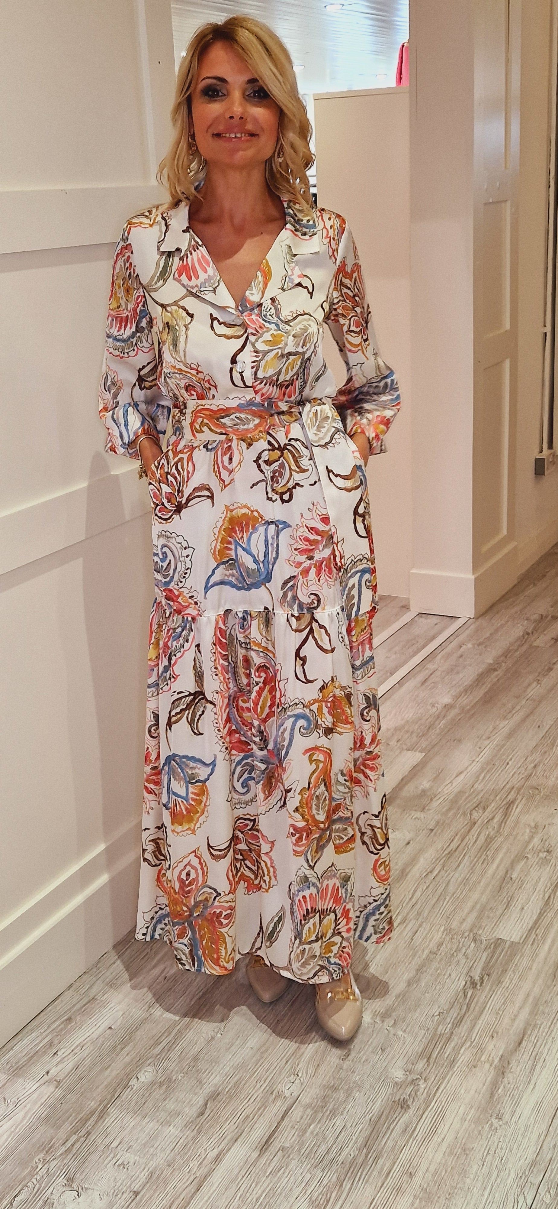 This champagne flower midi dress boasts a neck with a collar and front buttons for a chic and sophisticated look, along with a matching belt to accentuate waist. The 3/4 sleeves add a touch of elegance, while the lovely pink, blue, and rust flower print adds a pop of color. The satin look adds a luxurious touch to this must-have dress.