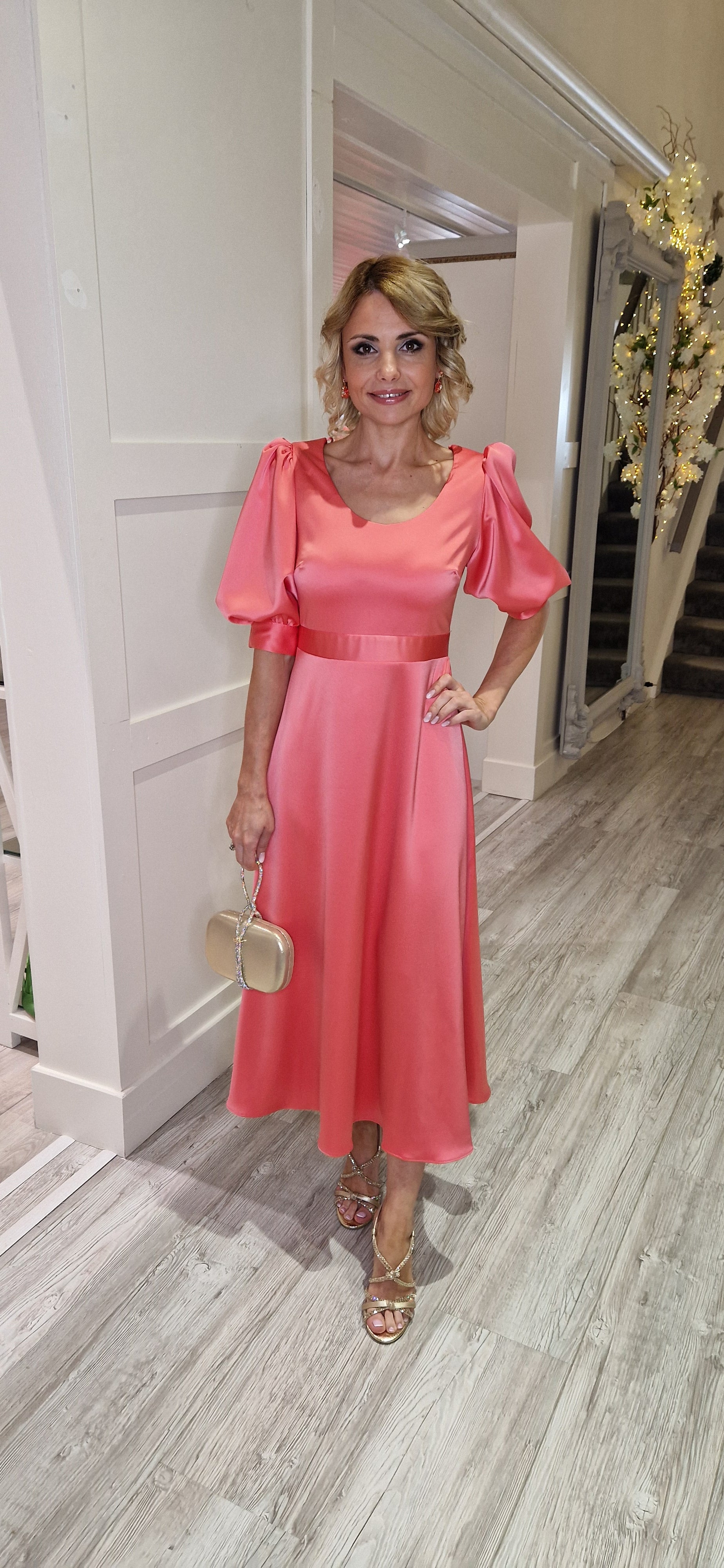 Elevate your wardrobe with this sophisticated Coral Midi Dress. Featuring a classic round neck and cup sleeves with button closures, this dress offers refined elegance. The beautiful button detailing on the back adds distinctive character, while the full lining ensures comfort and opacity. Crafted from 100% polyester, this piece requires delicate washing to maintain its premium quality and vibrant coral hue.