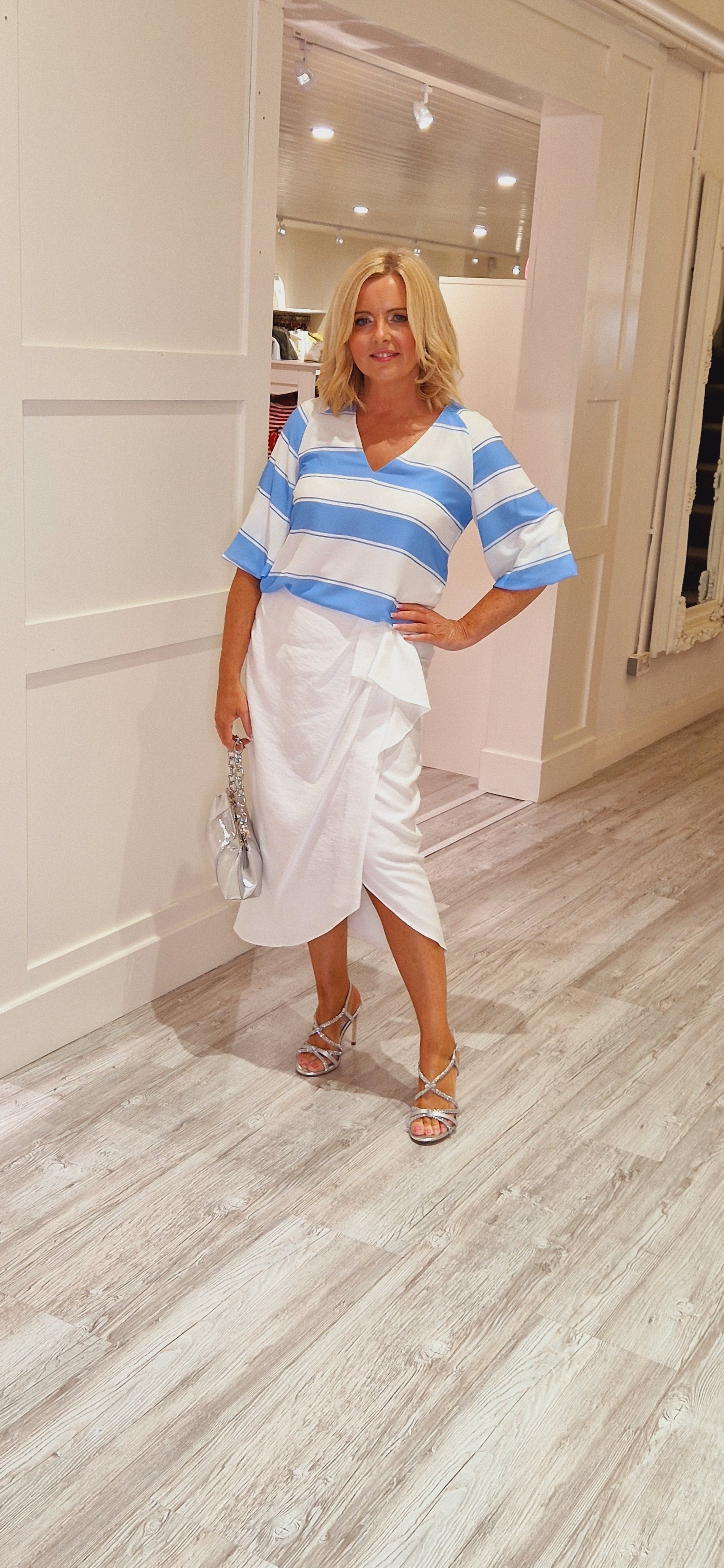 This Cream And Blue Striped Top features a V-neck and 3/4 sleeves, making it a stylish and versatile addition to your wardrobe. Made from 100% polyester, it is easy to care for and can be washed at 30 degrees. Perfectly paired with our matching palazzo trousers for a complete look.