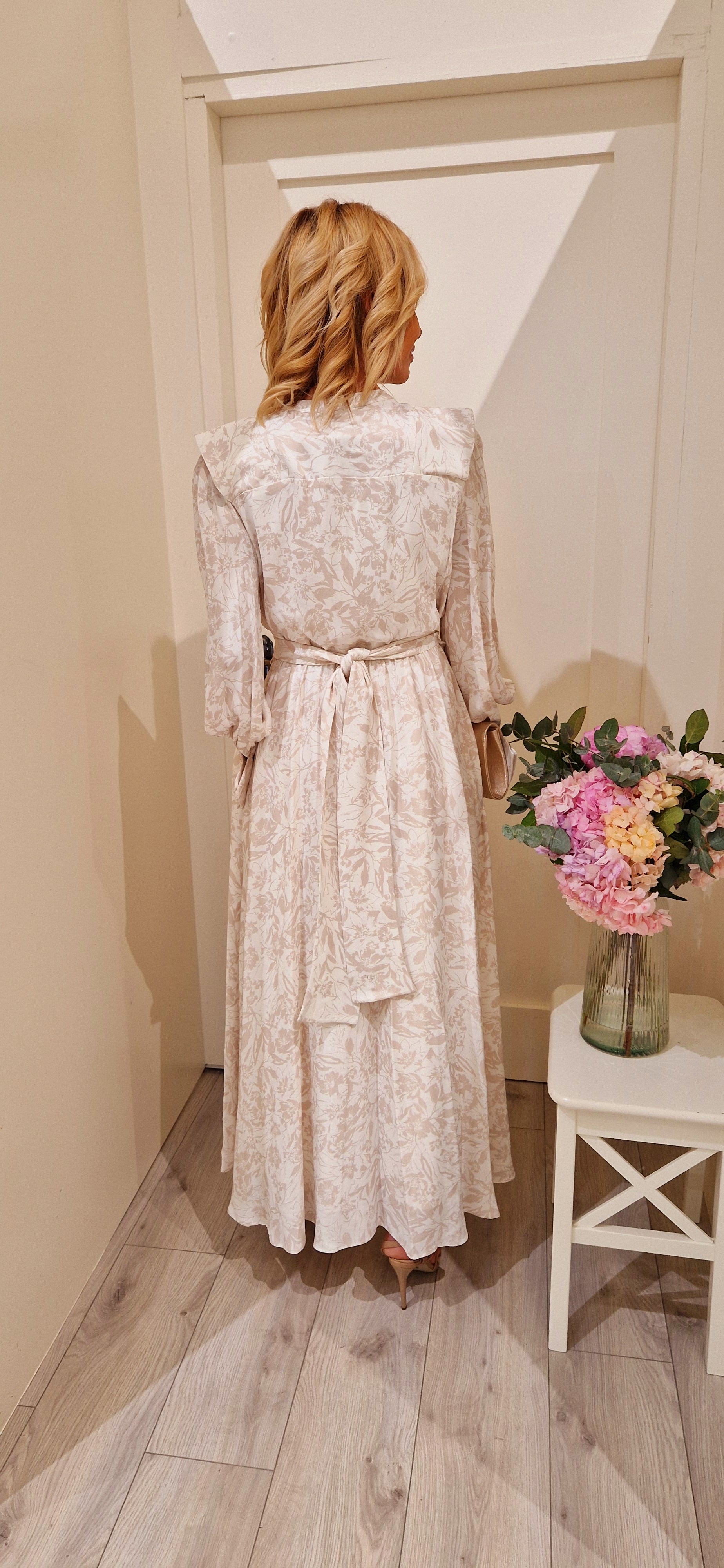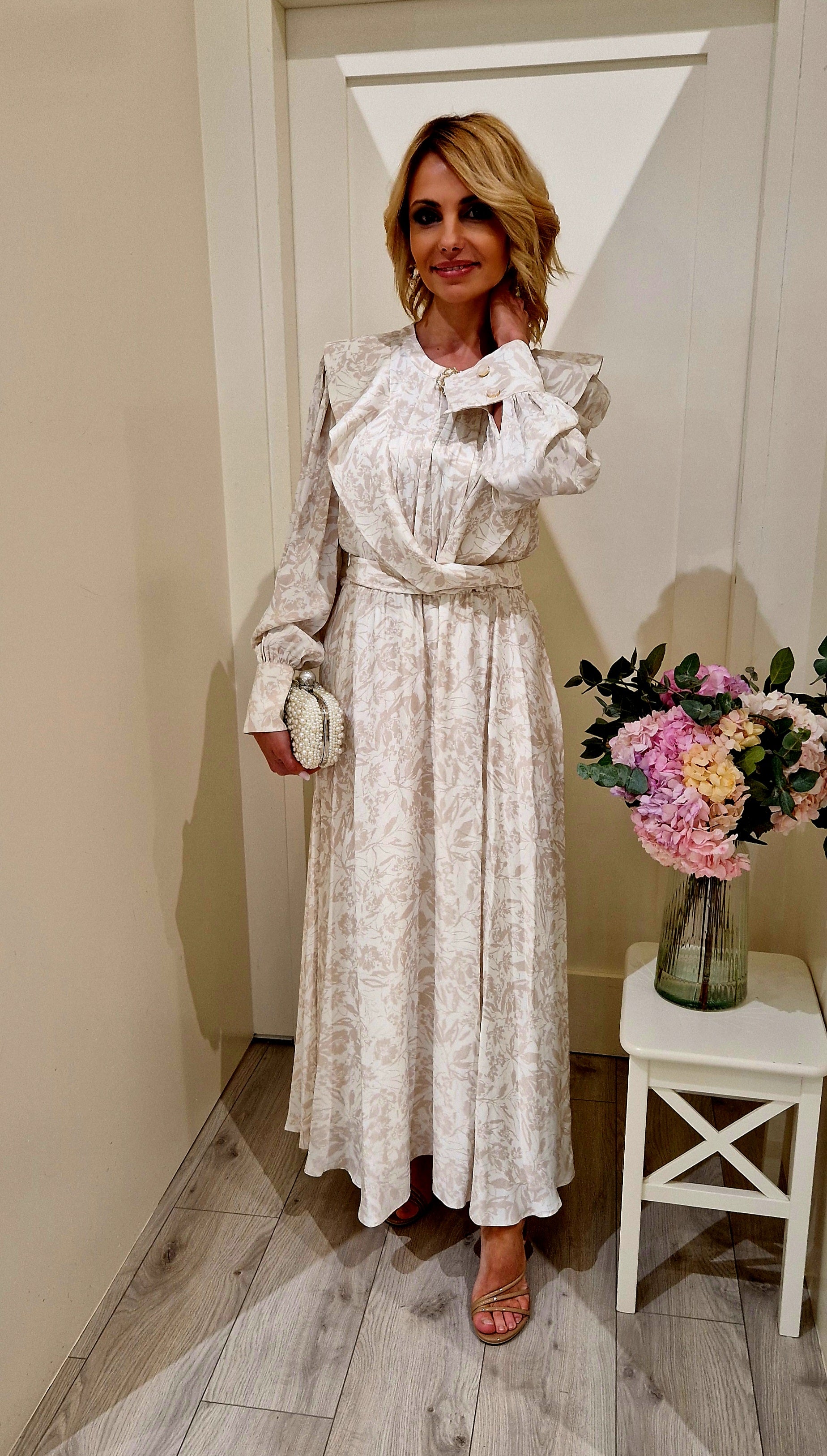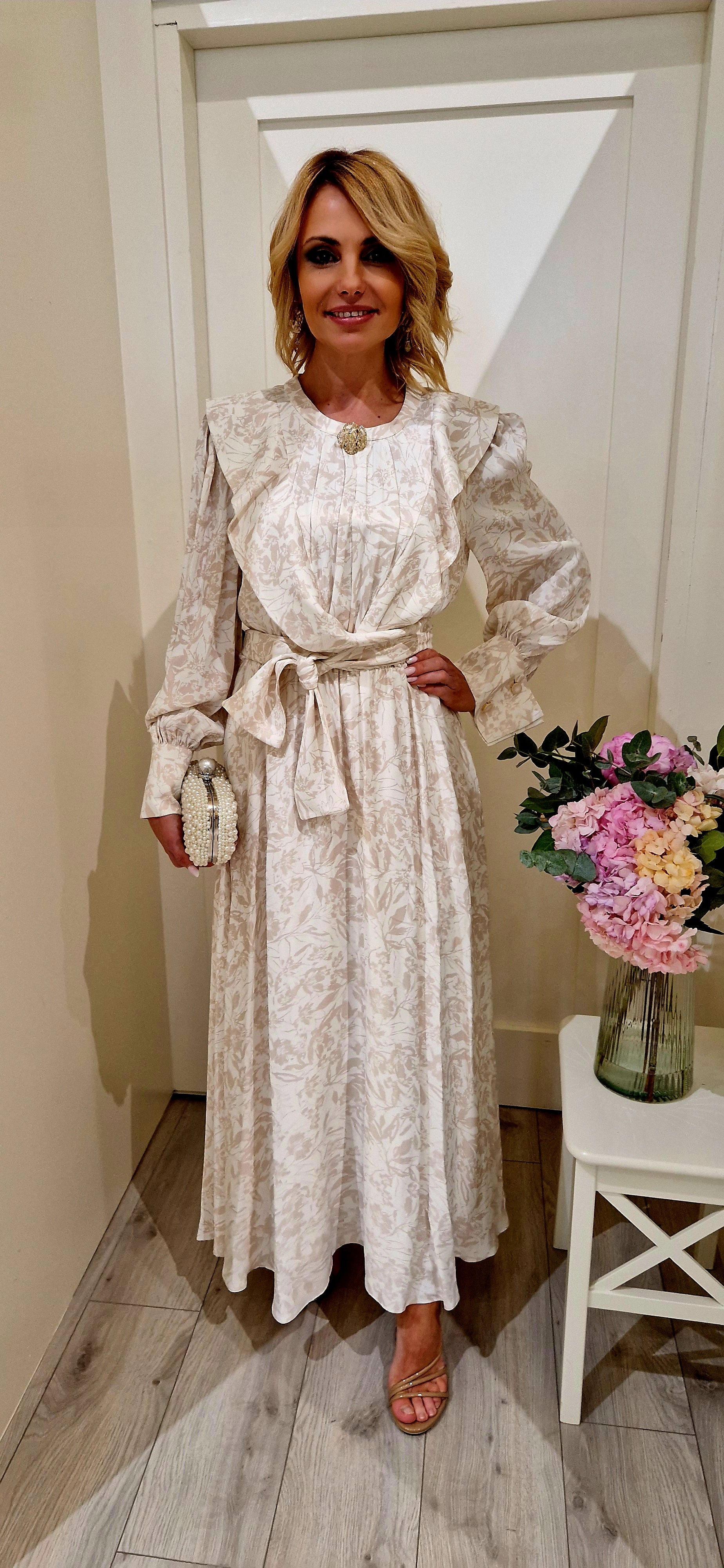 This Cream And Gold Ruffle Midi Dress features a flattering v-neck with a beautiful brooch and gold cream buttons on the sleeves. The elastic waist creates a stylish silhouette, while the full lining ensures comfort and quality. Made from 100% polyester, it is also easy to care for with a 30 degree wash.