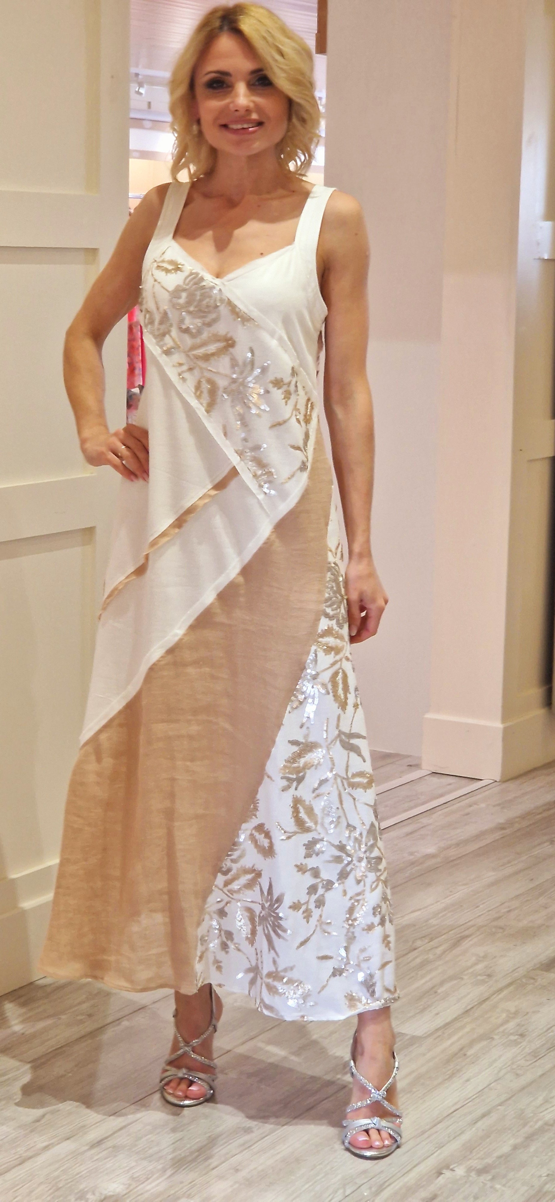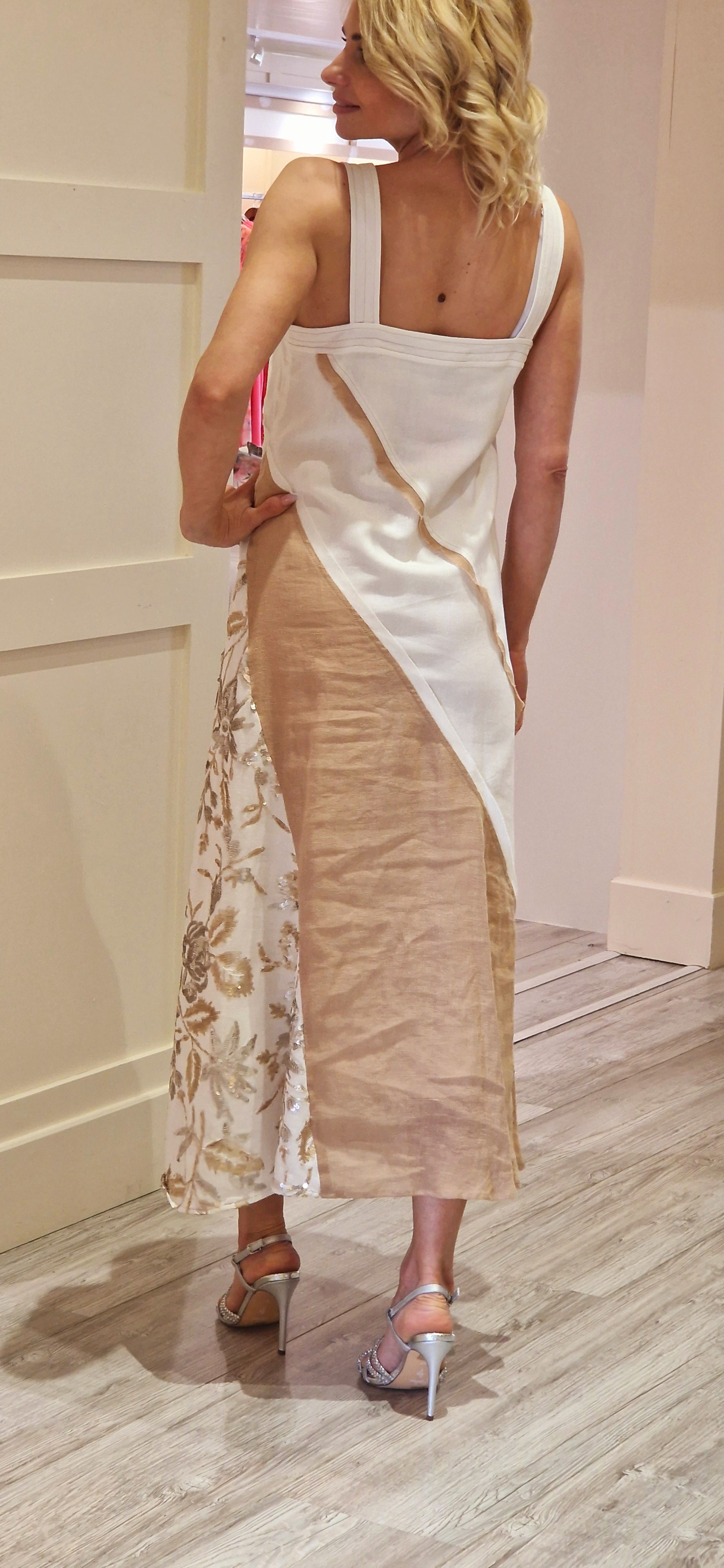 This elegant Cream And Gold Dress is perfect for any special occasion. The sleeveless design and beautiful details on the front make for a stunning look. The dress is fully lined and crafted from a luxurious blend of 45% rayon, 37% linen, 9% cotton, and 9% ramie, ensuring both comfort and style. Complete your wardrobe with this timeless piece.