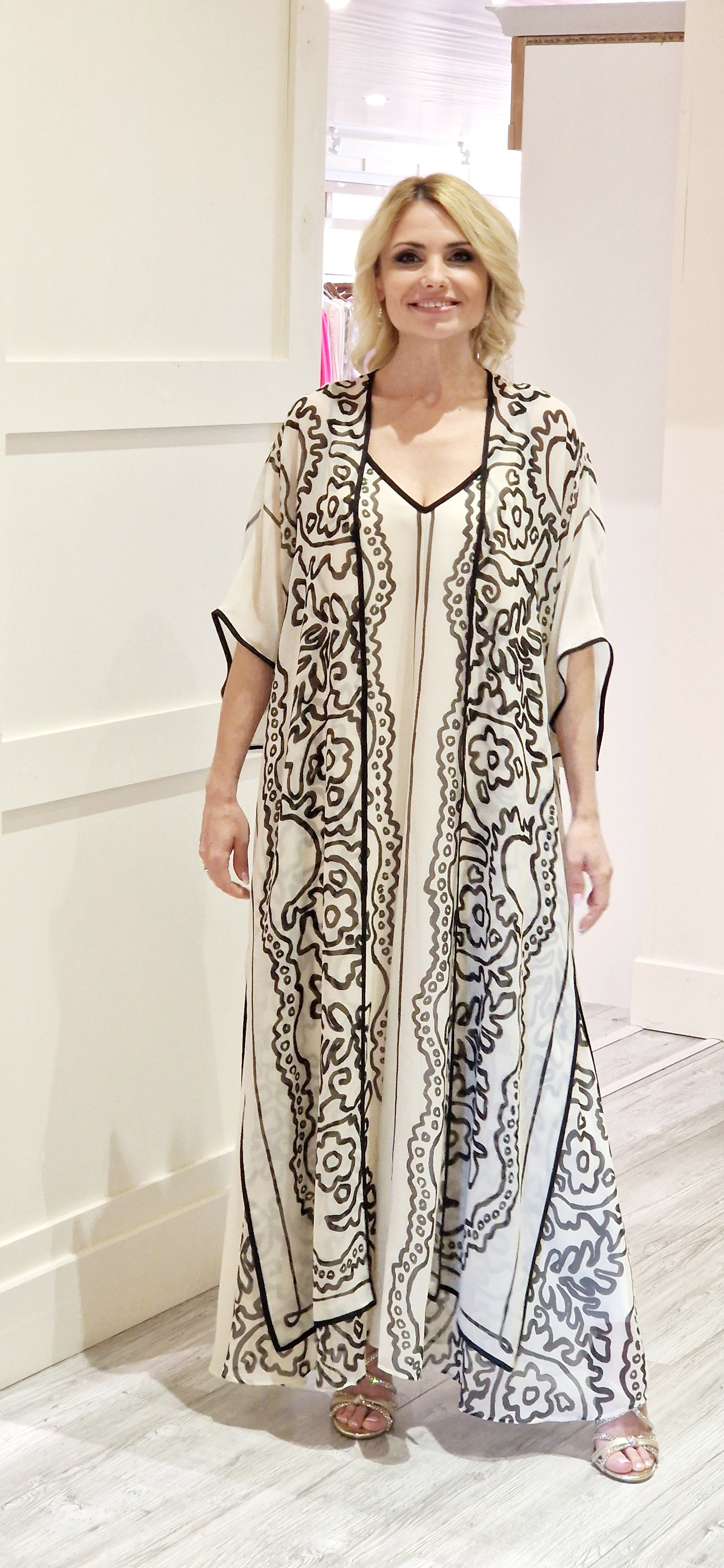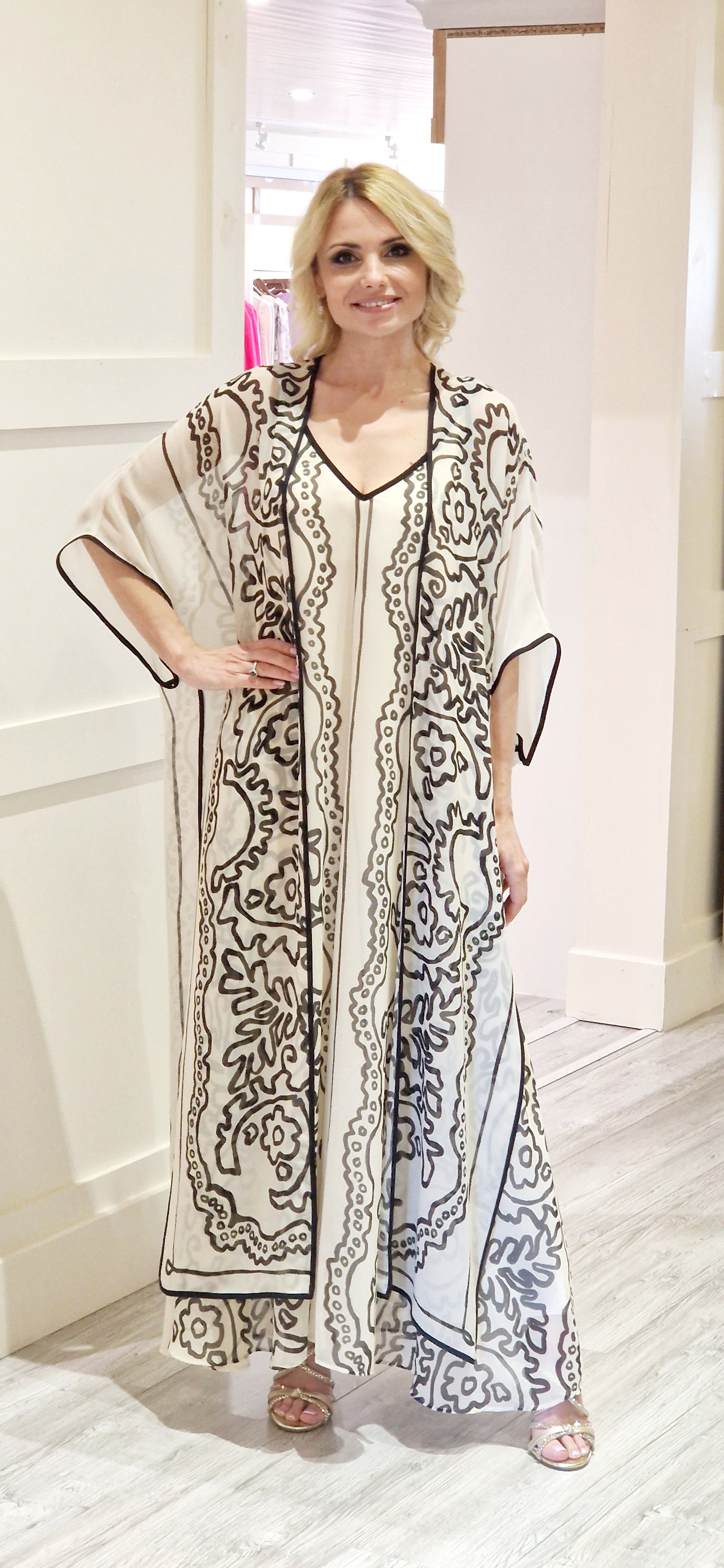 This sleeveless v-neck dress features a cream and black color combination, giving it a chic and sophisticated look. Made with 100% polyester, it is fully lined for added comfort. The matching kimono adds versatility to your wardrobe, making it perfect for any occasion. Washable at 30 degrees for easy maintenance.