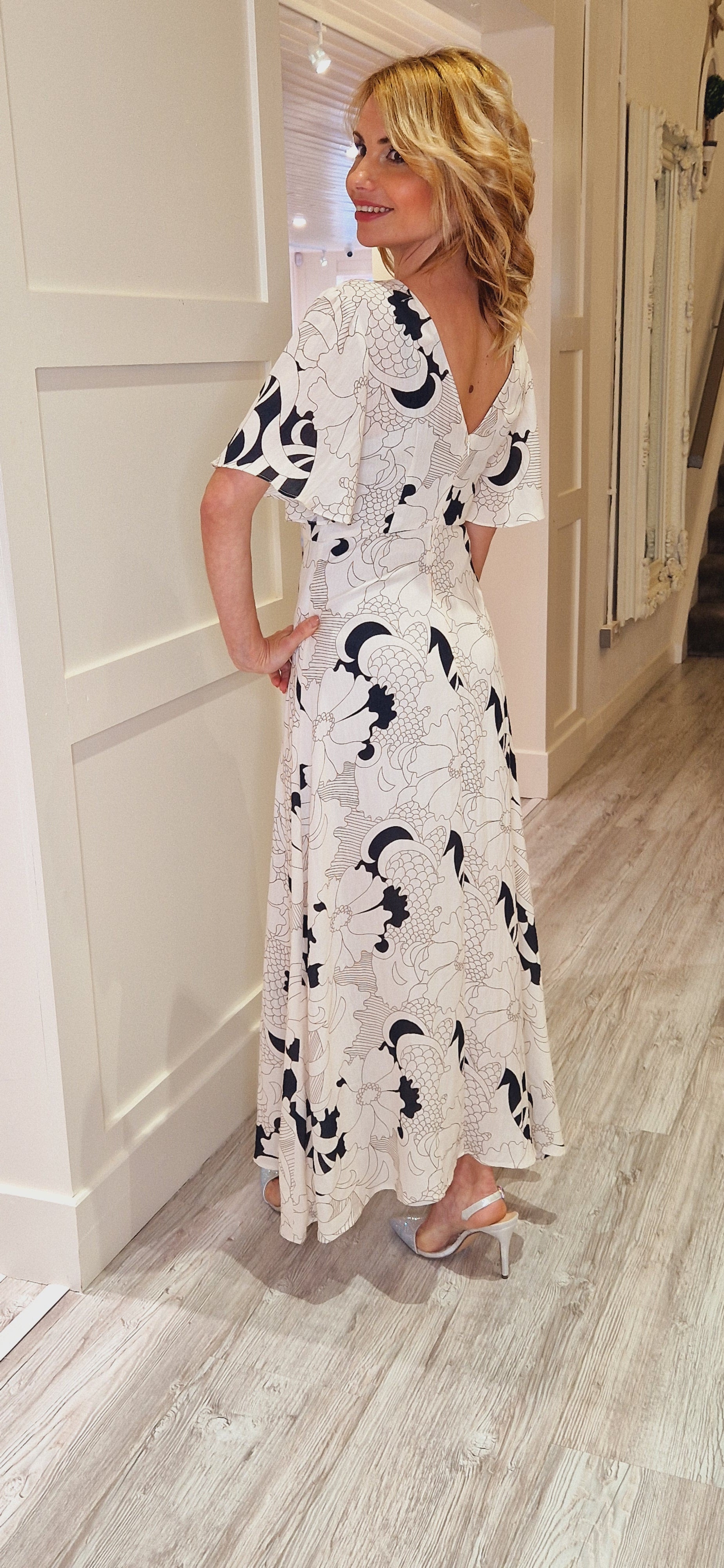 - Flaunt your sophisticated style with our Cream Flower Maxi Dress. Featuring a round neck, short wide sleeves, and an elegant a-line silhouette, this dress is both comfortable and chic. The black and cream flower print adds a touch of femininity, while the back zip allows for easy wear. Perfect for any occasion.