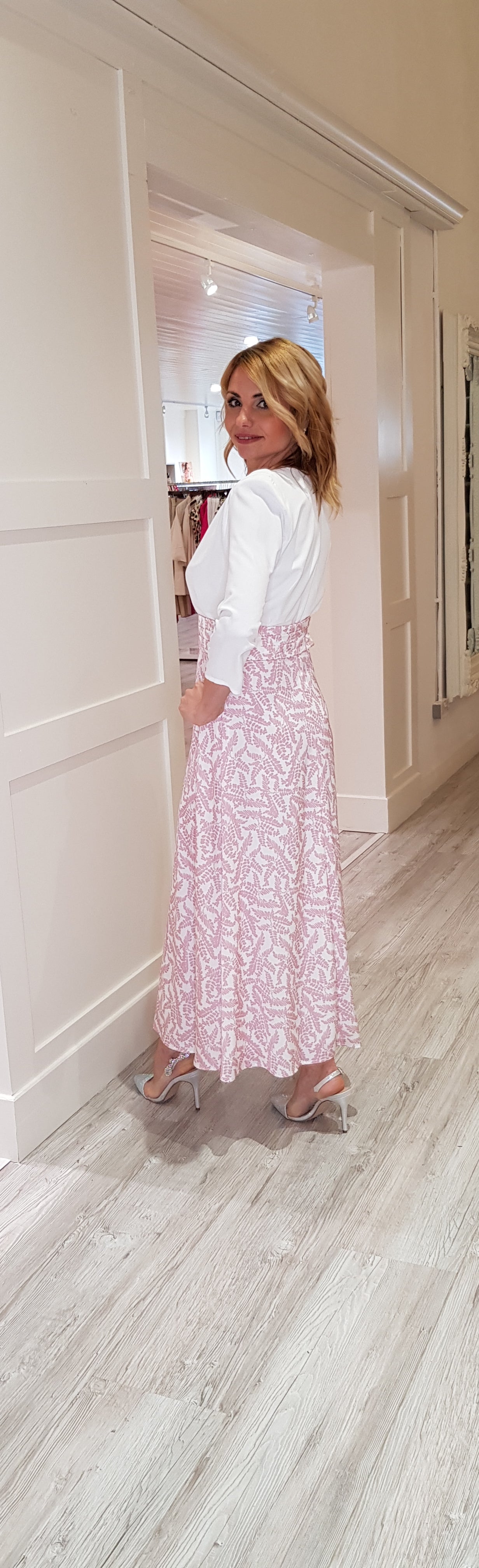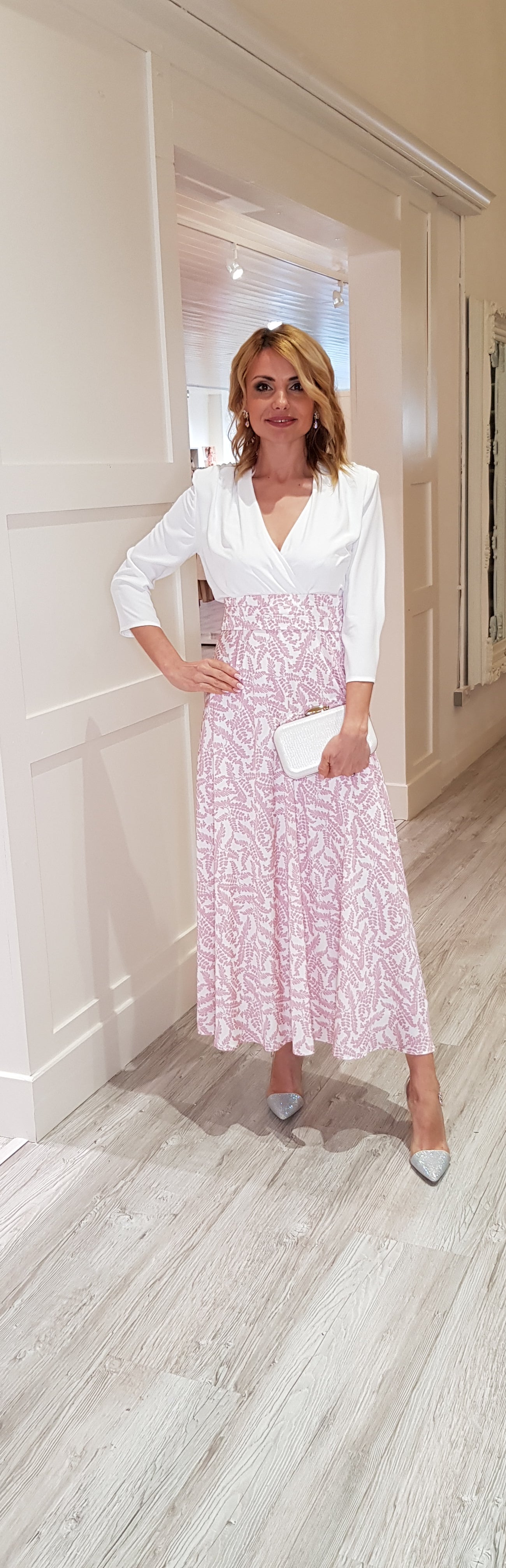 This cream midi dress features a flattering V-neckline and 3/4 sleeves. The matching belt accentuates your waist, while the back zip provides a seamless fit. The flowing skirt is lined and showcases a beautiful pink flower print, adding a touch of femininity to your look.