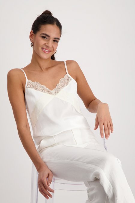 - The elegant spaghetti satin top with lace gives every outfit a feminine touch.