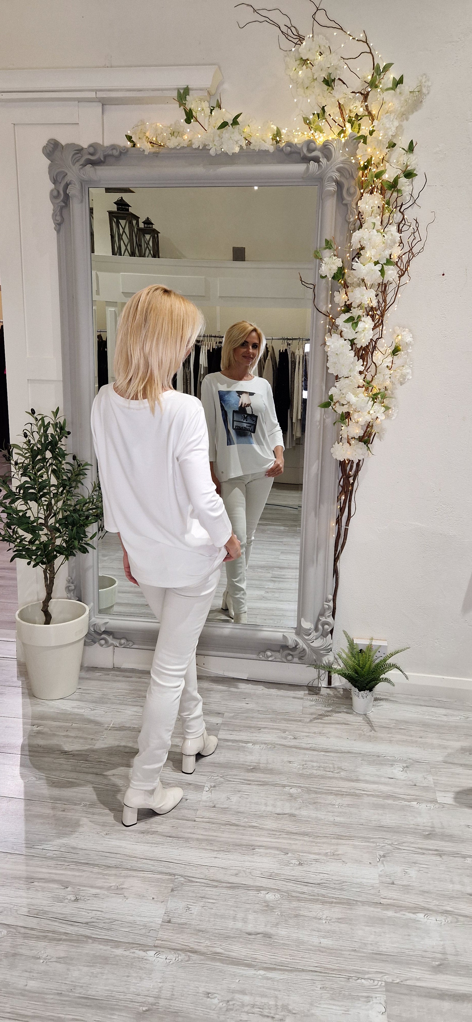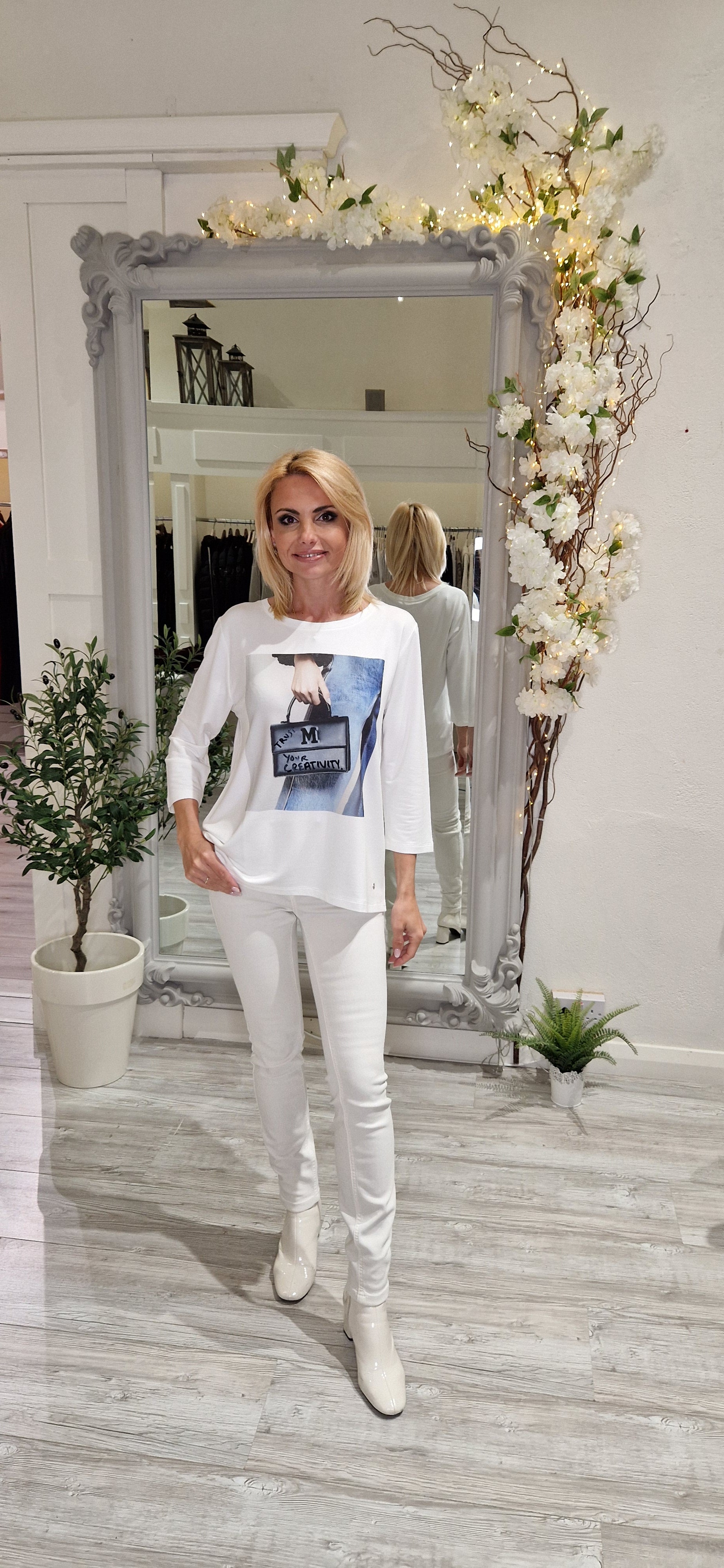 This cream top features a delicate blue print and a classic round neckline, complemented by comfortable 3/4 sleeves. Crafted from a blend of 45% viscose, 45% modal, and 10% elastane, it offers a soft, breathable, and slightly stretchy fit. Designed for easy care, it is machine washable at 30 degrees, making it a practical yet stylish addition to your wardrobe.