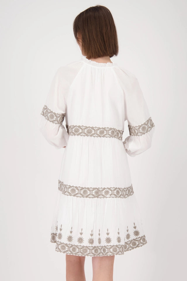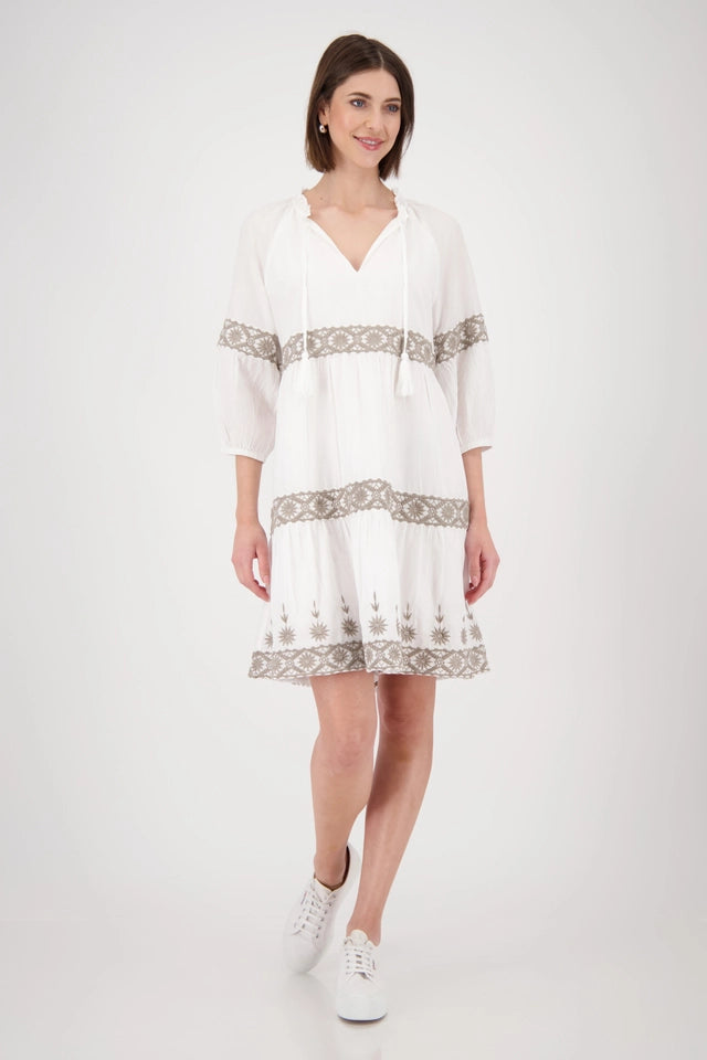 - The airy dress with embroidery impresses with its round neckline with gathers and slit.