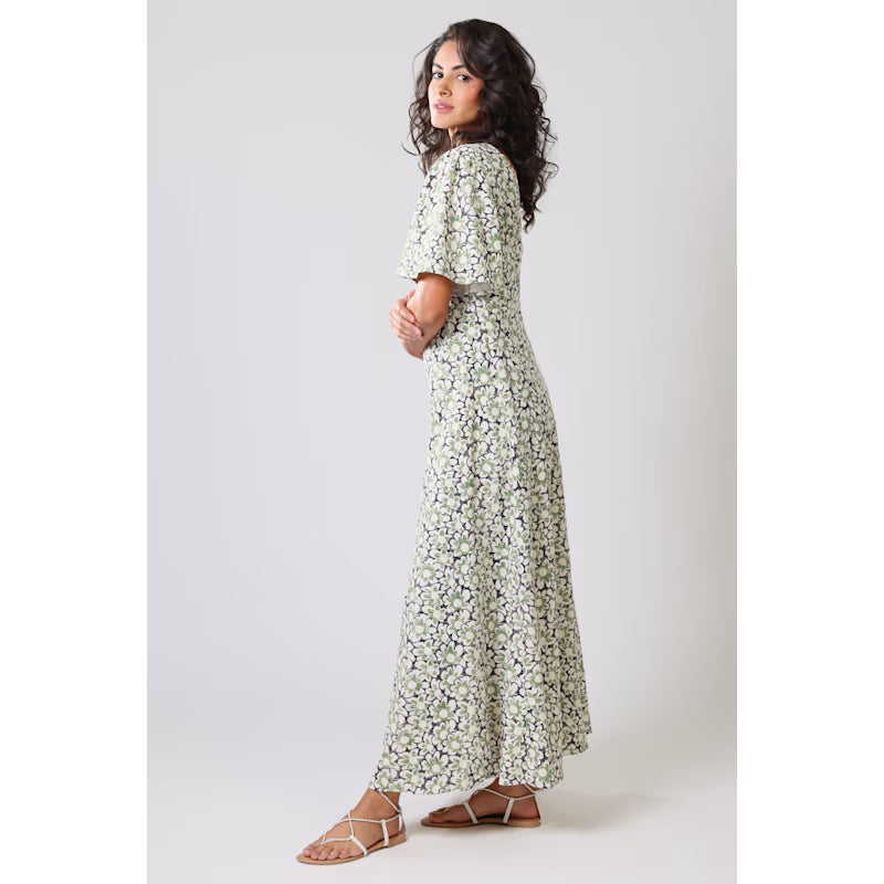 Our most-loved Rene Dress returns in a beautiful blue, green, and white ditsy floral print. This stunning boho-style maxi dress features elbow-length trumpet sleeves and a subtly cinched waist for a flattering silhouette. Comfortable and breezy in this 100% cotton fabric. Simply pair with heels for an elegant Spring wedding guest outfit.
