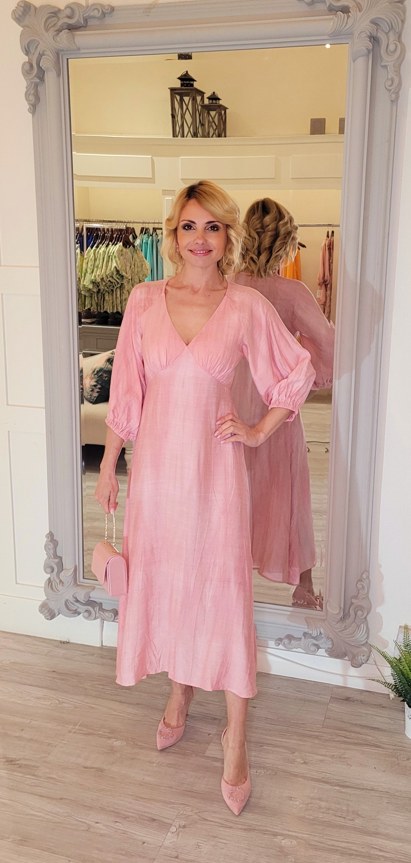 Expertly crafted and designed, the Gloria Pink Dress exudes elegance and sophistication. Its V-neckline and ¾ sleeves with elastic cuffs create a flattering silhouette, while the back zip adds a touch of convenience. The A-line style adds a modern twist to this classic piece. Perfect for any formal or semi-formal occasion.
