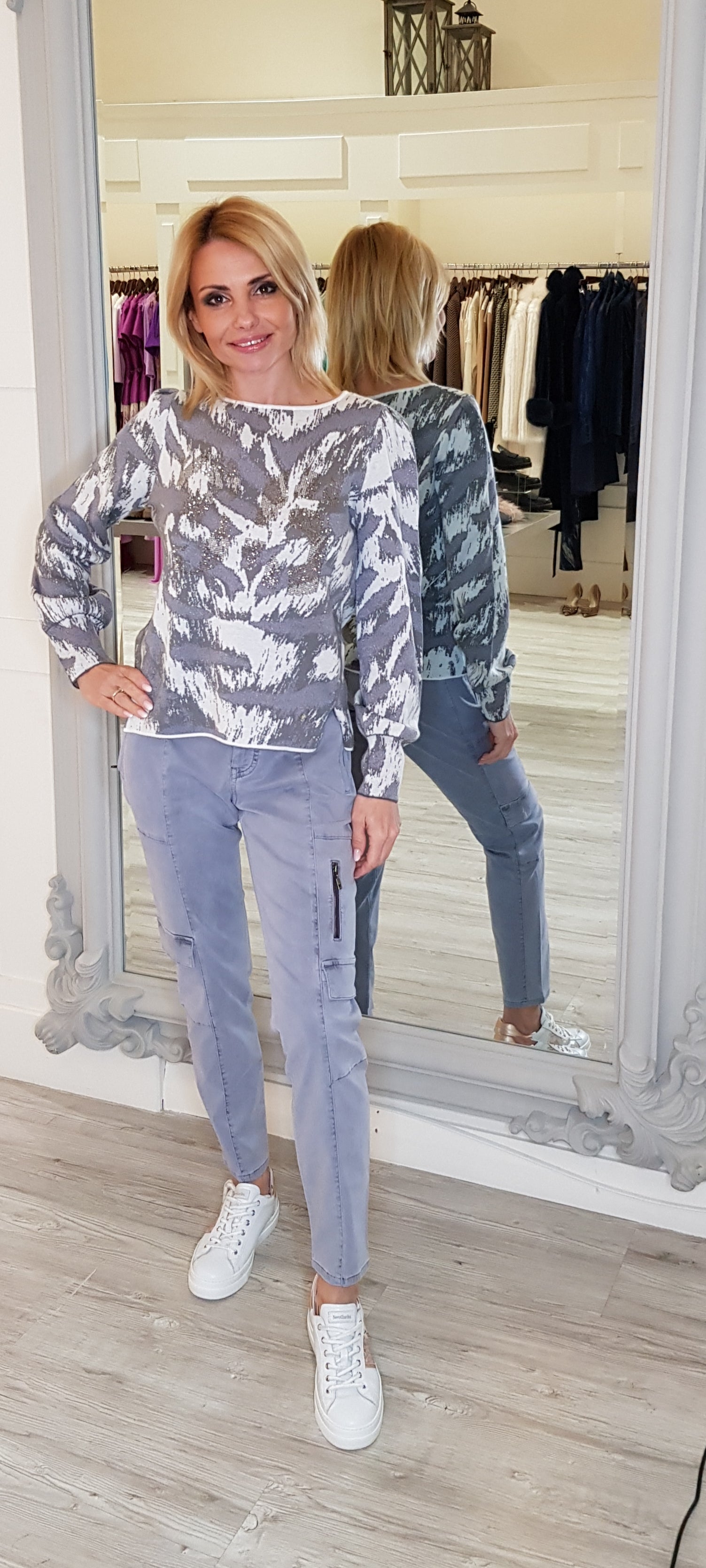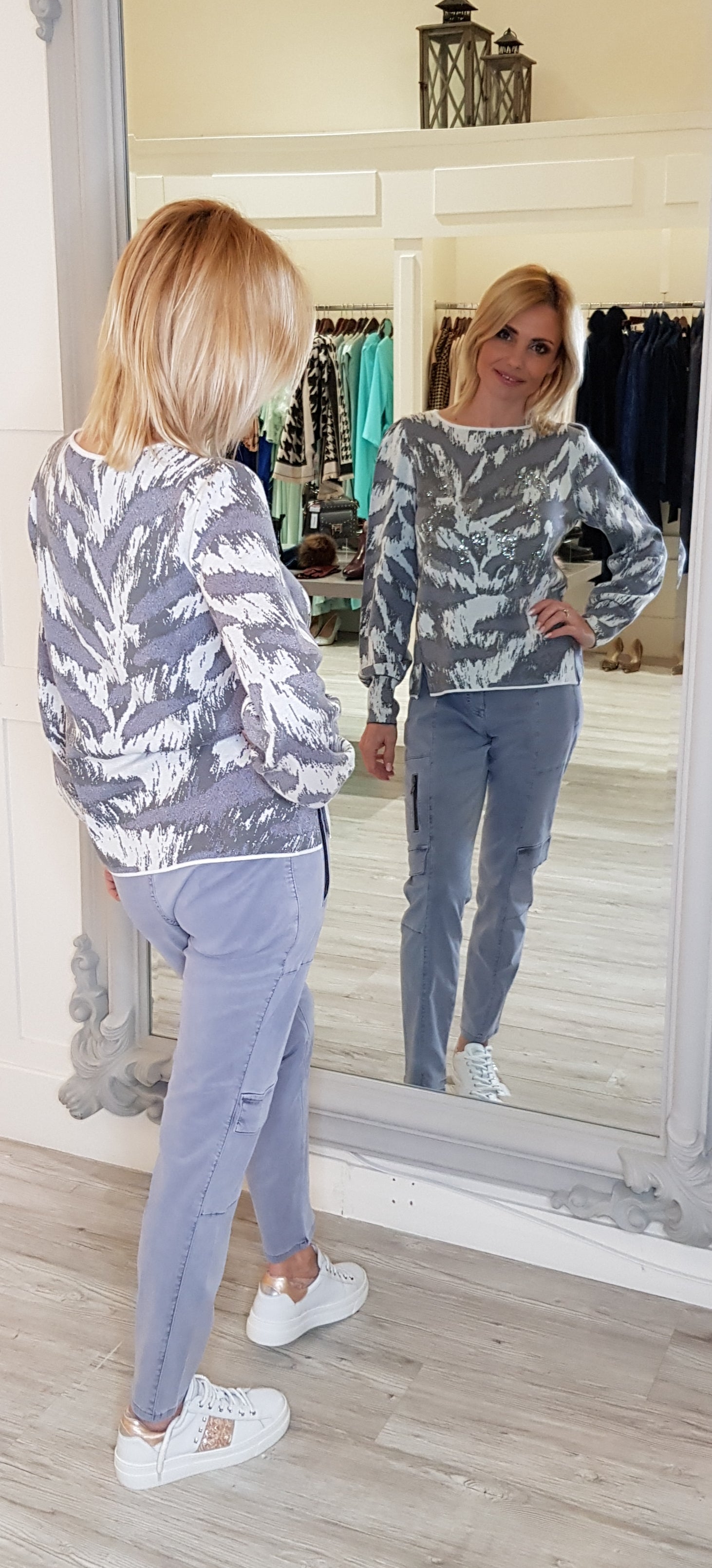 This grey and lilac knit jumper features a round neck and long sleeves with elastic cuffs for comfort. Sparkly details on the front add a touch of glamour, while the two side slits allow for easy movement. Complete the look by pairing it with our matching trousers and jackets for a coordinated and stylish outfit.
