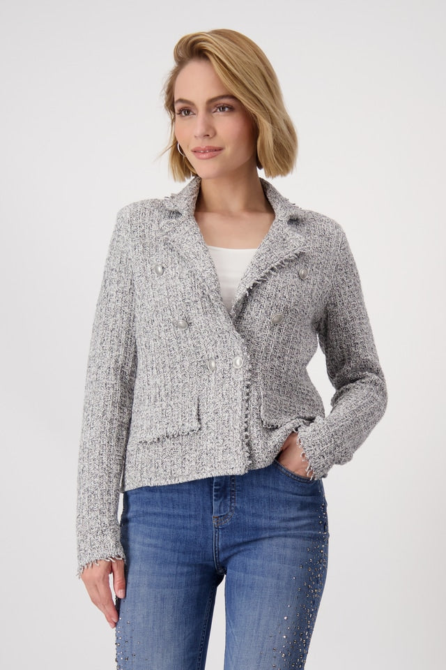 Expertly crafted from a high-quality cotton blend, this Grey Knit Cardigan boasts a luxurious glittering lurex tweed quality. Its fitted shape and lapel collar with fringes exude sophistication. Complete with a button placket, decorative buttons, and faux flap pockets with fringes, this cardigan is sure to make a statement.