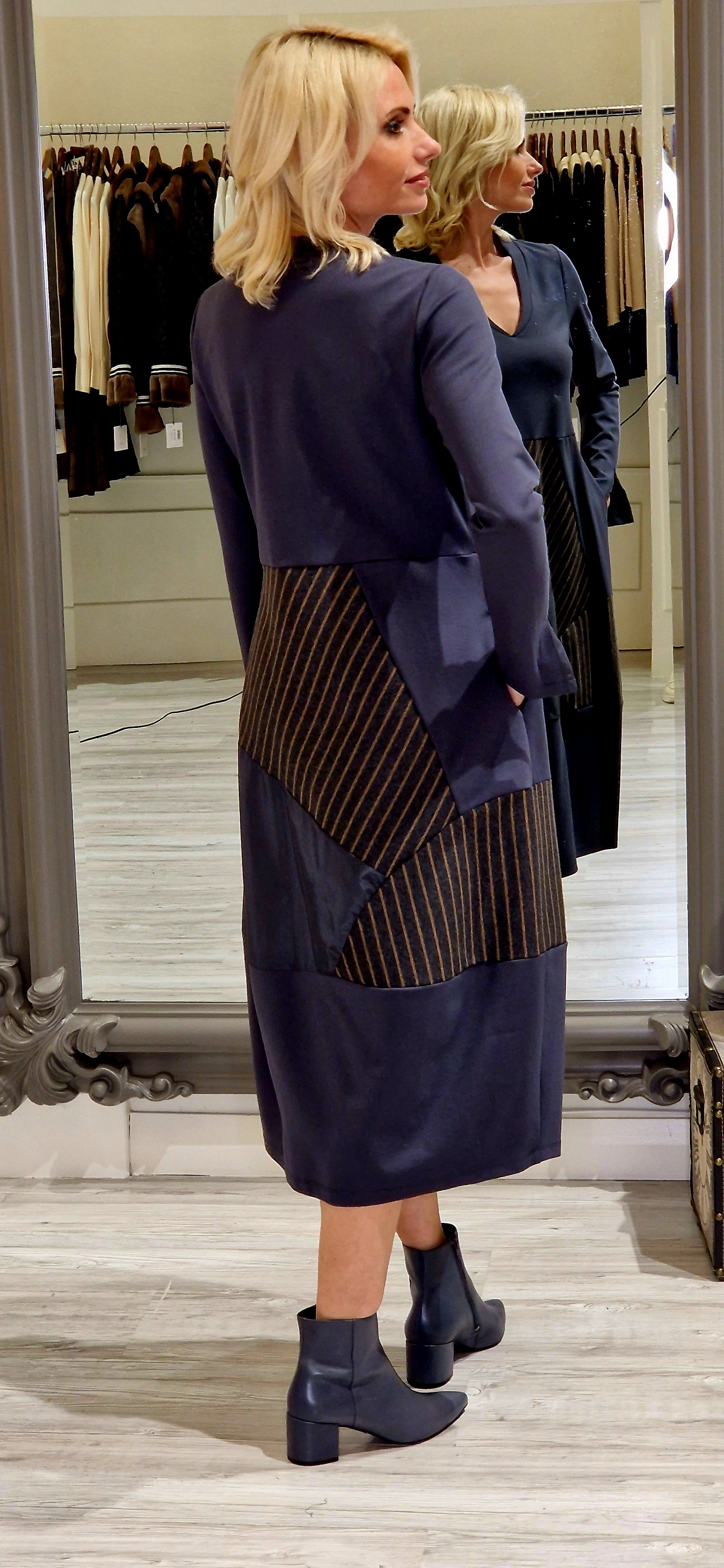 Grey pinstripe dress features a mixed-fabric design and a flattering V-neckline, combining classic tailoring with modern texture.