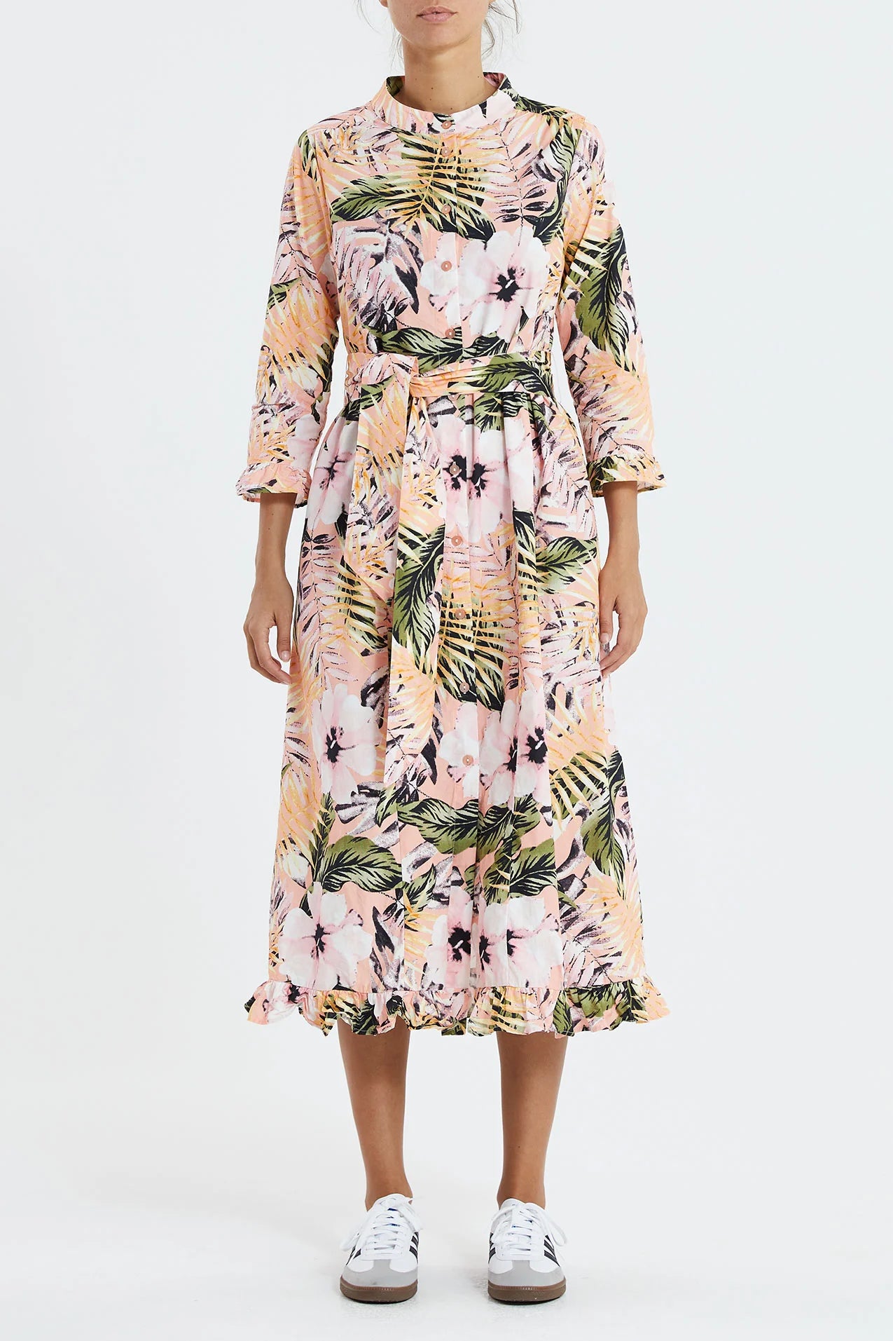 This classic and long dress is an expertly crafted design made of 100% cotton. It features long sleeves, a round neckline, a front pocket, frills, a waistband on the back for enhanced comfort. With its stunning print and quality craftsmanship, it's a must-have for any wardrobe.