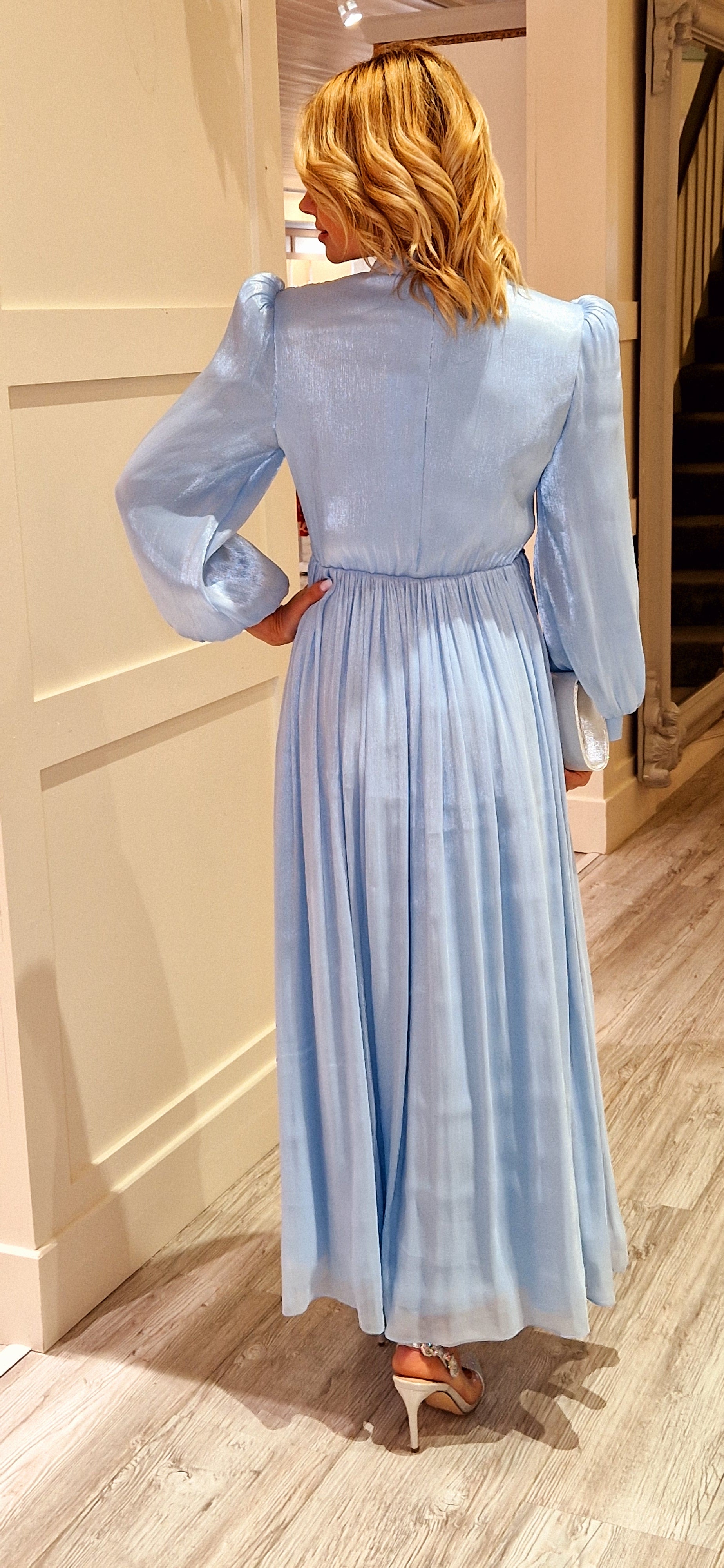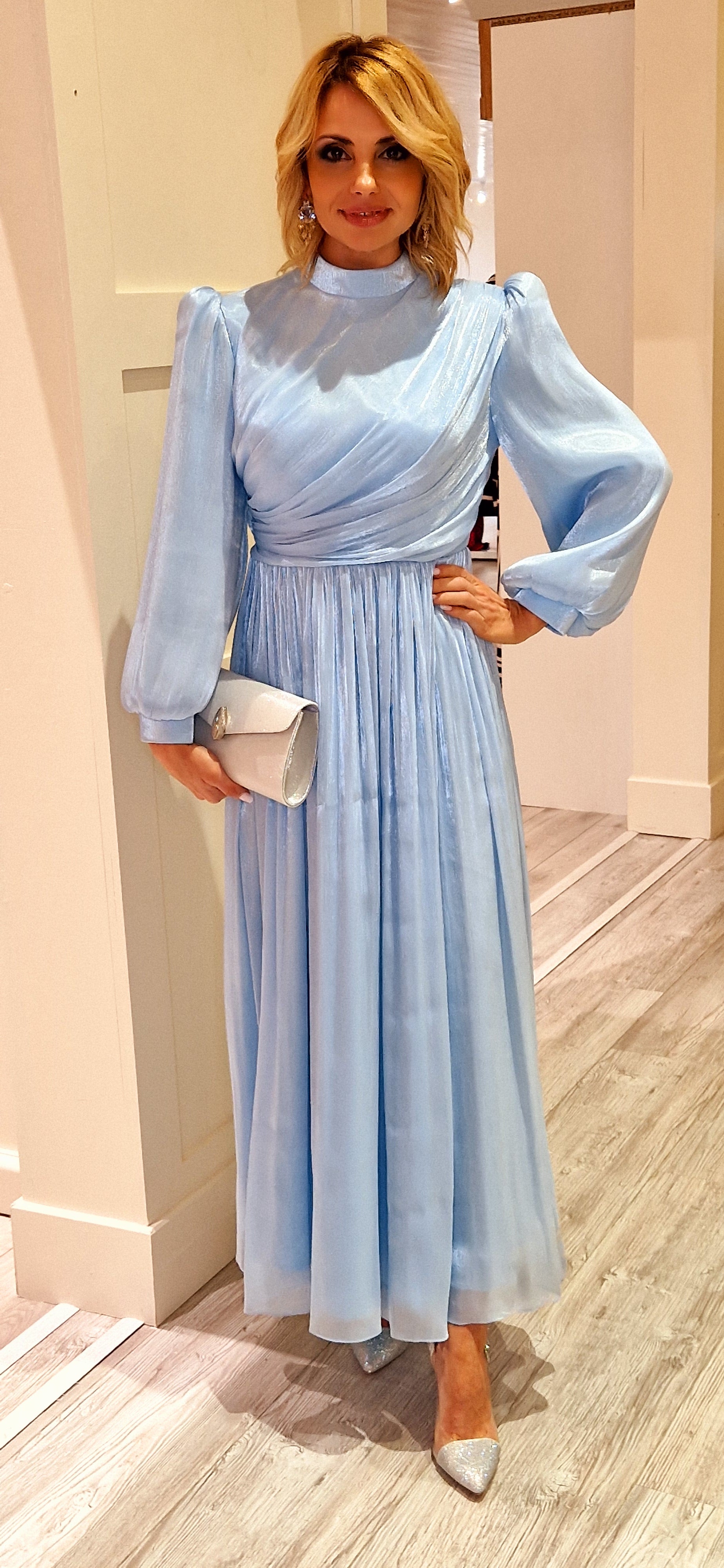 Expertly crafted from 100% polyester, this ice blue midi dress features a round neck, long sleeves, and a zip closure on the back, all designed for a comfortable and flattering fit. The elastic waist and full lining add extra convenience to this stylish piece. Machine wash at 30 degrees for easy maintenance.