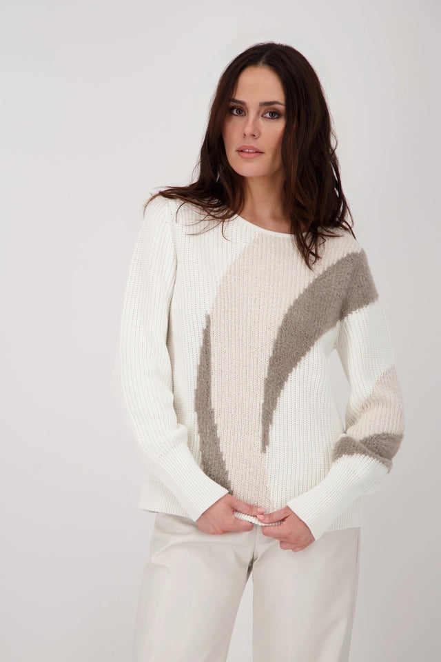 This off-white jumper combines a high-quality cotton blend with glittering Lurex for a subtle shimmer and a soft, fluffy feel. Featuring an intricate inlay pattern, it offers a sophisticated texture and design. The slightly dropped shoulders and round neck create a relaxed yet refined silhouette, complemented by long sleeves with neatly finished hems. With a length of 60 cm for size 38, this jumper balances comfort and style effortlessly. Ideal for layering or wearing alone, it provides both elegance and everyday wearability.