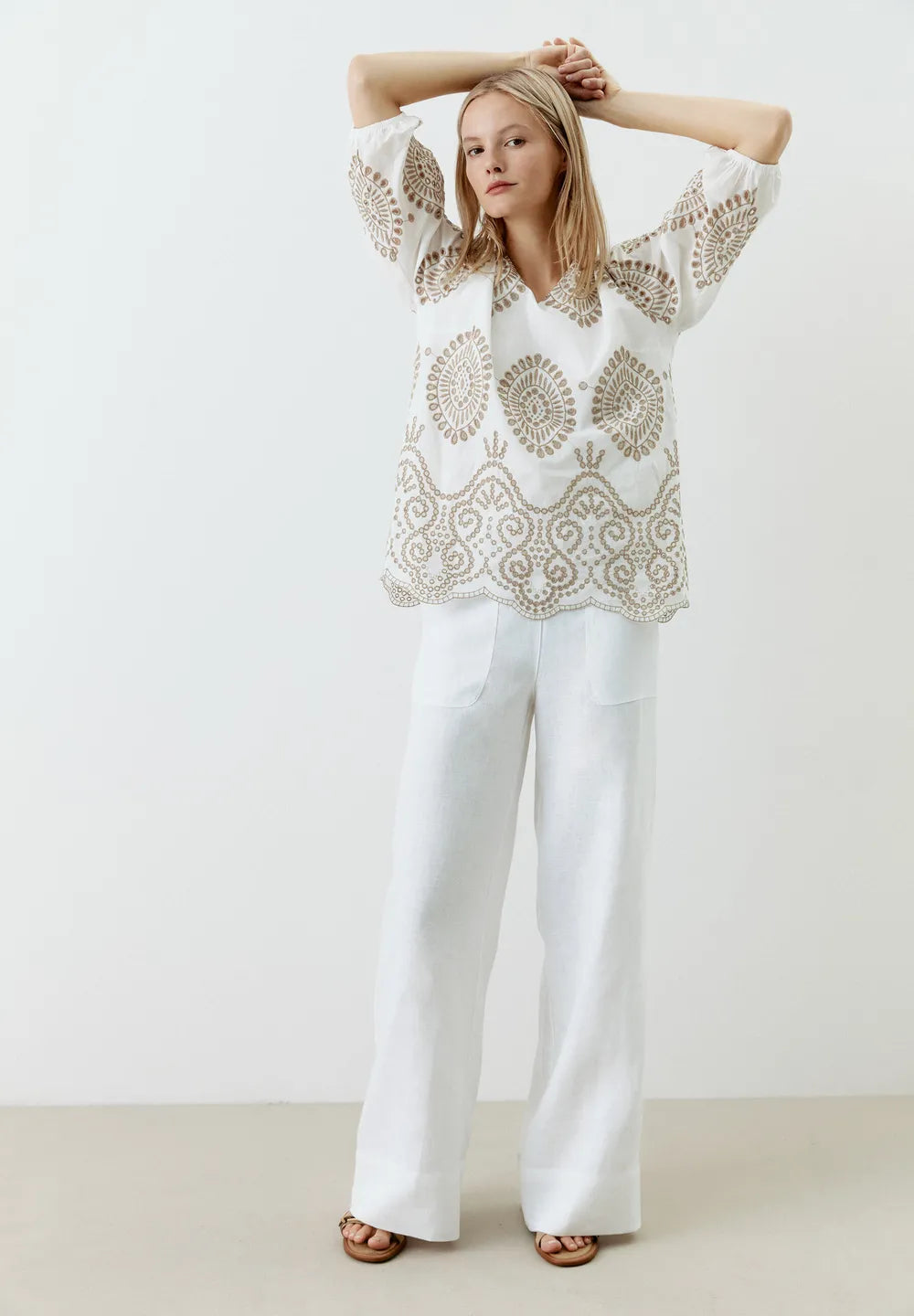 The airy tunic blouse made of two-tone eyelet lace in white/beige looks equally good with summer shorts or casual jeans.