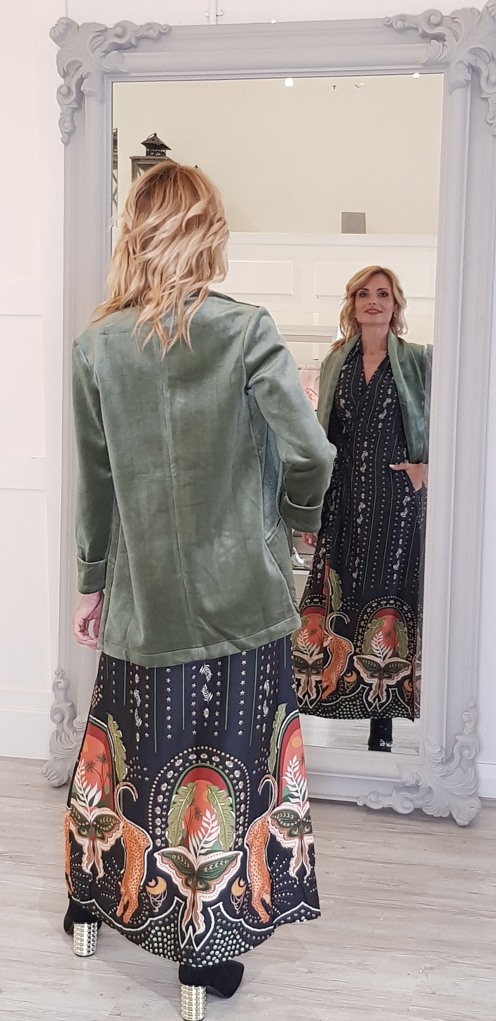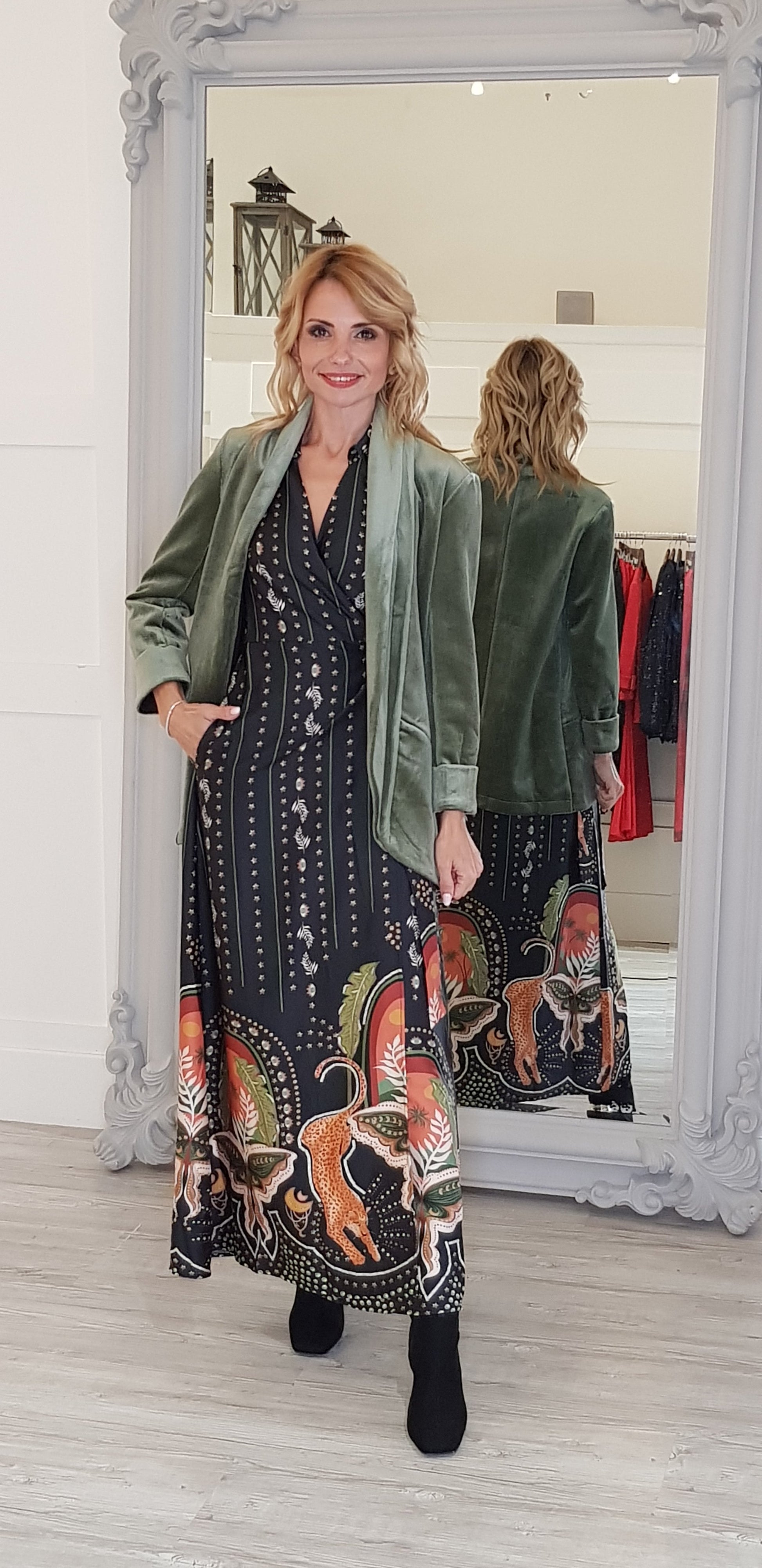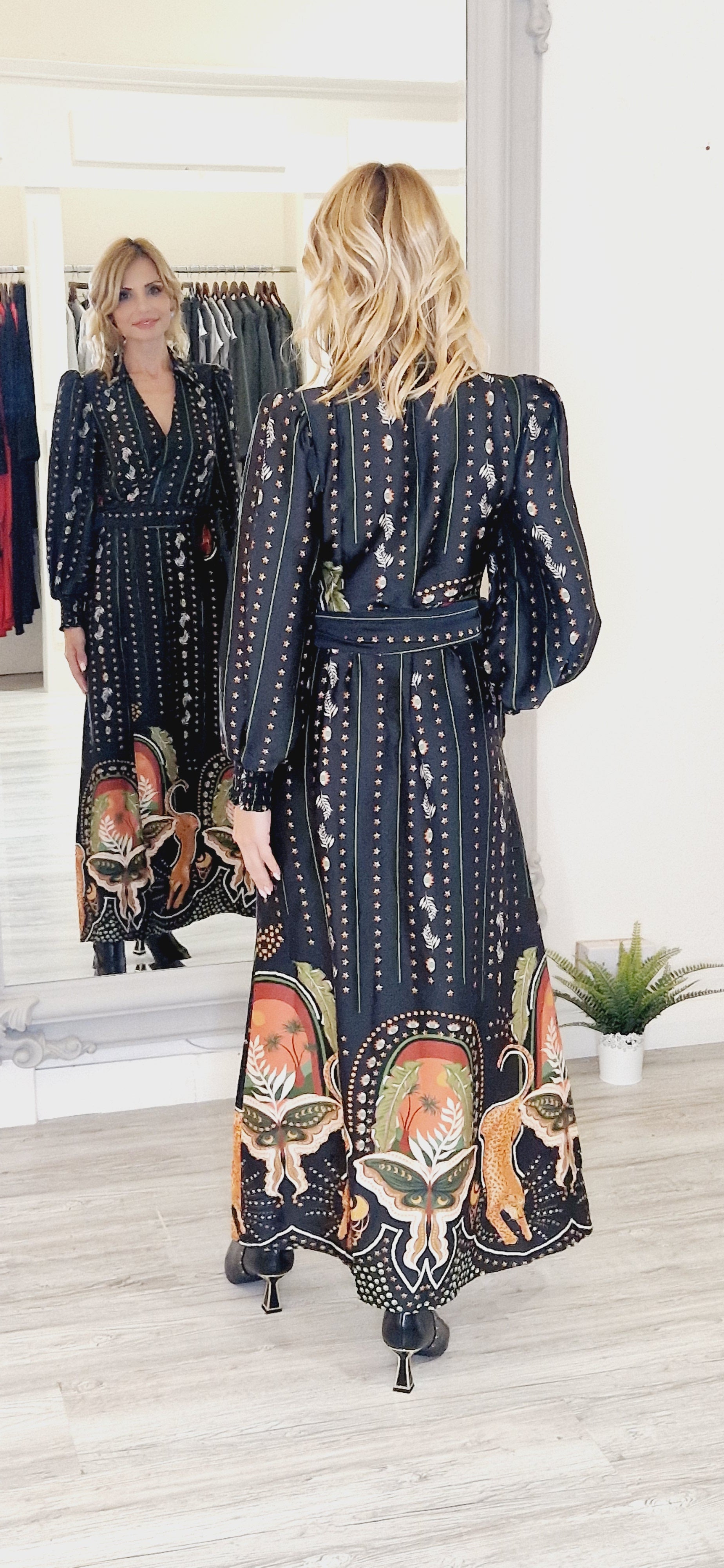 Expertly designed with a neck collar and a wrap style, the Loretta Black Maxi Dress is a must-have for any fashion-forward individual. Its long sleeves with elastic cuffs ensure a comfortable fit, while the vibrant green and orange flower print adds a touch of elegance to any occasion. Experience the perfect blend of style and comfort with this stunning dress.