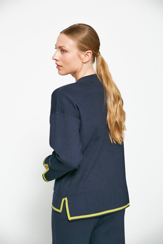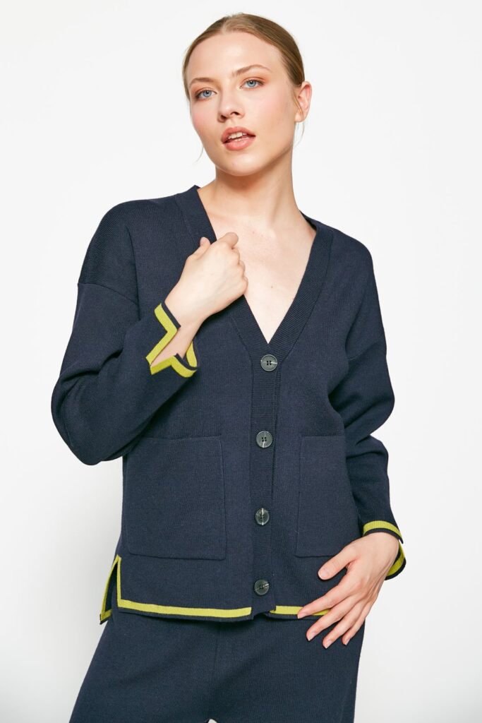 This sleeved cardigan jacket features a contrast color detail at the bottom and cuffs, adding a stylish touch to your outfit. With a V-neckline and front button closure, it's easy to layer over any top. Plus, the front pockets add convenience. Elevate your wardrobe with this navy knit cardigan.