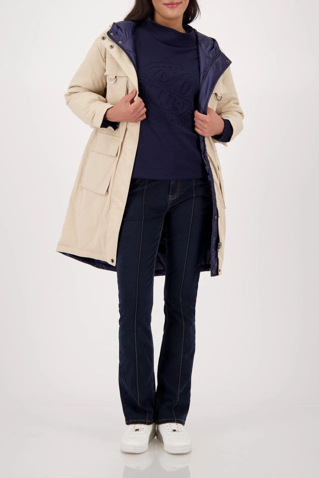 Crafted from a soft, stretchy modal blend, this navy sweatshirt offers exceptional comfort and fit. Featuring a modern 3D print, slightly dropped shoulders, and a stand-up collar, it blends style with function. The long sleeves with wide hems provide a relaxed yet refined silhouette. Sized to fit true to form, size 38 measures 58 cm in length, ideal for layering or standalone wear.This stylish 3D print sweatshirt delights with stretchy material, a soft texture, puff sleeves, and a fashionable stand-up collar.